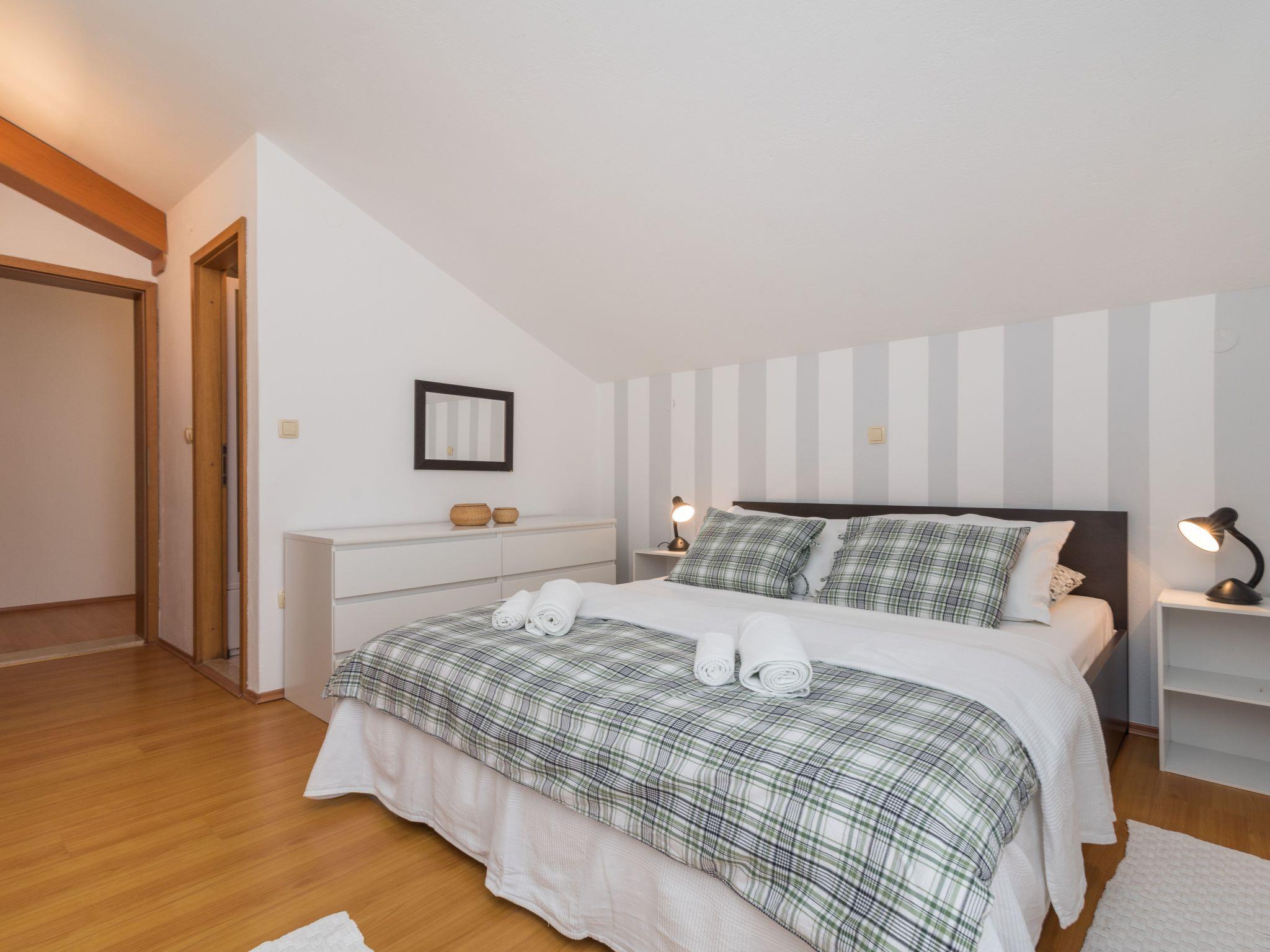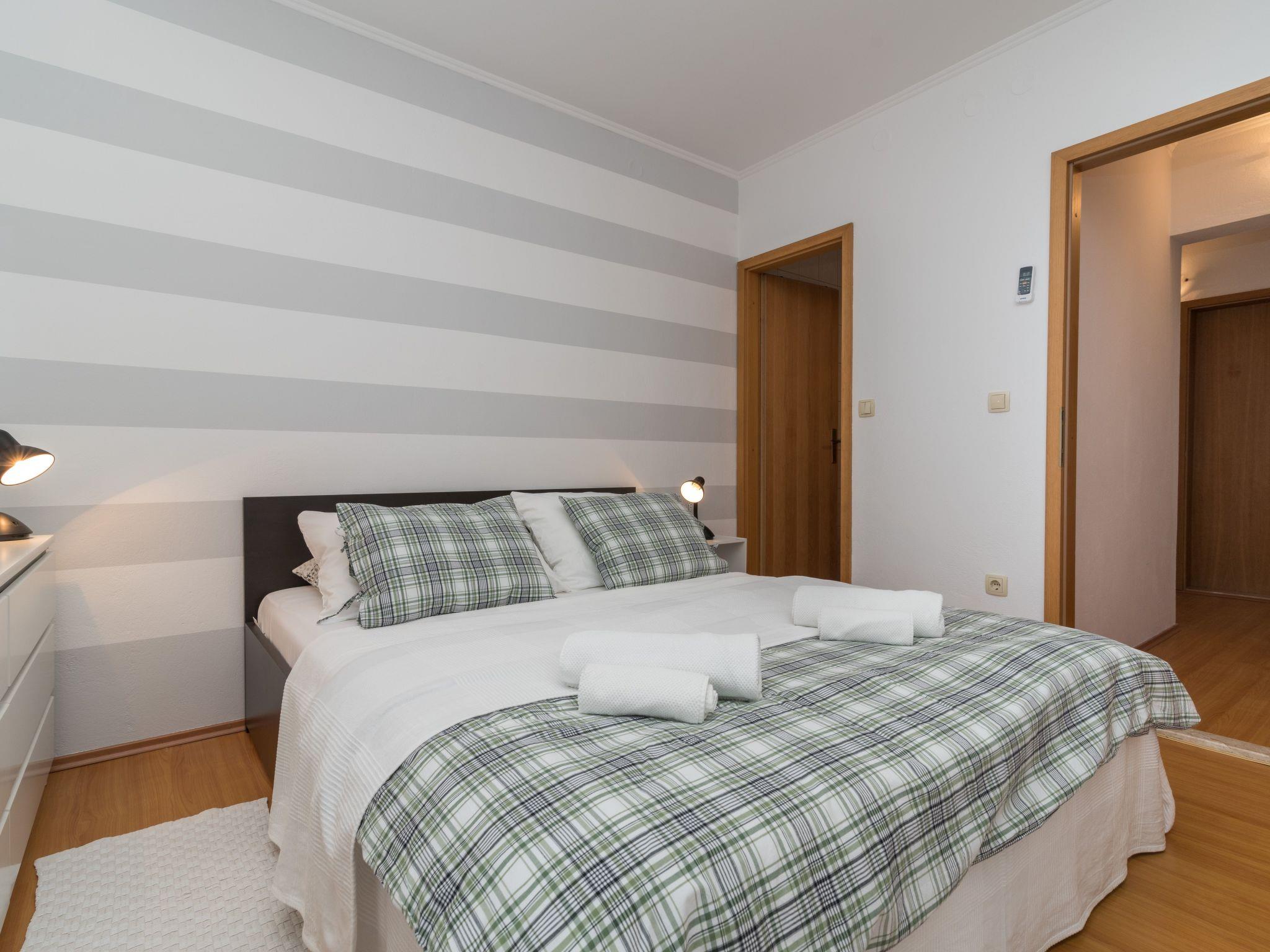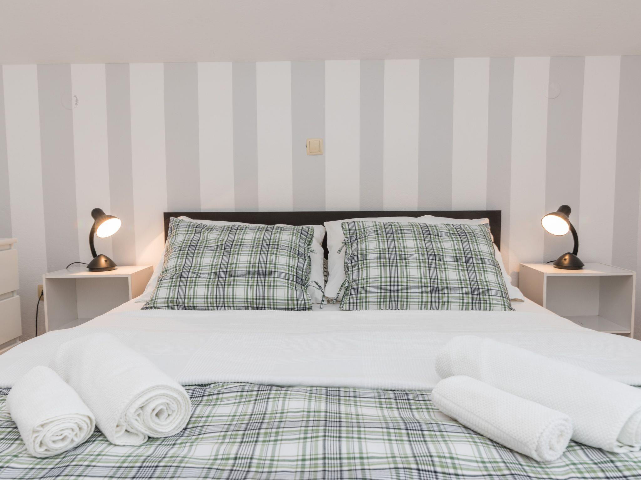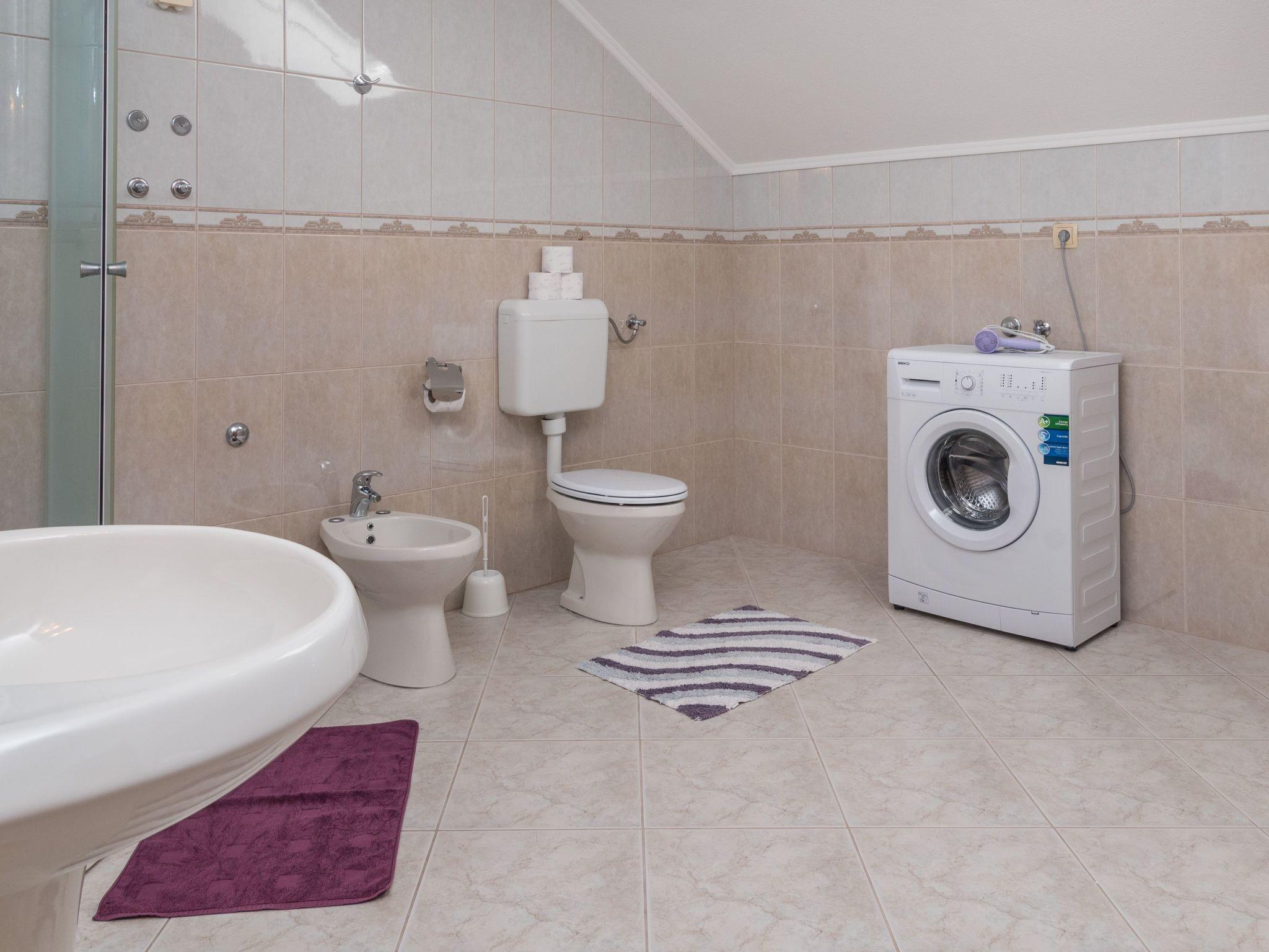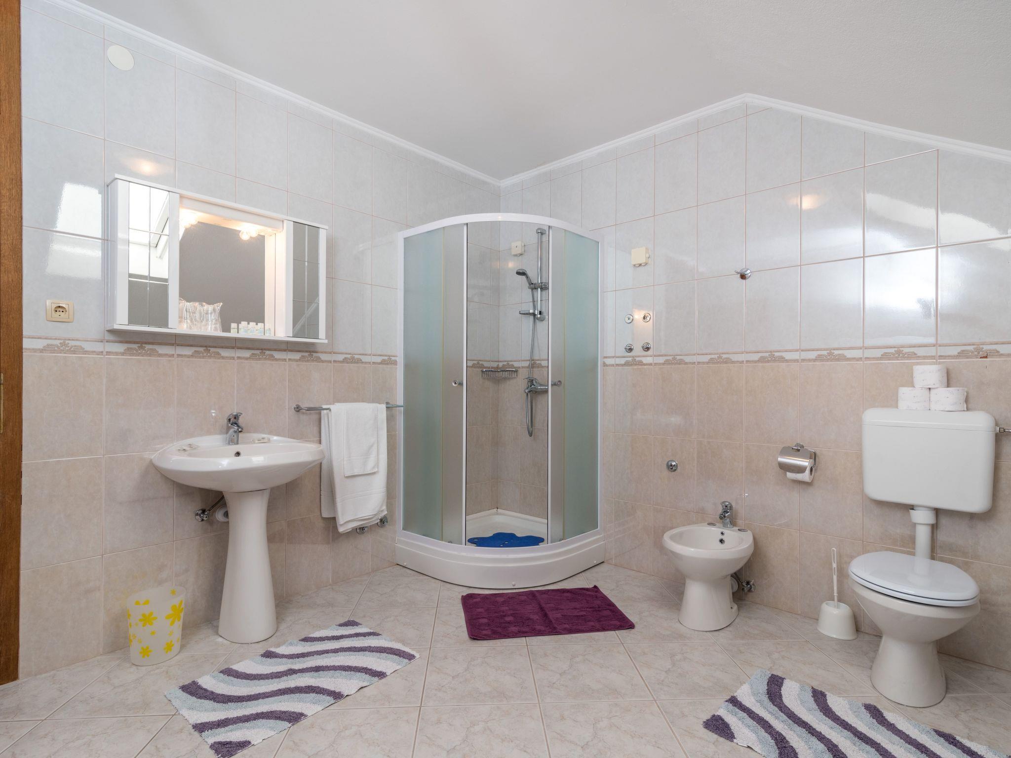 It features a seating area with flat-screen TV, a kitchen, dinning area, living room, 3 bedrooms with double bed, 3 bathrooms with shower, guest toilette and terrace with sea view. Sofa bed in the living room can fit 2 persons. Kitchen is fully equipped: fridge with freezer compartment, kitchenette, stove, oven, toaster, microwave, electric kettle, filter coffee machine, etc. There is a safe in the apartment as well. Bed linen, pillows, towels and toiletries are included in the price. Travel beds for babies and high chairs are available free of charge. There is a fully equipped shared laundry room on the ground floor of the building and its use is also free of charge. The building is completely covered with free wireless Internet.