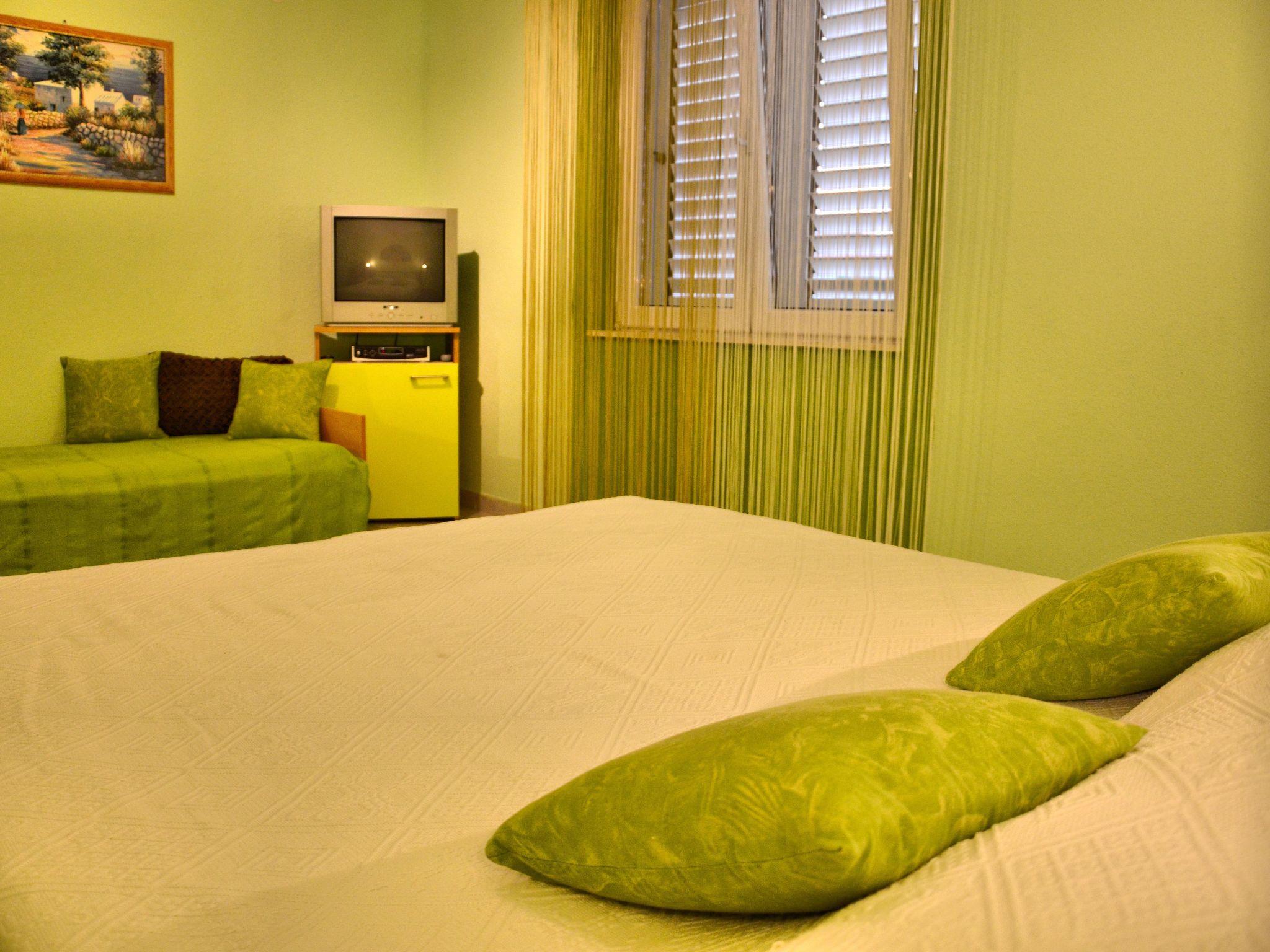 Villa Mediteran is situated near the beach Bok in the village of Okrug Gornji on the Island of Ciovo close to Trogir. On offer we have one of four apartments on the 2nd floor with a terrace (including electric grill) for up to 5 people. It contains two separate bedrooms with double beds and one single bed, kitchen, dining room and bathroom with shower. The decor is cozy and Mediterranean, so that makes everyone feel comfortable with us. The south-facing roof terrace offers a wonderful view of the sea and the neighboring islands of Solta, Brac and Hvar and is available to all guests at your leisure.