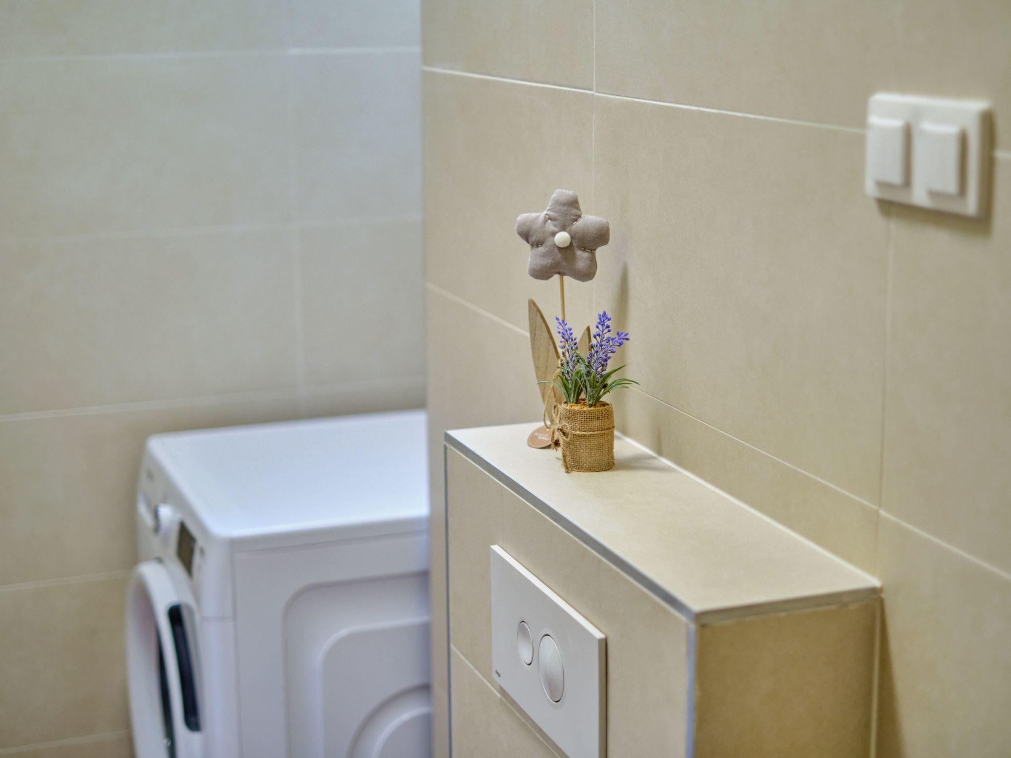 Inside, this holiday home boasts two well-appointed bedrooms and two bathrooms, one equipped with a shower and the other with a bathtub, catering to your comfort and convenience. The living space is enhanced by the presence of air conditioning throughout, ensuring a cool and pleasant environment no matter the weather outside. Essential amenities such as a washing machine exclusively for guests’ use, an induction hob, a filter coffee machine, dishwasher, and an electric kettle make this home away from home both practical and welcoming.