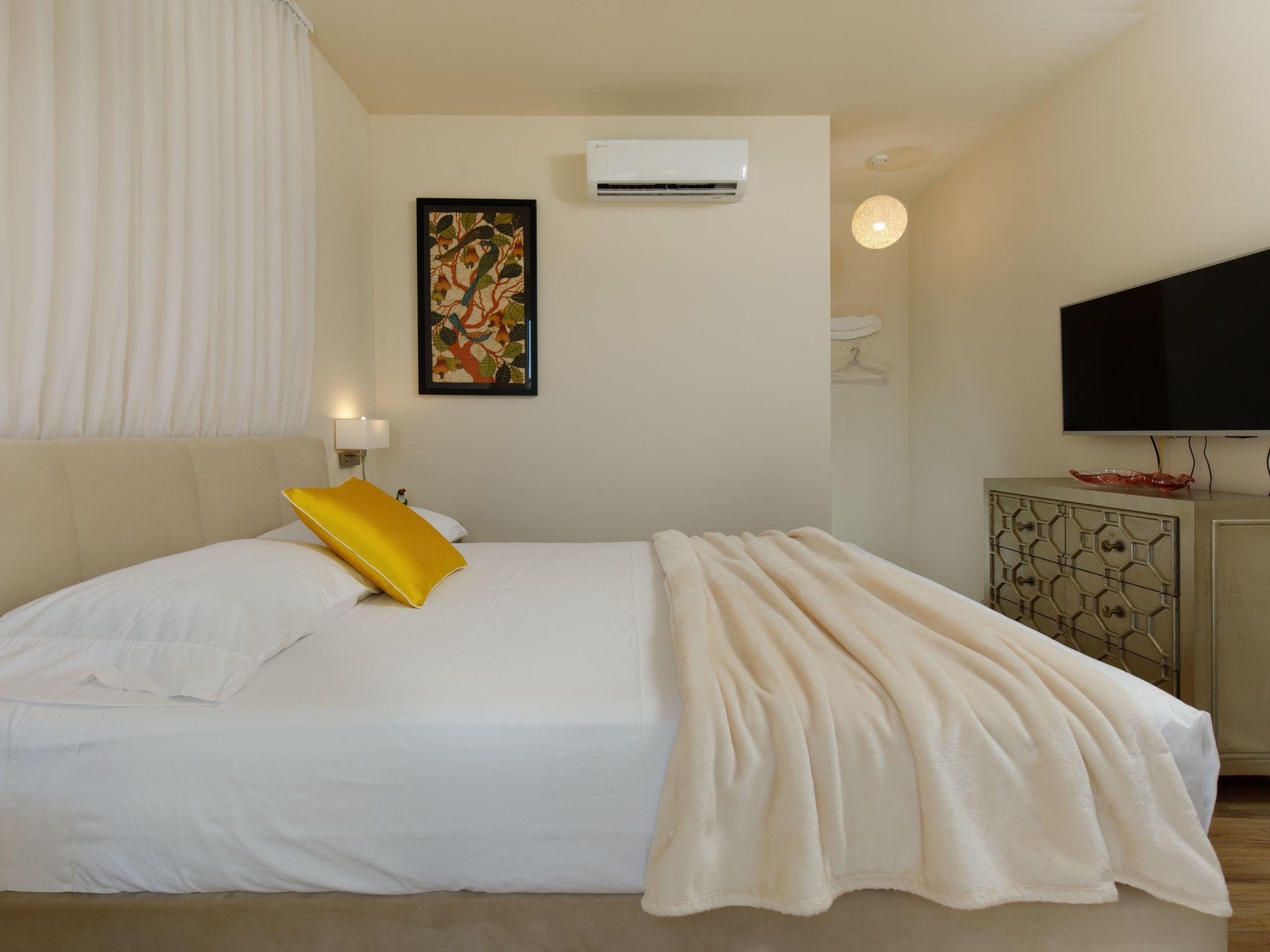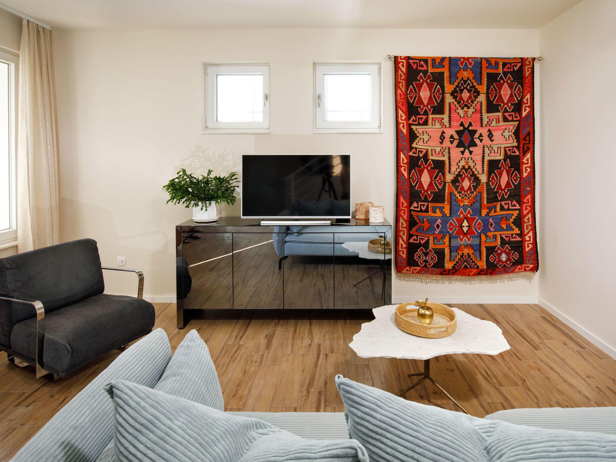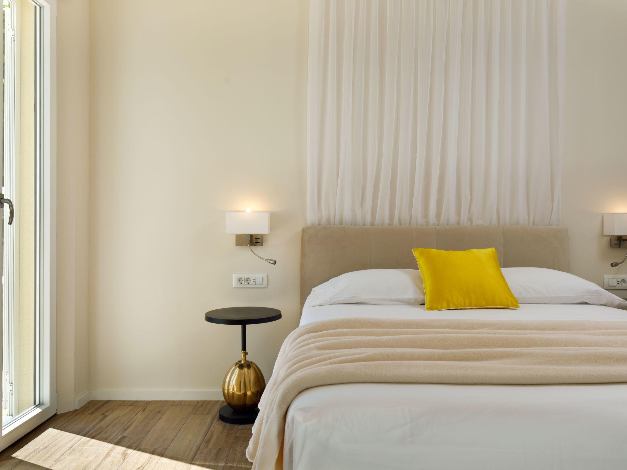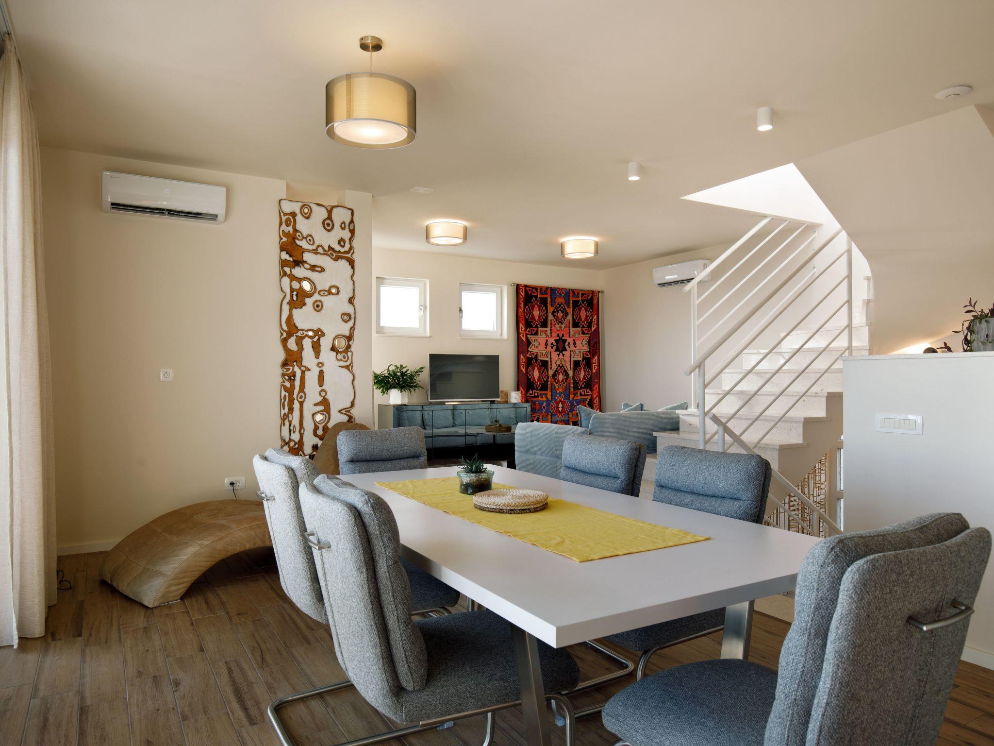 Inside, Villa Anadea's air-conditioned interior offers comfort and convenience across its three well-appointed bedrooms. The living spaces are designed to cater to your every need, featuring a fully equipped kitchen that includes an induction hob and dishwasher, ensuring meal preparation is a breeze. The open-plan living area, complete with a flat-screen TV and comfortable seating, invites guests to relax and unwind. The house is further enhanced by two bathrooms, each fitted with a luxurious hot tub, where guests can indulge in some pampering after a day of exploring.