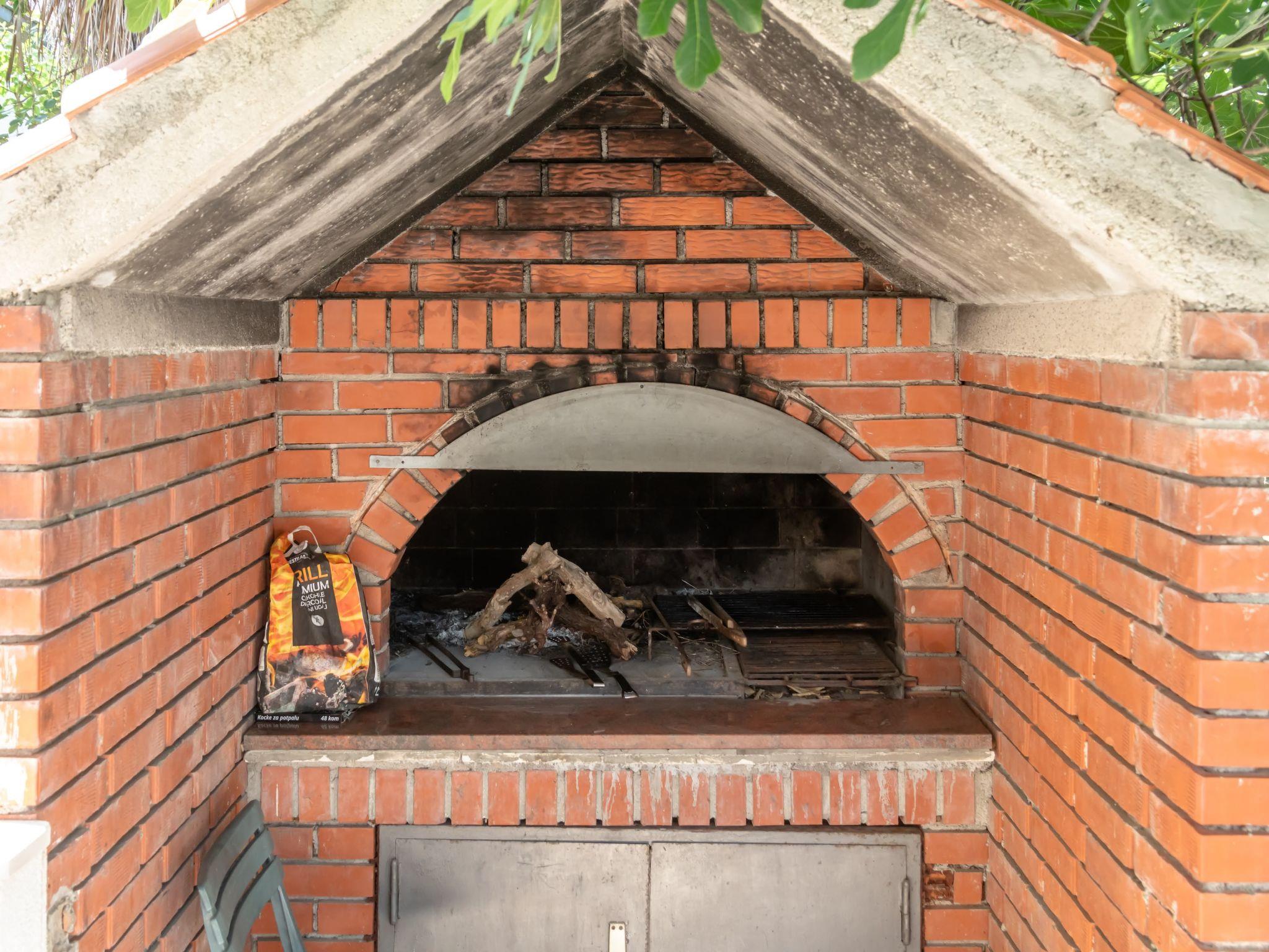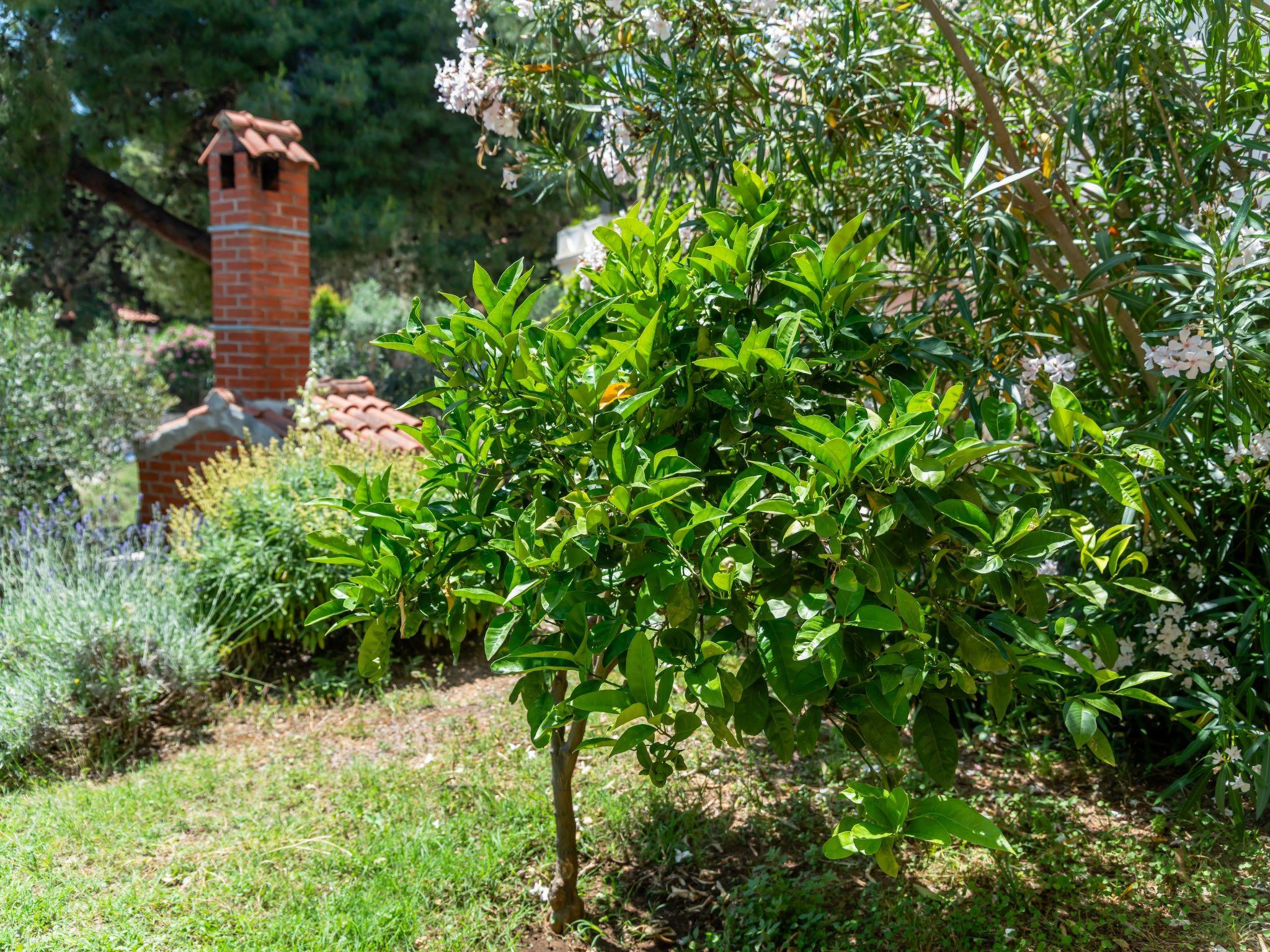 The living room leads out onto the large terrace (30m²) with a beautiful view of the sea and the garden. The terrace provides garden furniture, a parasol and two teak loungers. Enjoy the open view and the sunshine. The house has a garden with Mediterranean herbs and an outdoor grill area. There is parking space on site for three to four cars.