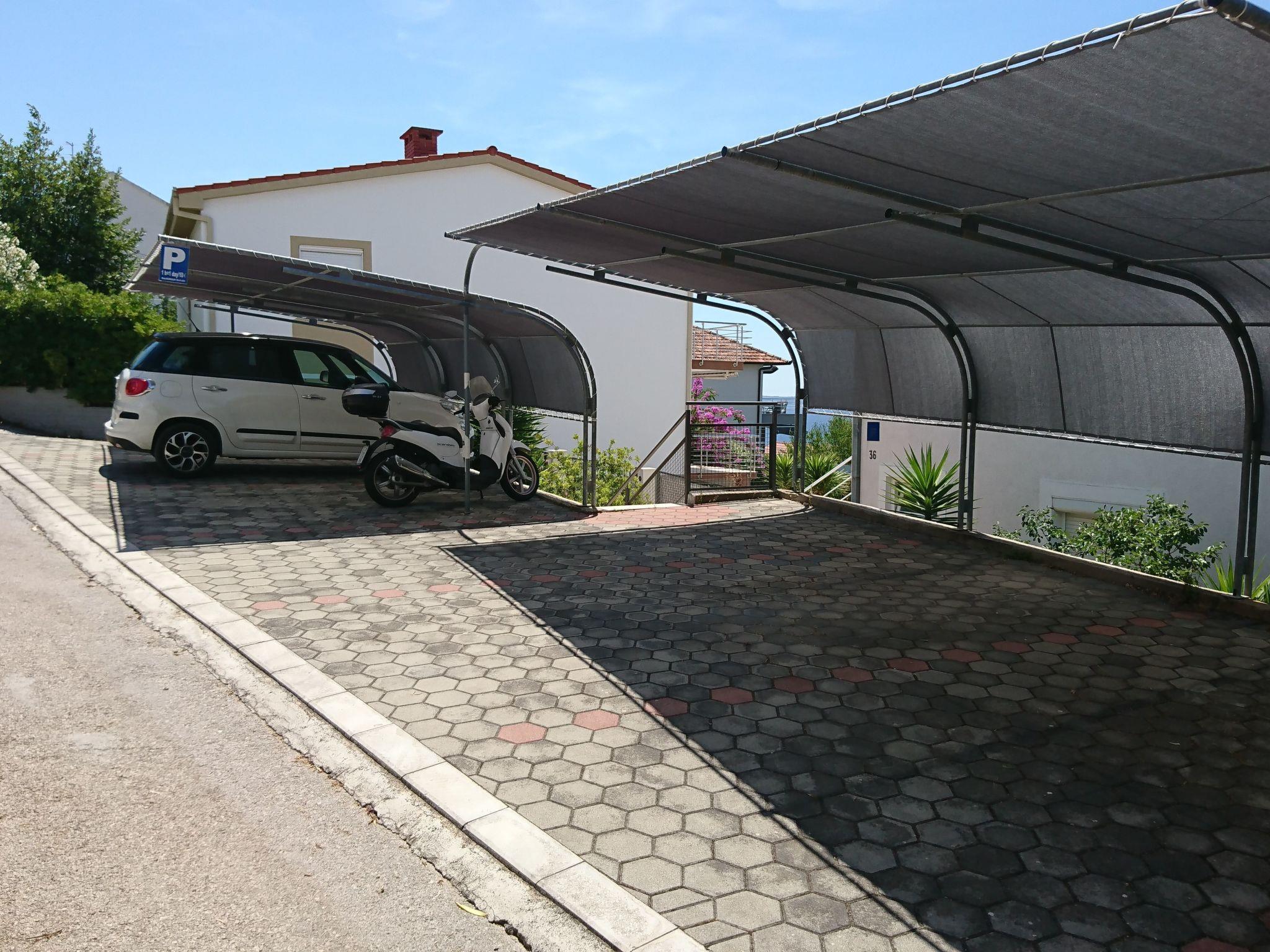 From your private balcony with a table and chairs you can enjoy the sea views. The communal swimming pool is chlorine-free. It is surrounded by sun loungers and sun shades and can be illuminated at night. The apartment also has access to a barbecue in the yard and there is a large parking lot for several cars.