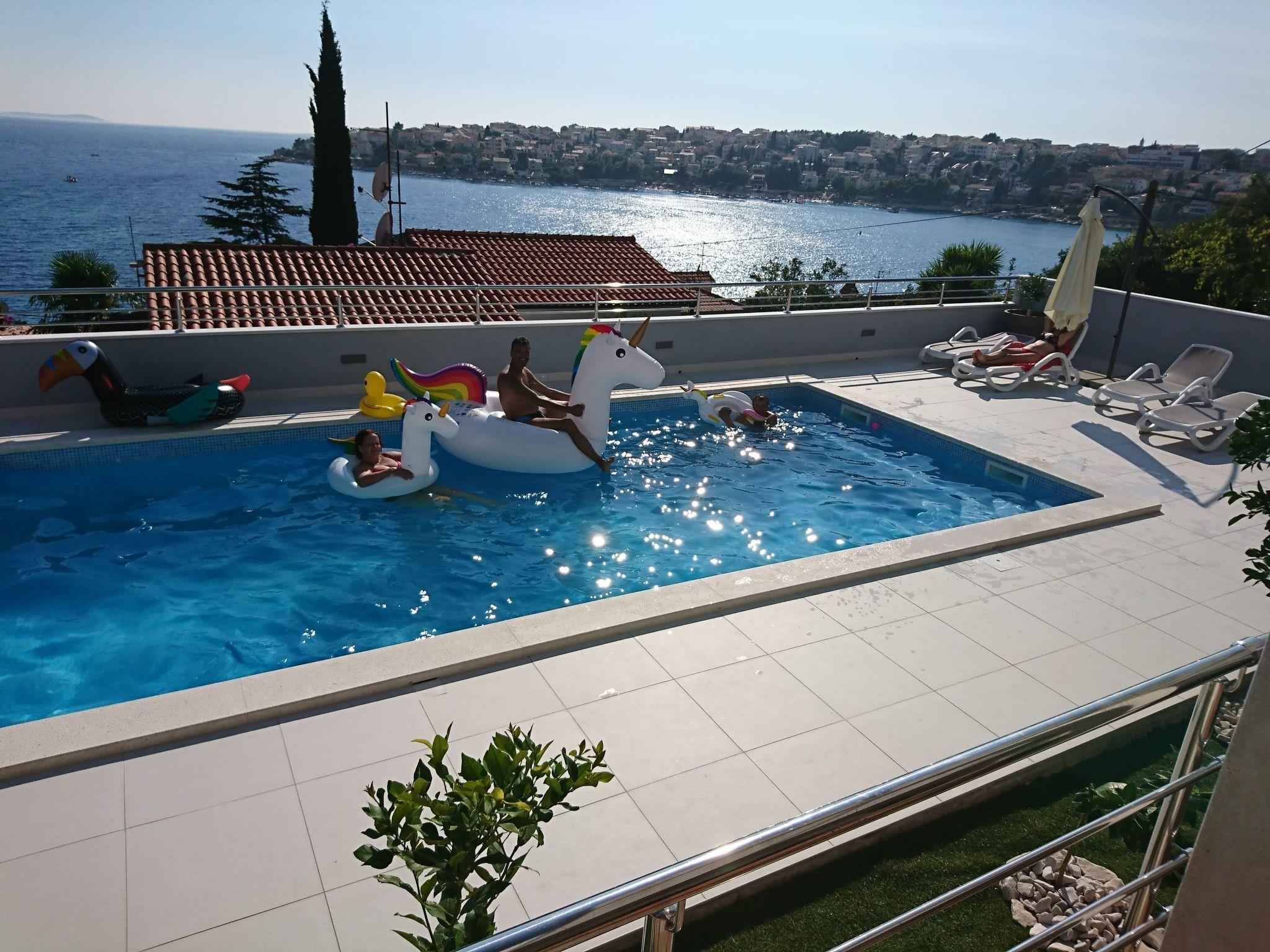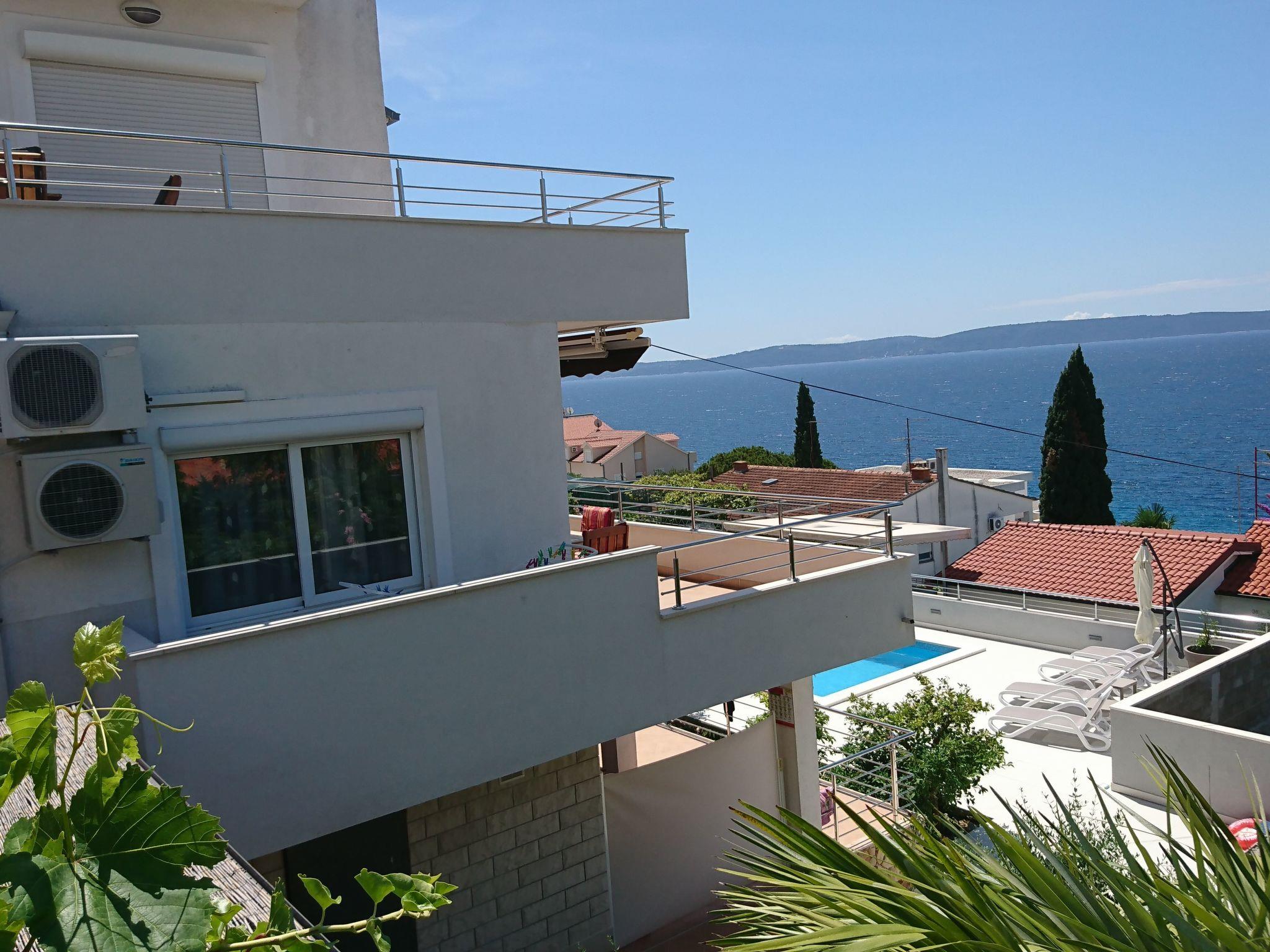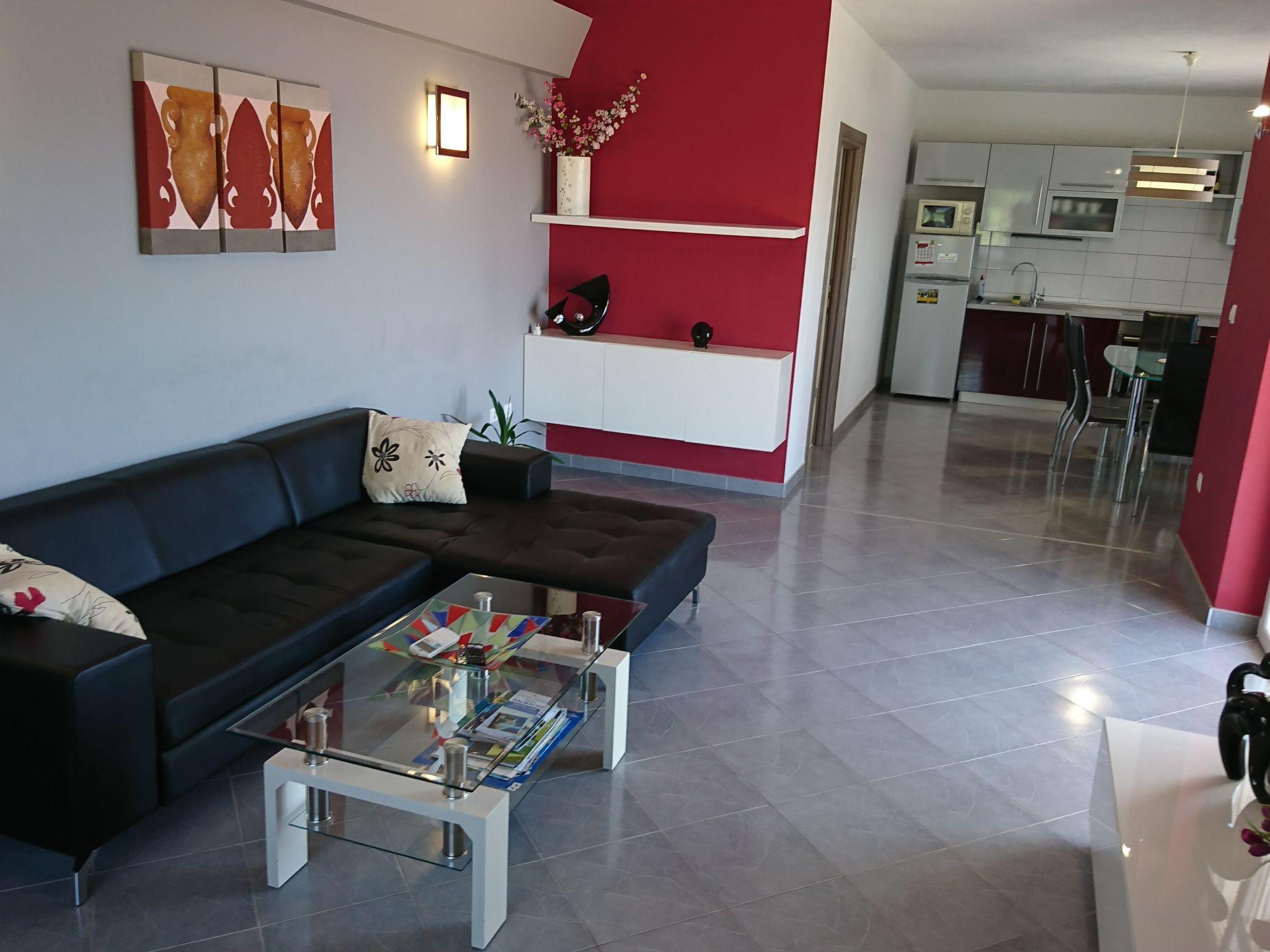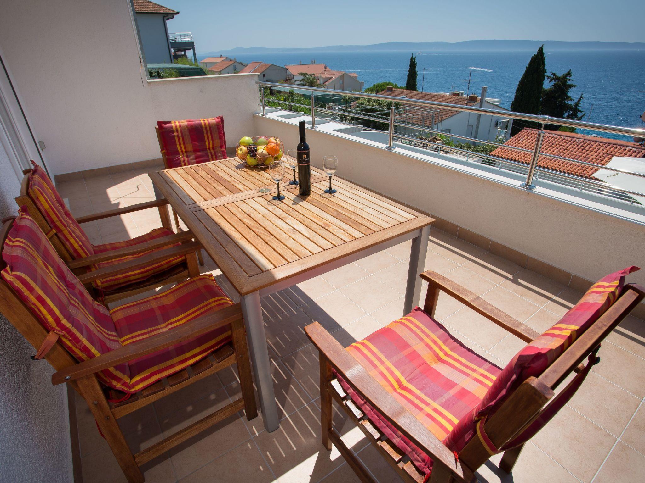 Charming modern holiday apartment with a private sea view balcony and communal, chlorine free illuminated swimming pool