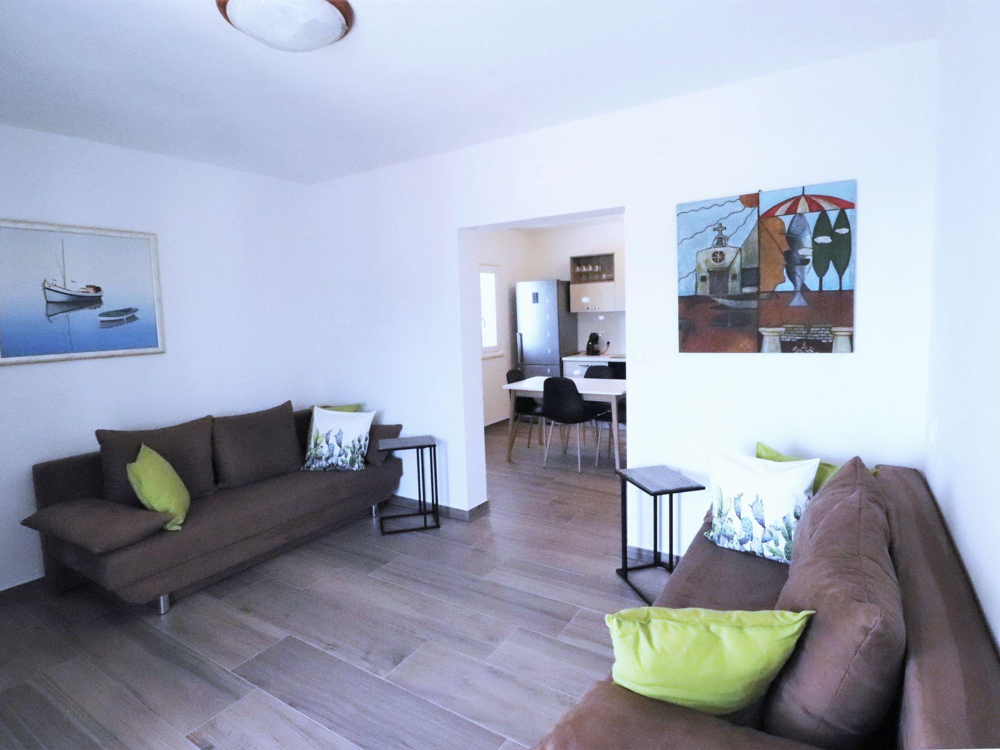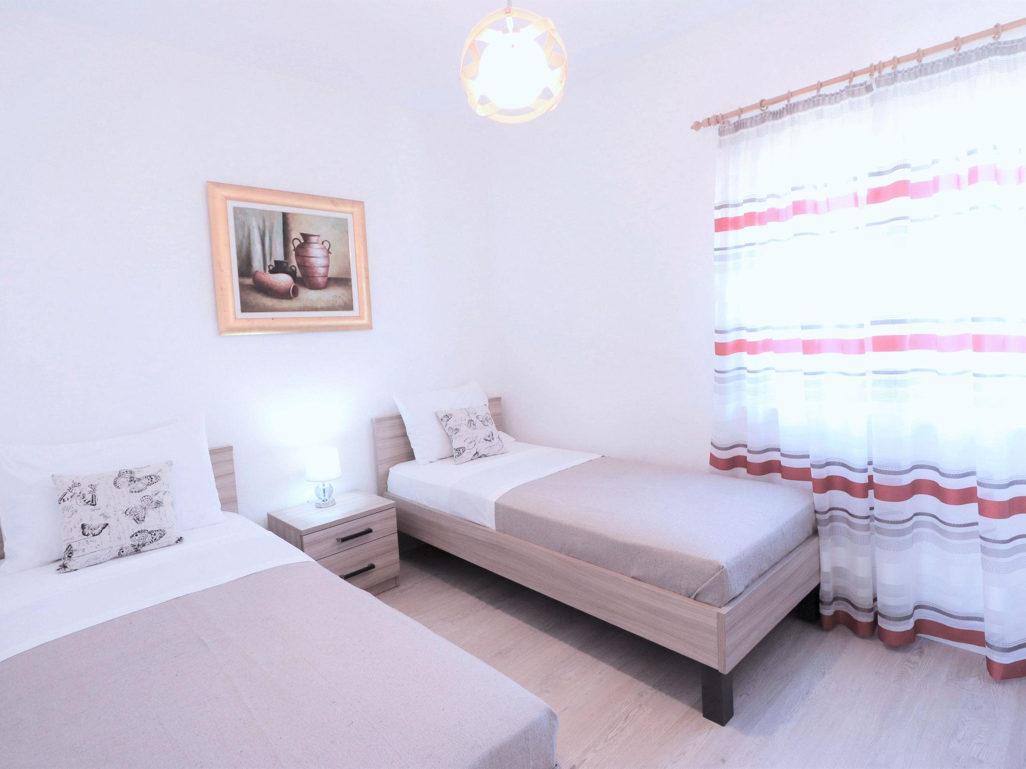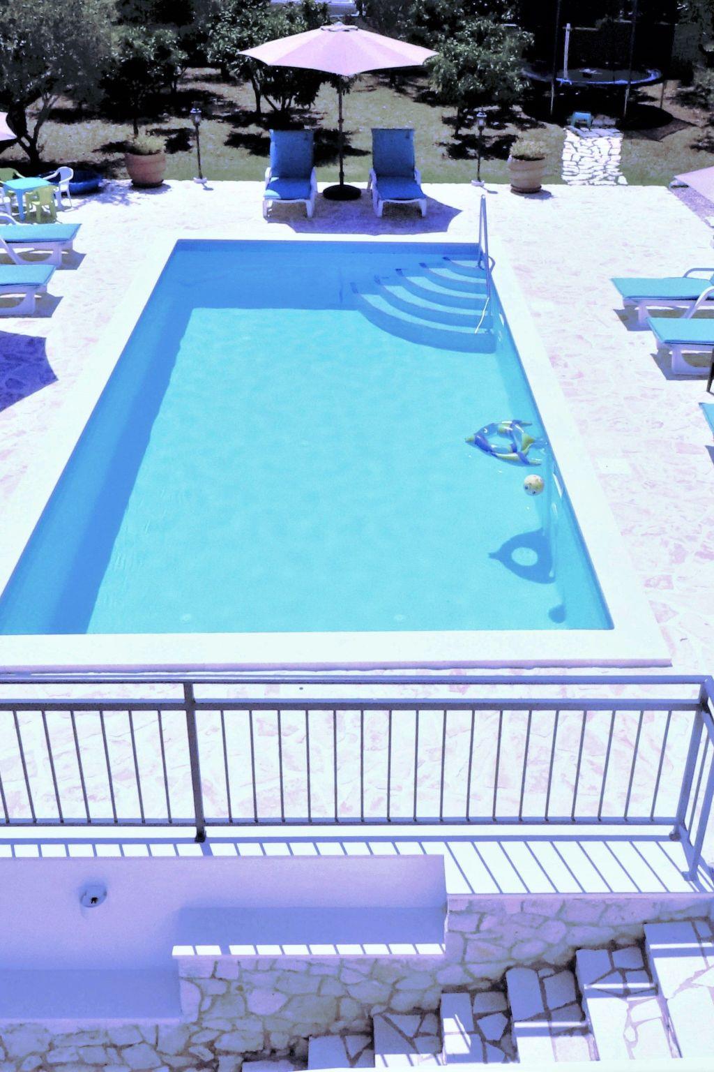 The villa has a beautifully designed interior. It is a great spot for families and groups of friends due to space and variety of eating and seating areas. Comprised of two separate apartments (one on the ground floor and one on the first floor) with private access, it works well if you are traveling with family members. The Villa has a capacity of ten people: eight adults, and two teenagers or children. There are four bedrooms, two of which are furnished with a 160 x 200 cm double bed and the other two have two 90 x 200 cm single beds each. The two living rooms offer spacious sofas and flatscreen TVs. Both modern kitchens are fully equipped. Parents can pack lightly, as a travel crib, high chair, and baby bath are all provided. The villa is fully air-conditioned and covered with wireless internet access both inside and also around the pool and garden.