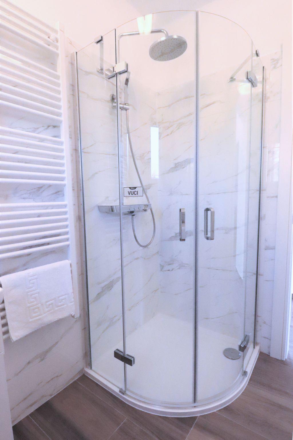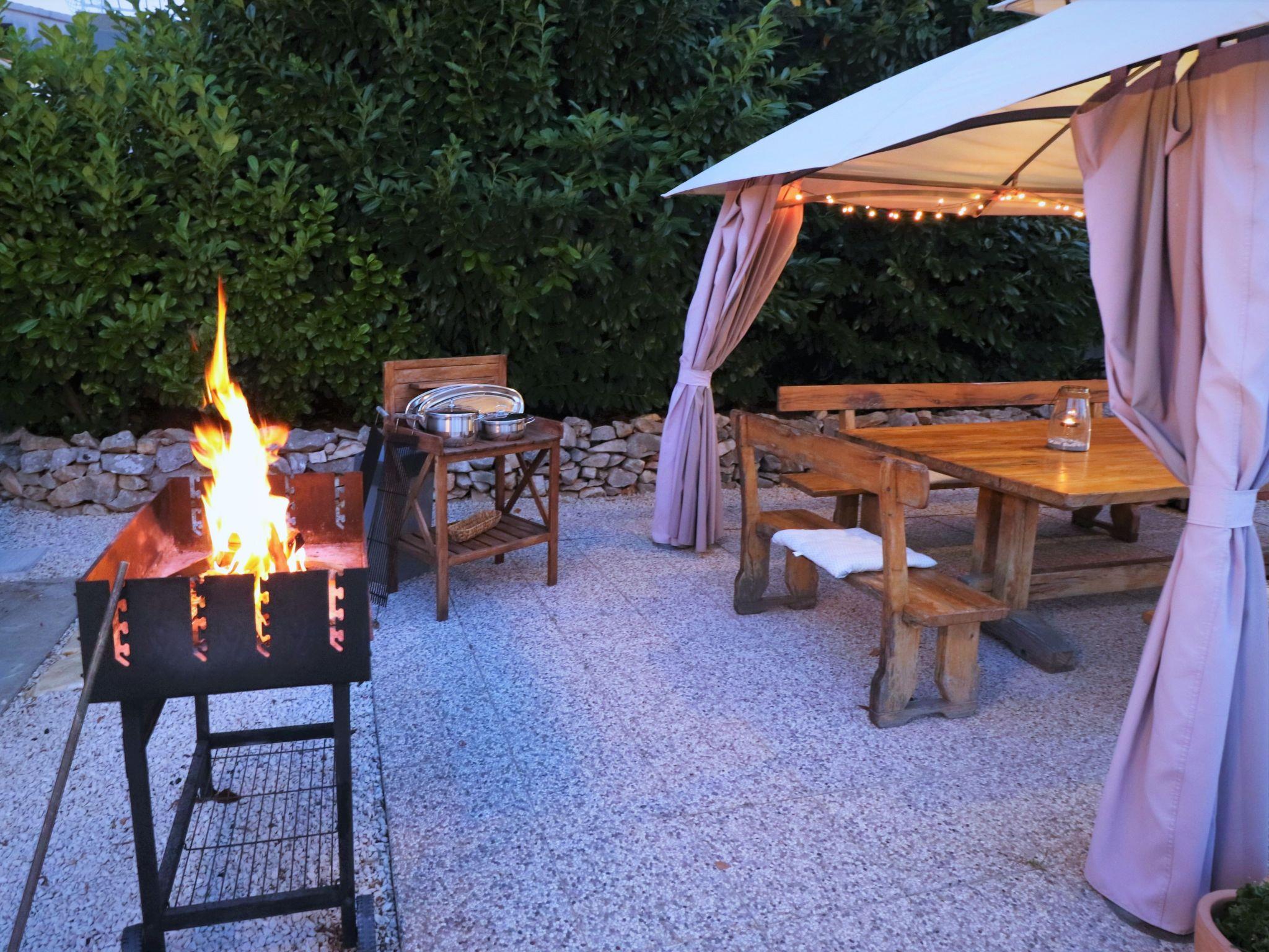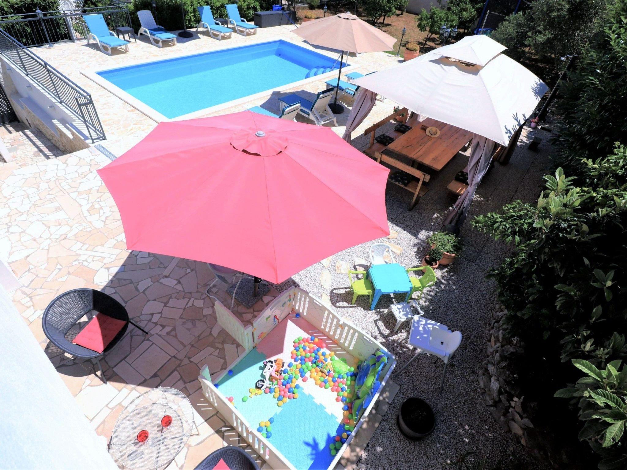 You can enjoy the beautiful green settings with a large swimming pool and great outdoor areas. The spacious pool area provides a divine choice of spots to catch the sun rays or to find shady corners, while the shaded gazebo with a BBQ and big dining table invites to spend long dinners and great get-together moments. There are stunning sea views from the balcony on the first floor. There are two private parking places, free of charge. The children's paradise as we call the garden extends to 600 m2 various levels of the property. However, the highlight of the garden is the beautiful swimming pool (32m2) with an internal staircase and salt-electrolysis pool cleaning system. The sun loungers (10), extra tables (4) and sunshades (4) invite each of the villa guests to identify their perfect spot to relax.