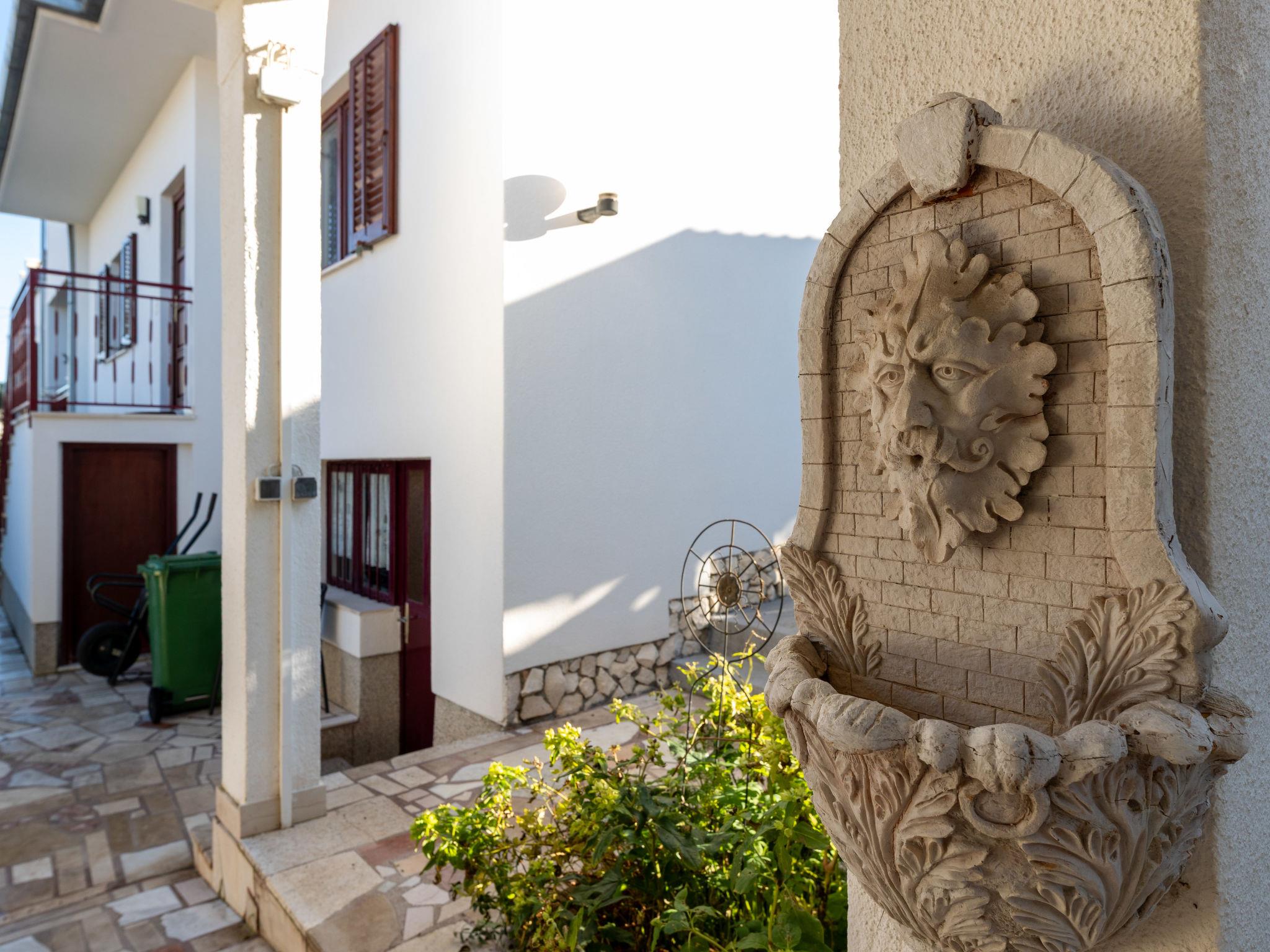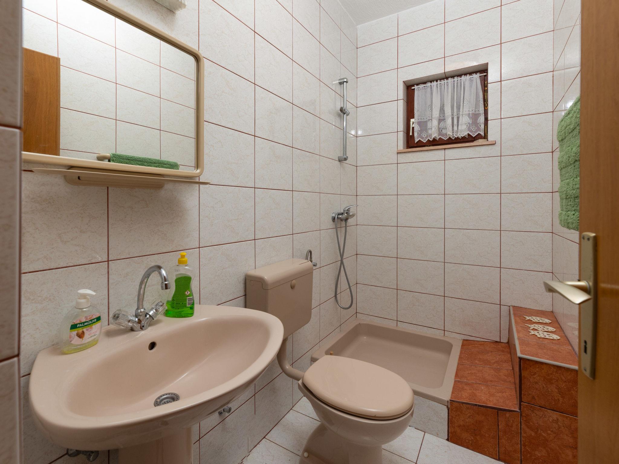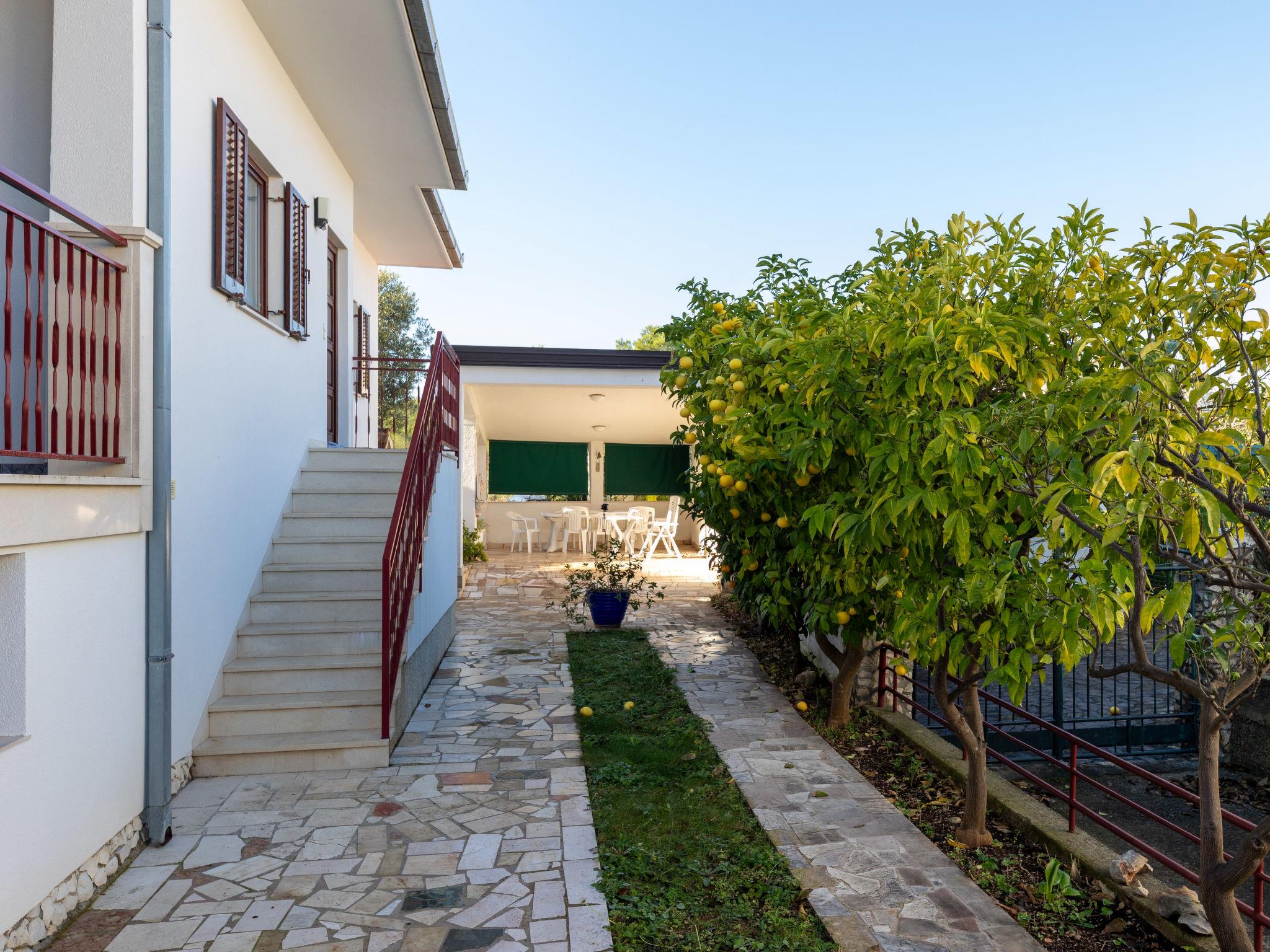 Okrug Gornji (Ciovo) 6 km from Trogir: Apartment house, 3 storeys. 1.5 km from the centre of Okrug Gornji, in a quiet, sunny position, 80 m from the sea, 80 m from the beach. For shared use: property 450 m2. Terrace (20 m2), barbecue. In the house: internet access. Parking (for 5 cars) at the house on the premises. Shop 1.5 km, restaurant 1.5 km, bus stop 1 km.