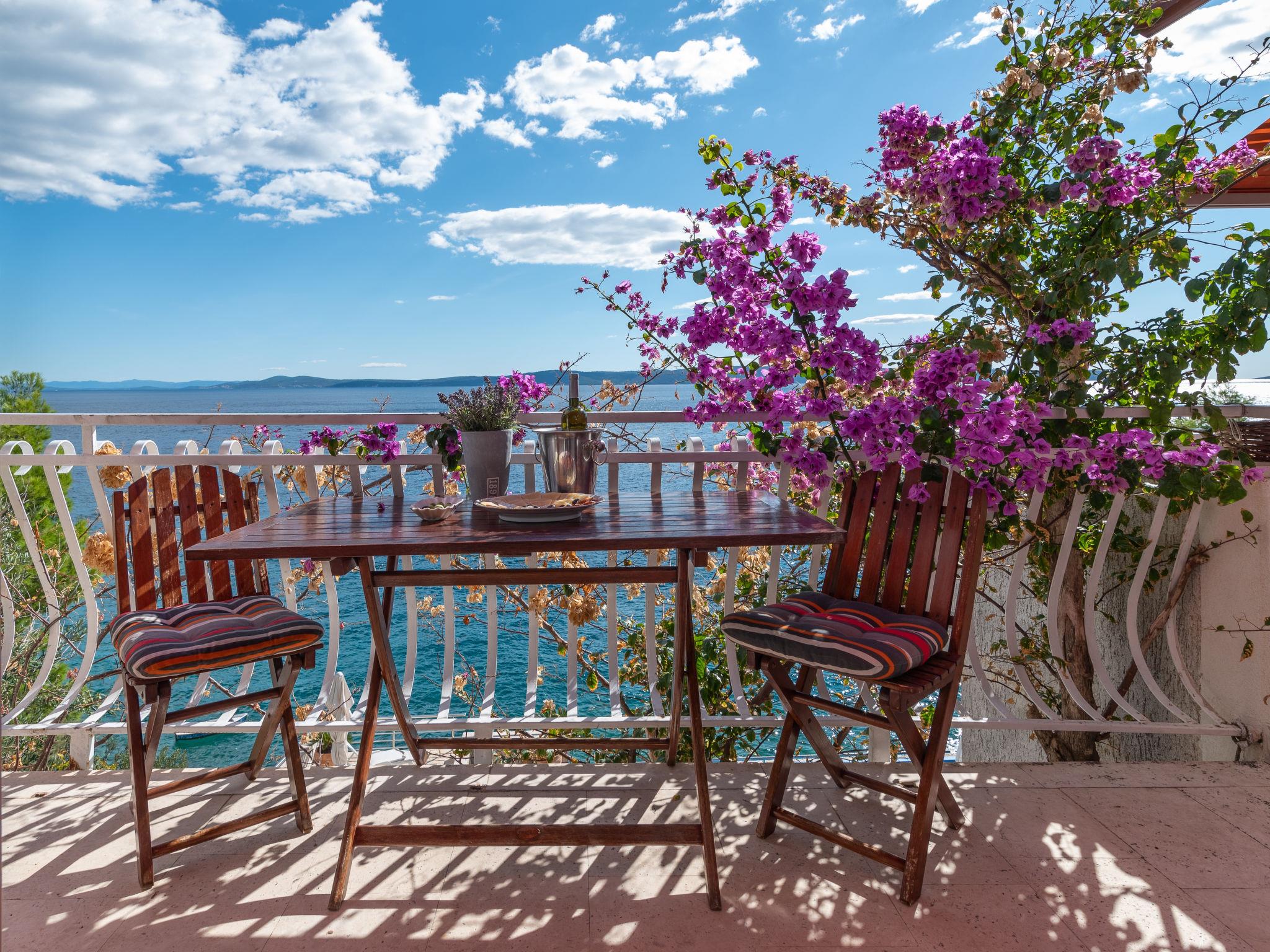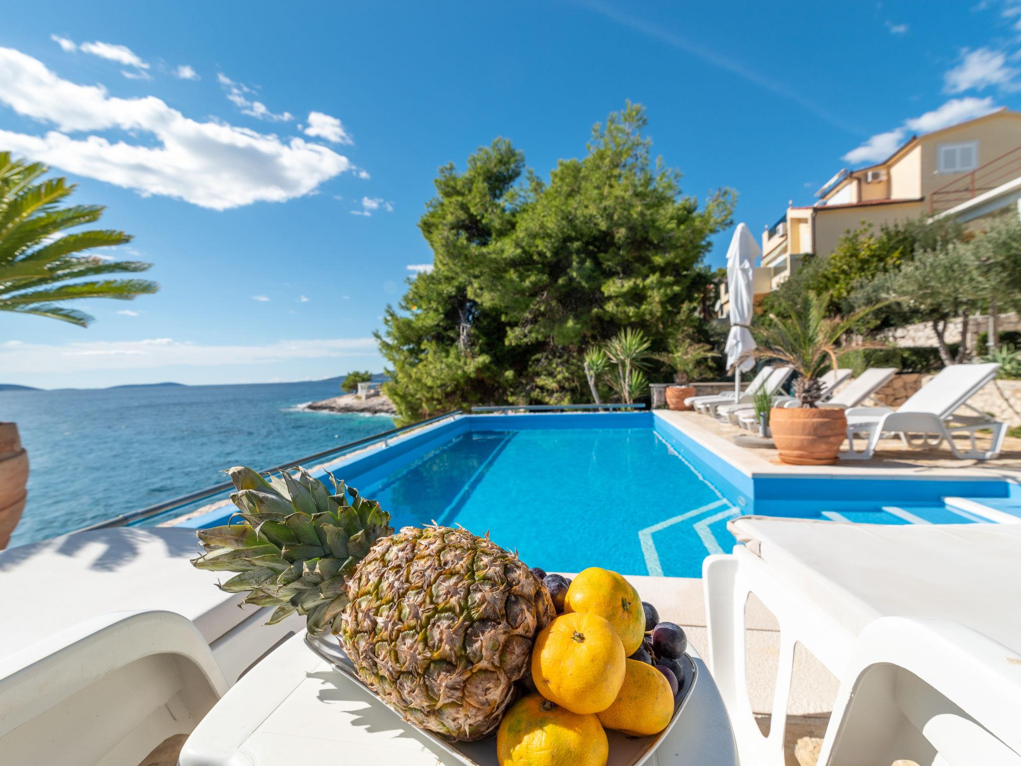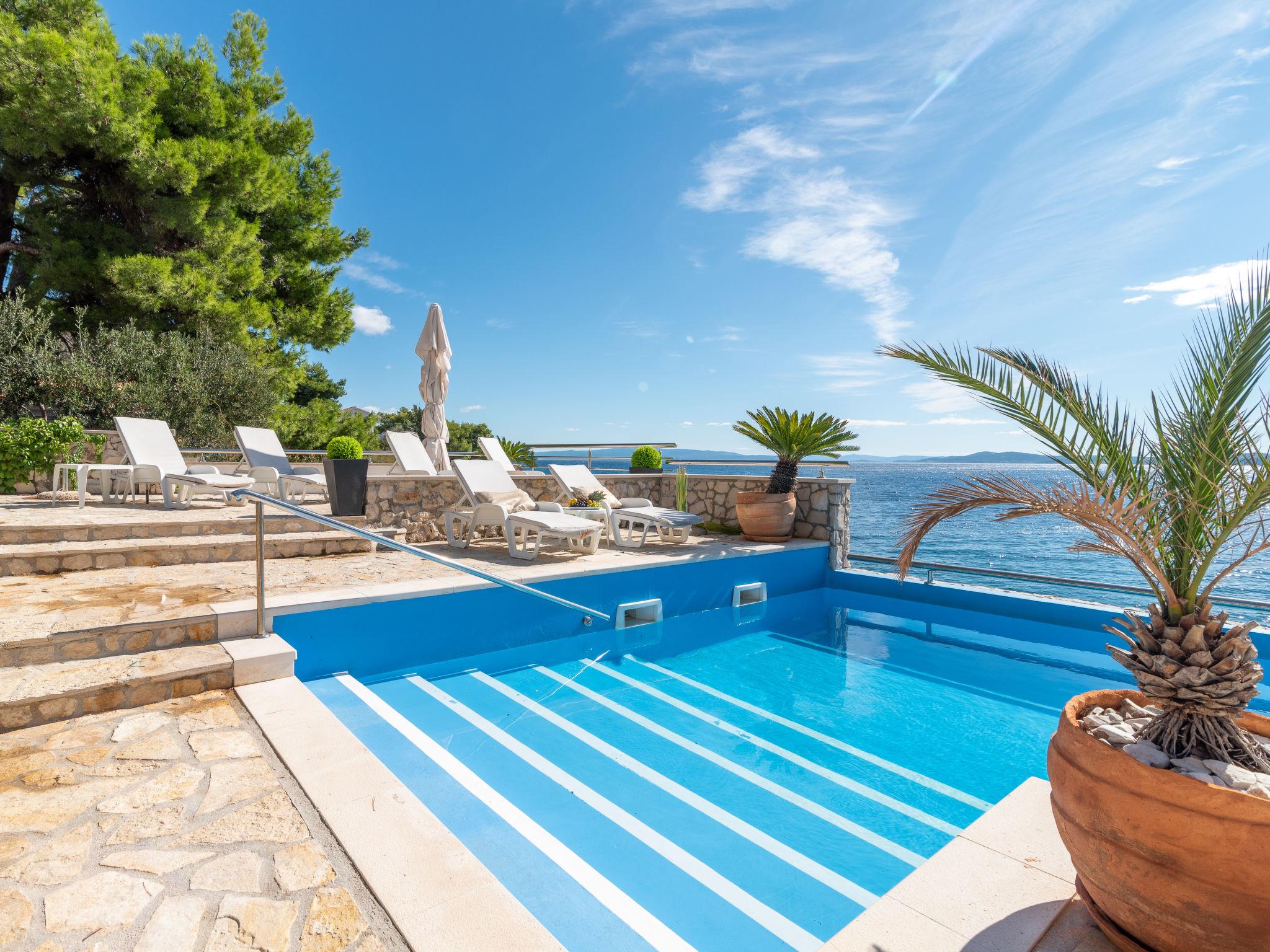 Okrug Gornji (Ciovo), 6 km from Trogir: Beautiful, cosy apartment house "Villa Pinia". Outside the resort, 1.5 km from the centre of Okrug Gornji, in a quiet, sunny, elevated position, 20 m from the sea, 20 m from the beach, in the countryside. For shared use: garden with plants, swimming pool angular (11 x 4 m, depth 120 - 140 cm, seasonal availability: 25.Apr. - 12.Sep.) with salt water and internal staircase. Outdoor shower, patio, barbecue. In the house: internet access, washing machine. Steep motor access to the house. Parking at the house on the premises. Shop 250 m, restaurant 1.5 km, bus stop 1.9 km, pebble beach 100 m, rocky beach 20 m. Please note: Additional accommodations can be booked.