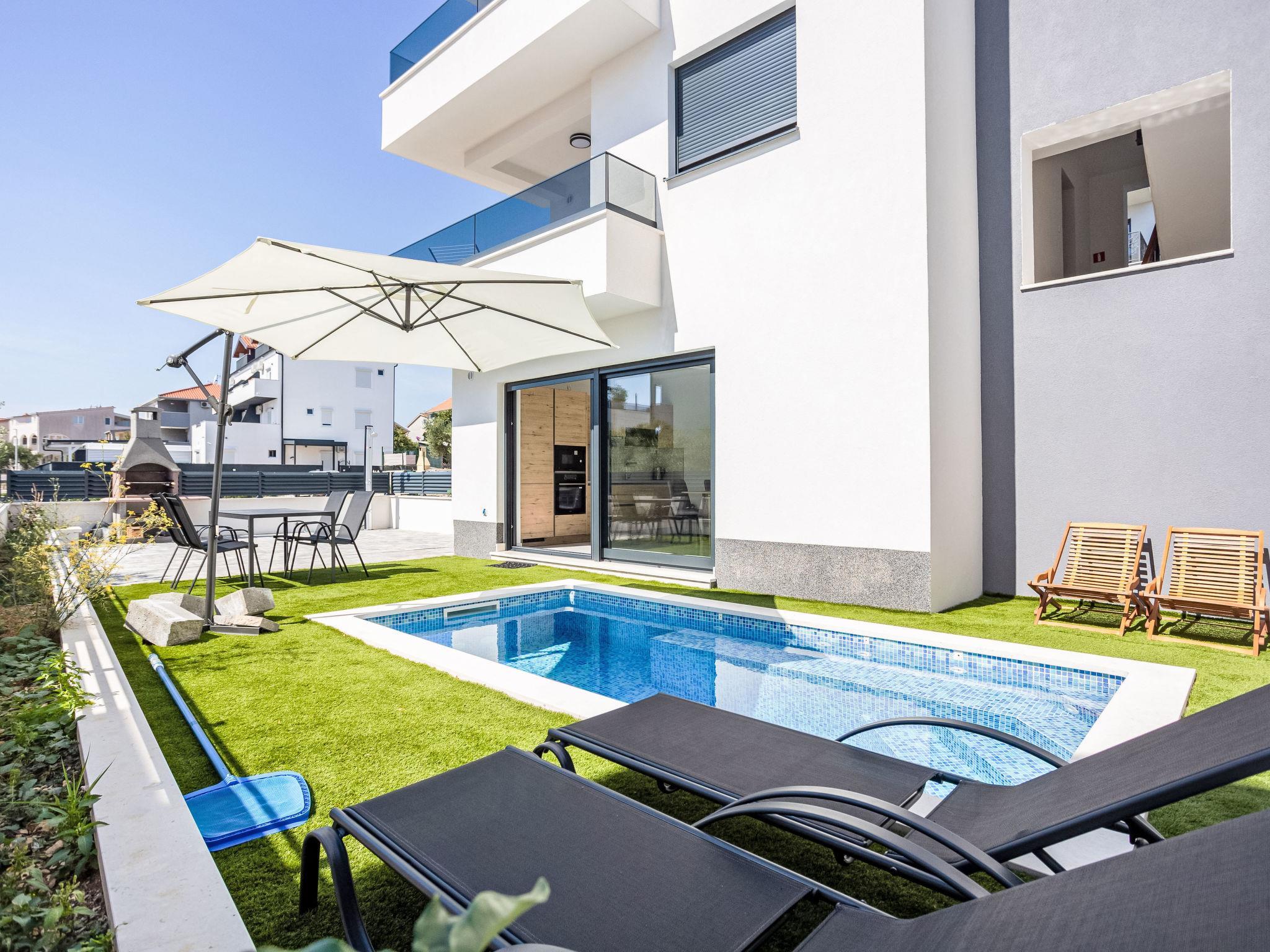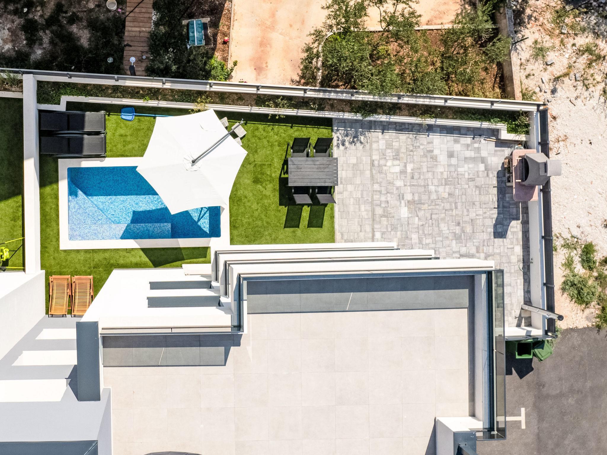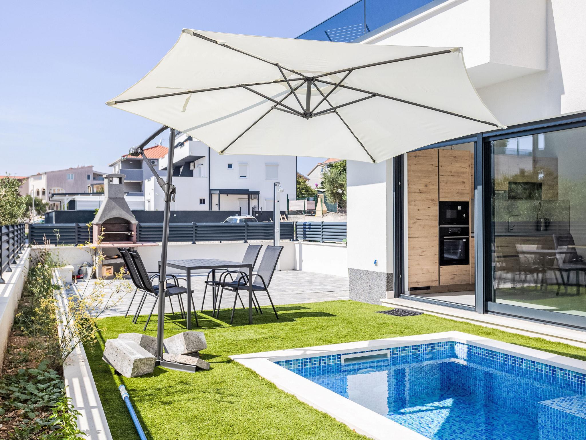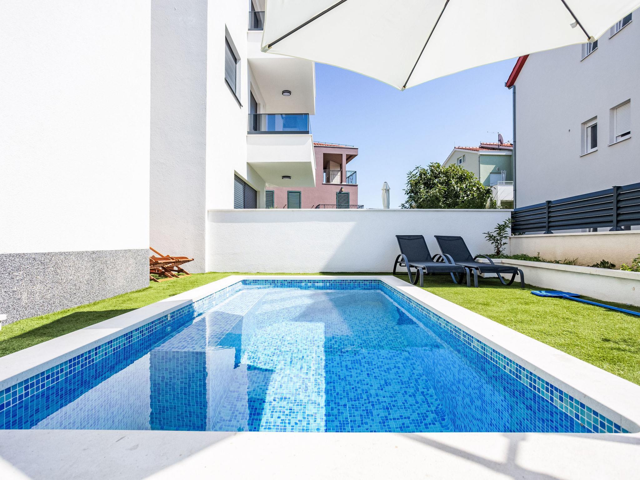 Okrug Gornji: Residence, 3 storeys, built in 2022. 6 km from the centre of Trogir, 2 km from the centre of Okrug Gornji, in a sunny position in the residential district, 500 m from the sea, 500 m from the beach. Private: property 80 m2 (fenced), swimming pool angular (9 m2, depth 150 cm, seasonal availability: 01.Jun. - 01.Oct.) with internal staircase. Outdoor shower. In the house: internet access. Parking space n 1 at the house on the premises. Shop, restaurant 500 m, bus stop 1 km, pebble beach 1 km. Please note: airfield 7 km from the property.