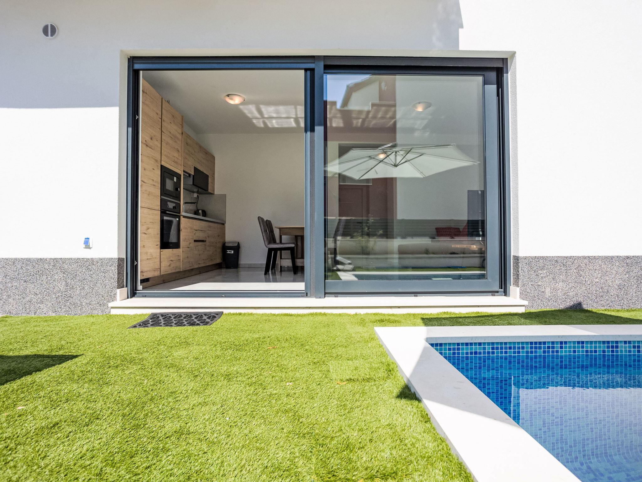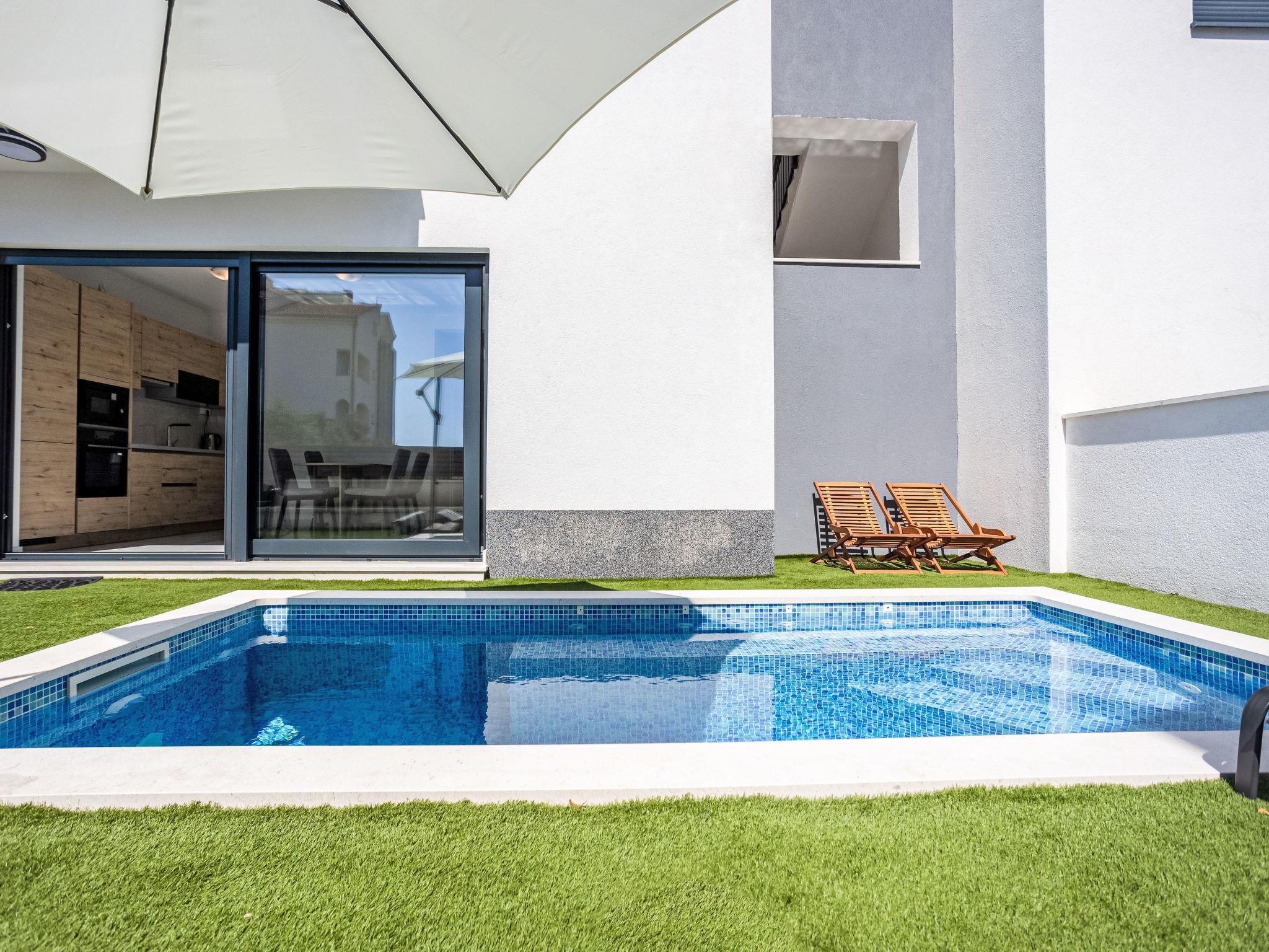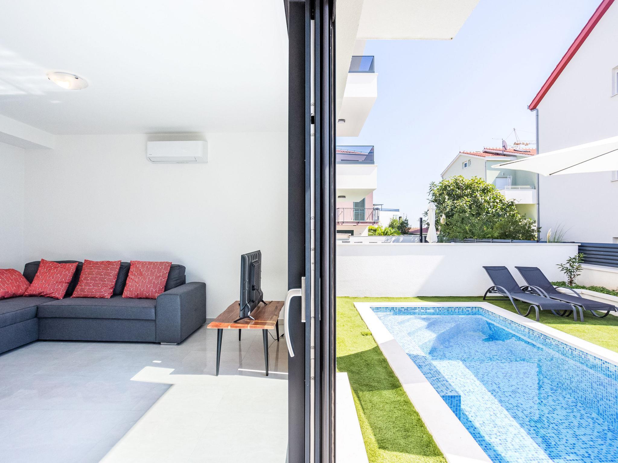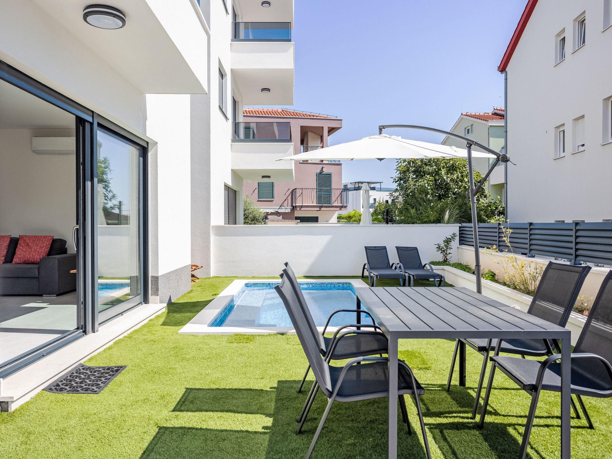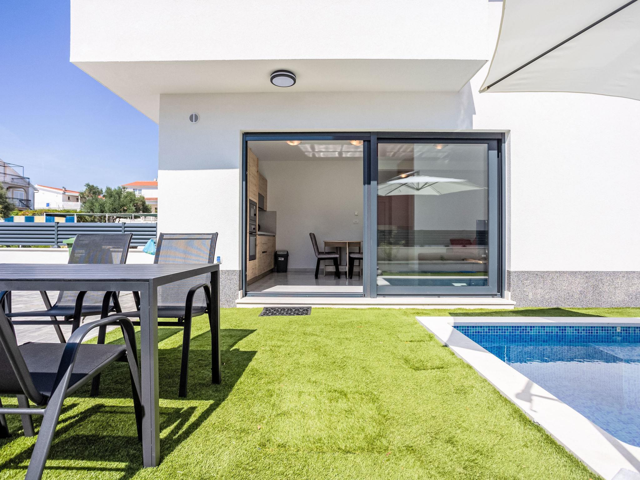 Okrug Gornji: Residence, 3 storeys, built in 2022. 6 km from the centre of Trogir, 2 km from the centre of Okrug Gornji, in a sunny position in the residential district, 500 m from the sea, 500 m from the beach. Private: property 80 m2 (fenced), swimming pool angular (9 m2, depth 150 cm, seasonal availability: 01.Jun. - 01.Oct.) with internal staircase. Outdoor shower. In the house: internet access. Parking space n 1 at the house on the premises. Shop, restaurant 500 m, bus stop 1 km, pebble beach 1 km. Please note: airfield 7 km from the property.