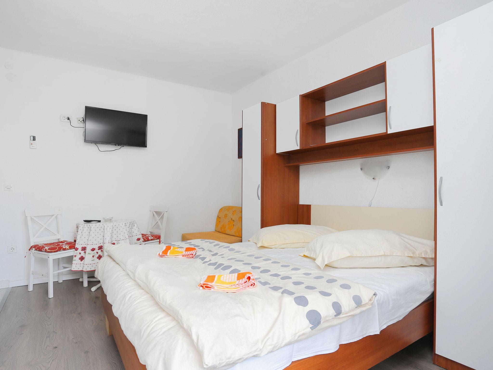 Studio bietet Platz für 3 Gäste. Die Betten sind in Schlafzimmern, die es 1 gibt, innerhalb einer Gesamtfläche von 18m2, angeordnet. Die Gäste haben einen eigenen Balkon zur Verfügung, auf der sie in warmen Sommernächten genießen können. Das Studio-Apartment bietet Meerblick. Es ist erlaubt, Speisen auf dem Gemeinschafts-Grill vorzubereiten. IM PREIS INBEGRIFFEN: Kurtaxe, Endreinigung, Klimatisierung, Parkplatz, Internet, Bügelbrett. VERBINDLICHE ZUSÄTZLICHE KOSTEN: Aufzahlung für Kurzaufenthalte (prozentualer Zuschlag pro Nächtigungsanzahl: 30% - 1, 20% - 2, 10% - 3). Die Verfügbarkeit zusätzlicher Dienstleistungen in Ihrem reservierten Termin und die Preise derselben (falls nicht aufgeführt) müssen im Voraus überprüft werden. Zusätzliche Dienstleistungen die in der Zahlungsaufforderung nicht aufgeführt sind werden direkt beim Vermieter bezahlt, angenommen der Gast nutzt auch diese. Ermäßigung auf den Grundpreis: Gratistag 14=13 (bei einem Aufenthalt von 14 Tagen oder mehr erhalten Sie einen Gratistag für den Aufenthalt bis 31.12.26).