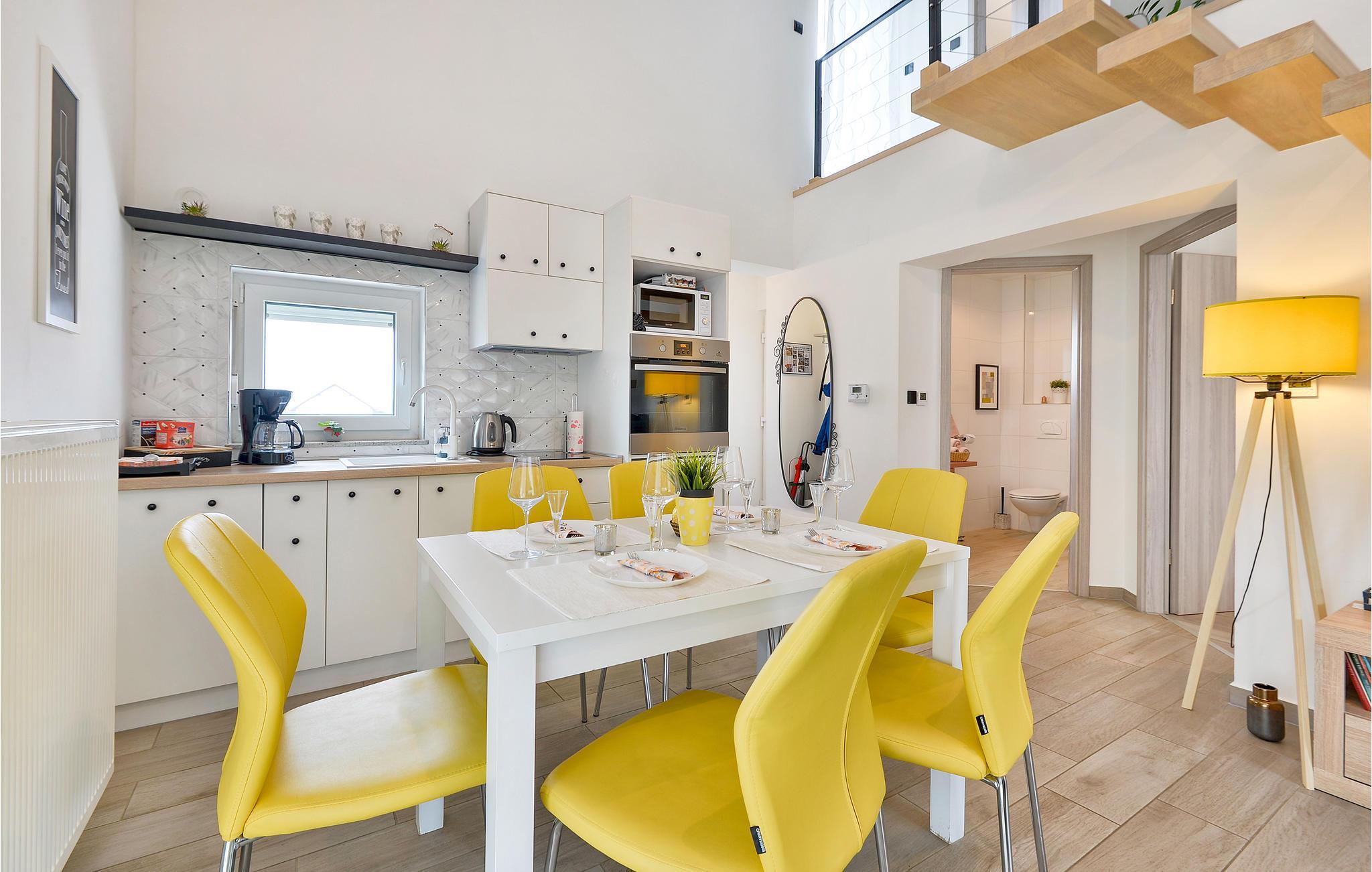 Dette feriehus har 2 lejligheder i samme bygning, hver med 1 soveværelse, stue, køkken og badeværelse. Op til 8 personer kan indkvarteres her, og jeres kæledyr er også velkomne. Huset er ideelt til en familieferie, da man har tænkt på de små behov og legetøj er til rådighed. Børnene finder også masser af legeredskaber i de udendørs områder.