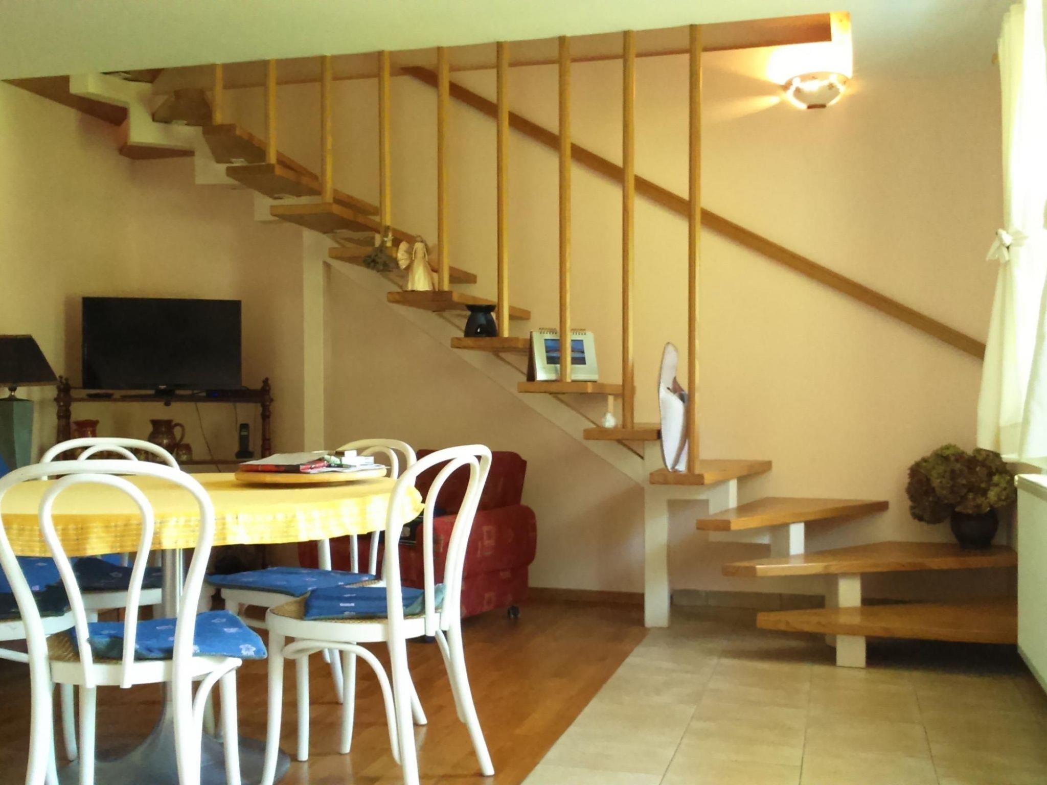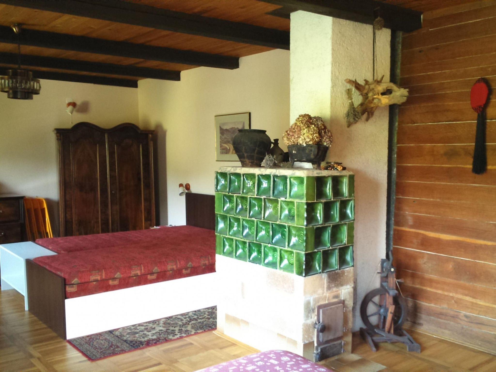 The house is suitable for families with children, as well as for sports enthusiasts who like going on cycle tours, hiking and going on trips. The 40m² ground floor has a living room with a dining table and fireplace stove. A flatscreen TV and free wireless Internet access are provided for entertainment. The sofa is 90cm wide and can be used as a bed for one person. Next door there is a fully-equipped kitchen with an oven, stove, toaster and fridge. Right next to that there is a bathroom with a bath and a washing machine. The upper floor also measures 40m². It has a great balcony with a view of the whole valley and of the surrounding mountains. The very spacious bedroom has a double bed 180 cm wide and a sofa bed 100cm wide. A children’s travel bed is available free of charge on request. The antique furniture gives the house a particular charm.