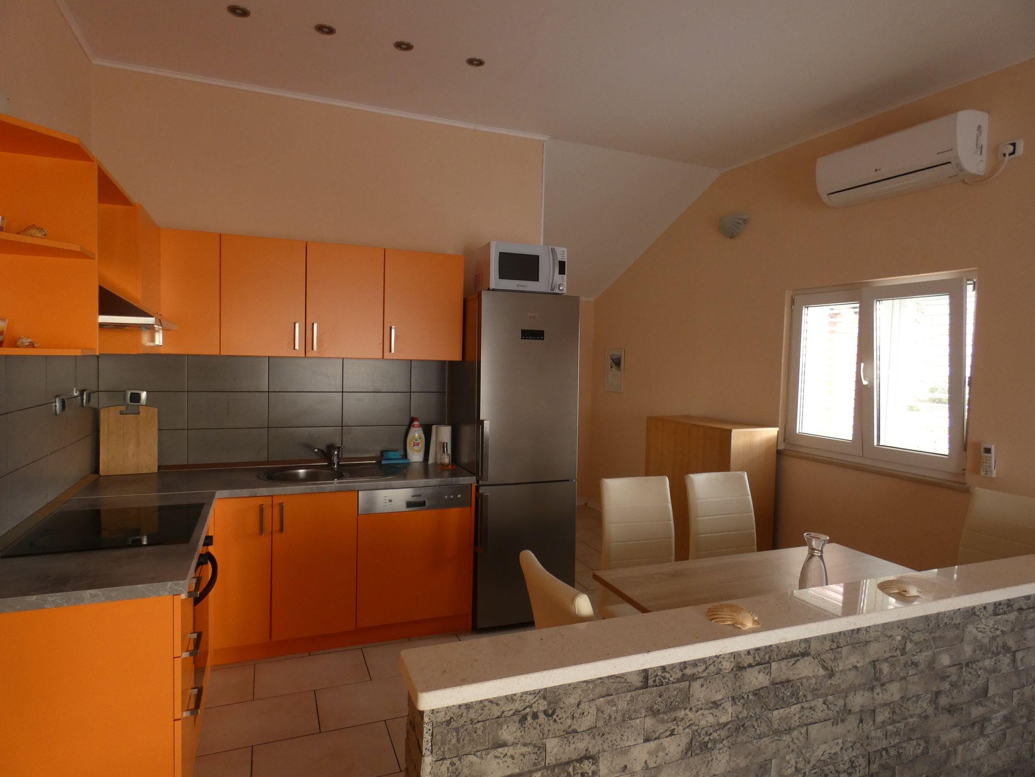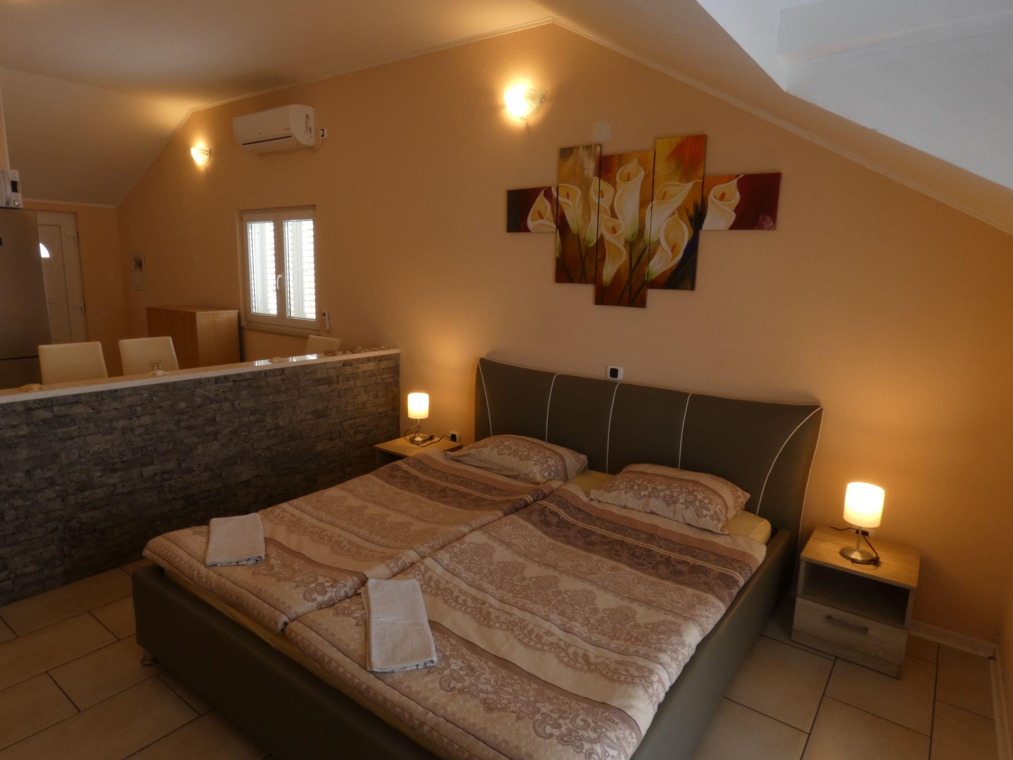 Studio bietet Platz für 2 Gäste. Die Betten sind in Schlafzimmern, die es 1 gibt, innerhalb einer Gesamtfläche von 26m2, angeordnet. Die Gäste haben einen eigenen Balkon zur Verfügung, auf der sie in warmen Sommernächten genießen können. Das Studio-Apartment bietet Meerblick. Es ist erlaubt, Speisen auf dem Gemeinschafts-Grill vorzubereiten. IM PREIS INBEGRIFFEN: Kurtaxe, Endreinigung, Klimatisierung, Parkplatz, Internet, Wäschewaschen, Bügeleisen, Föhn, Liegestühle. VERBINDLICHE ZUSÄTZLICHE KOSTEN: Aufzahlung für Kurzaufenthalte (prozentualer Zuschlag pro Nächtigungsanzahl: 30% - 1, 20% - 2, 10% - 3). Die Verfügbarkeit zusätzlicher Dienstleistungen in Ihrem reservierten Termin und die Preise derselben (falls nicht aufgeführt) müssen im Voraus überprüft werden. Zusätzliche Dienstleistungen die in der Zahlungsaufforderung nicht aufgeführt sind werden direkt beim Vermieter bezahlt, angenommen der Gast nutzt auch diese. Ermäßigung auf den Grundpreis: Gratistag 14=13 (bei einem Aufenthalt von 14 Tagen oder mehr erhalten Sie einen Gratistag für den Aufenthalt bis 31.12.26).