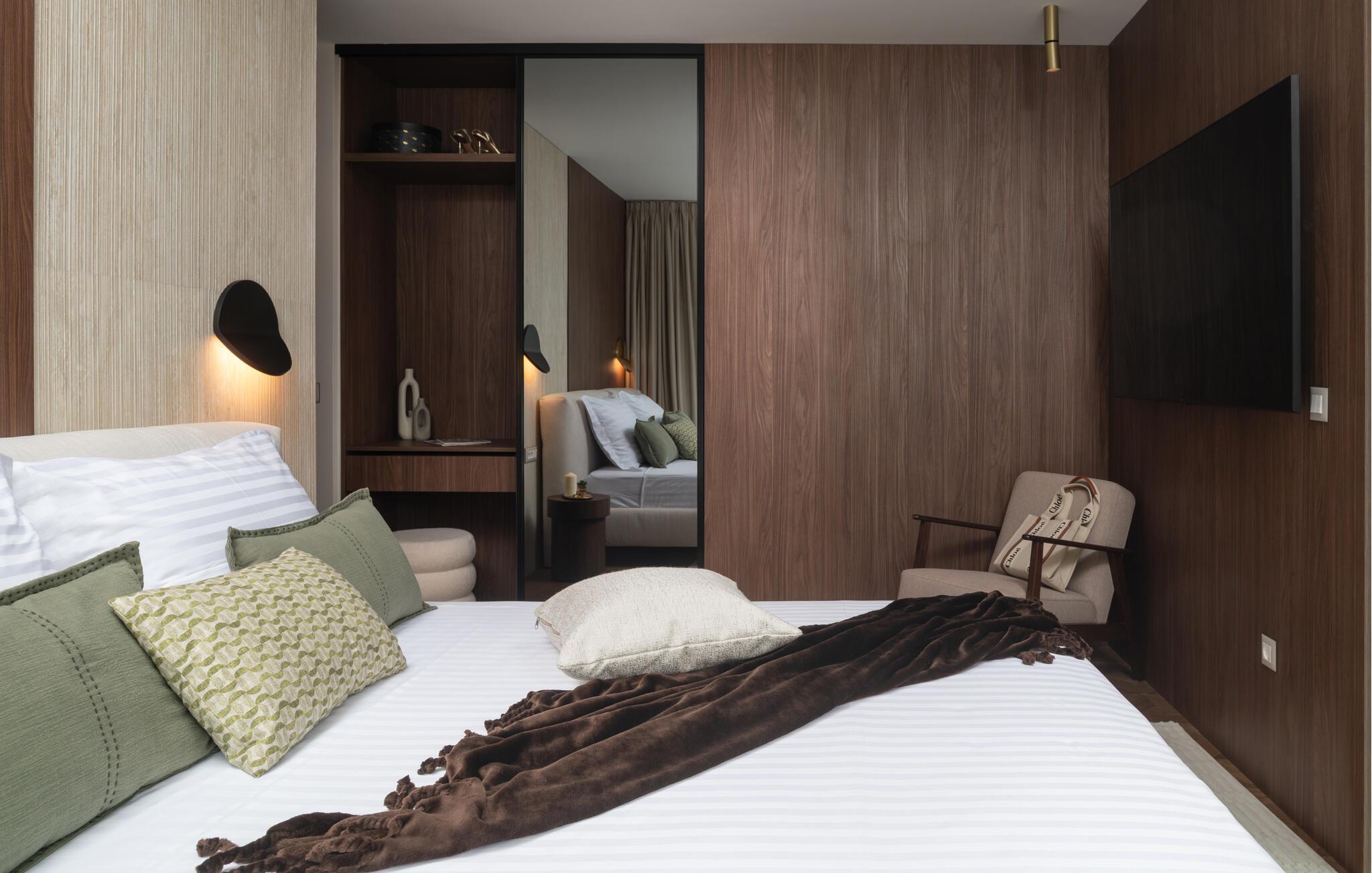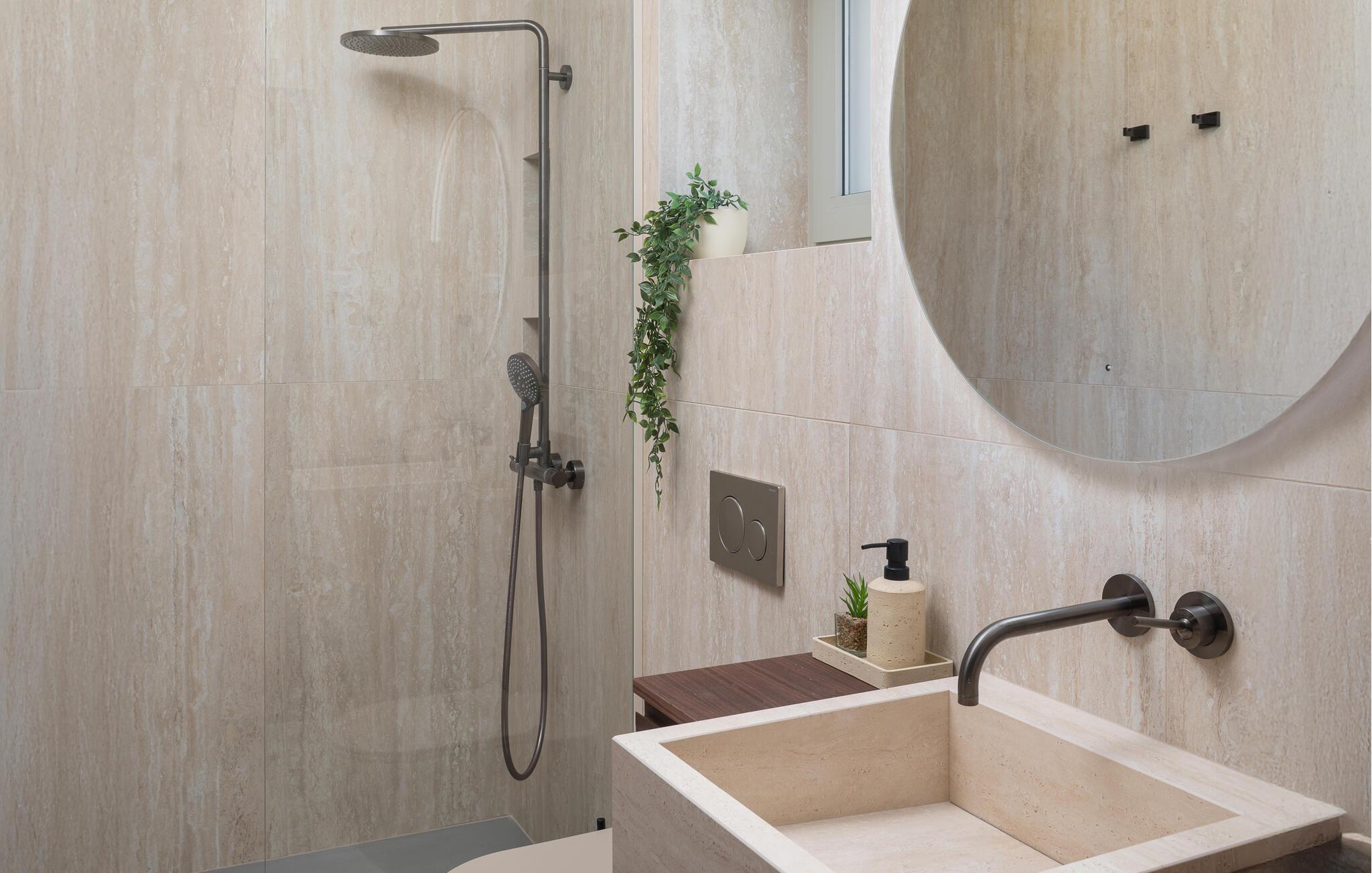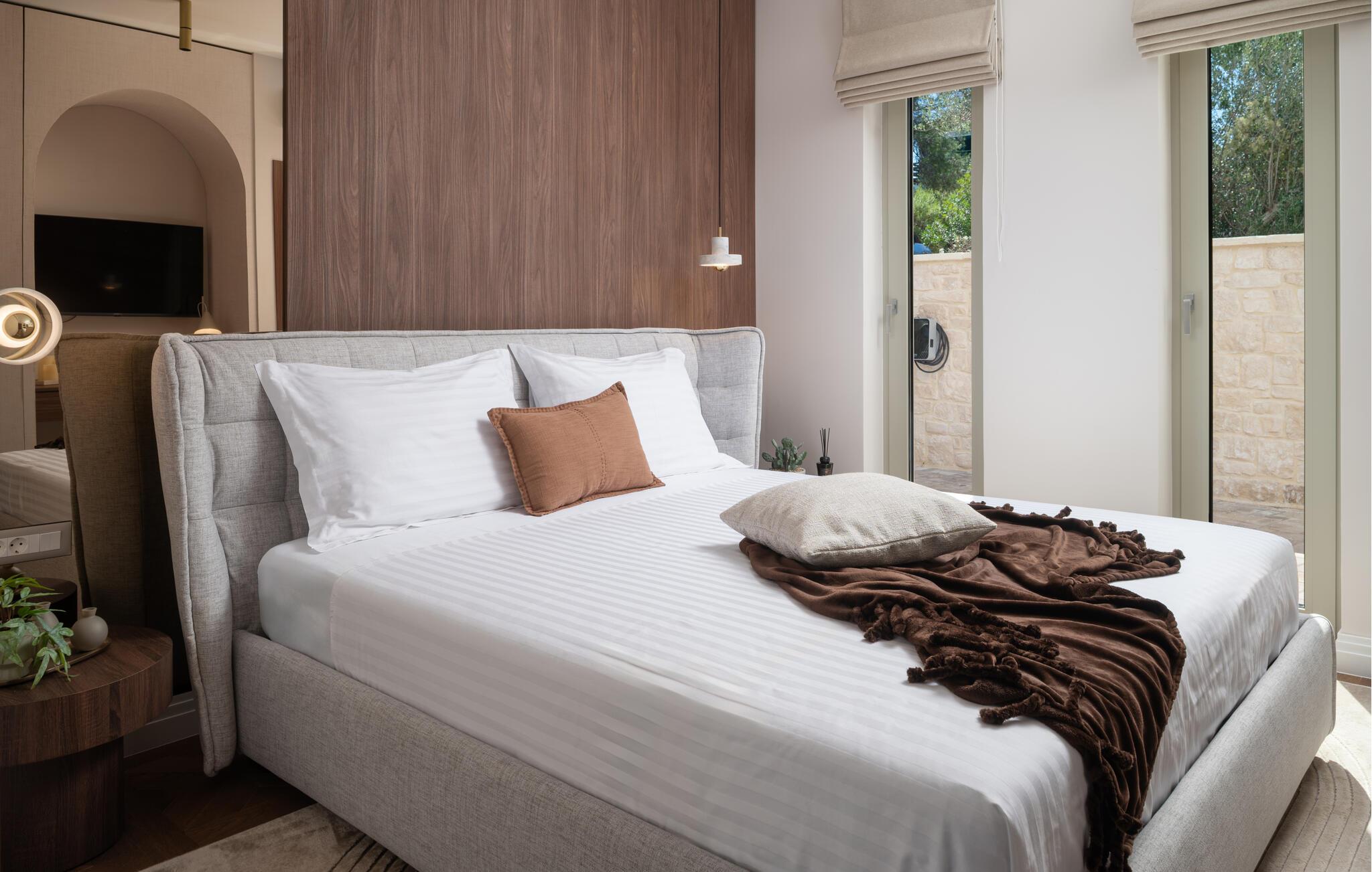 Det elegante udendørsområde er perfekt til at nyde det vidunderlige klima fuldt ud. Uanset om I køler jer ned i poolen, nyder morgenmaden i skyggen eller solbader, har I altid den rolige bugt i udsigt.
