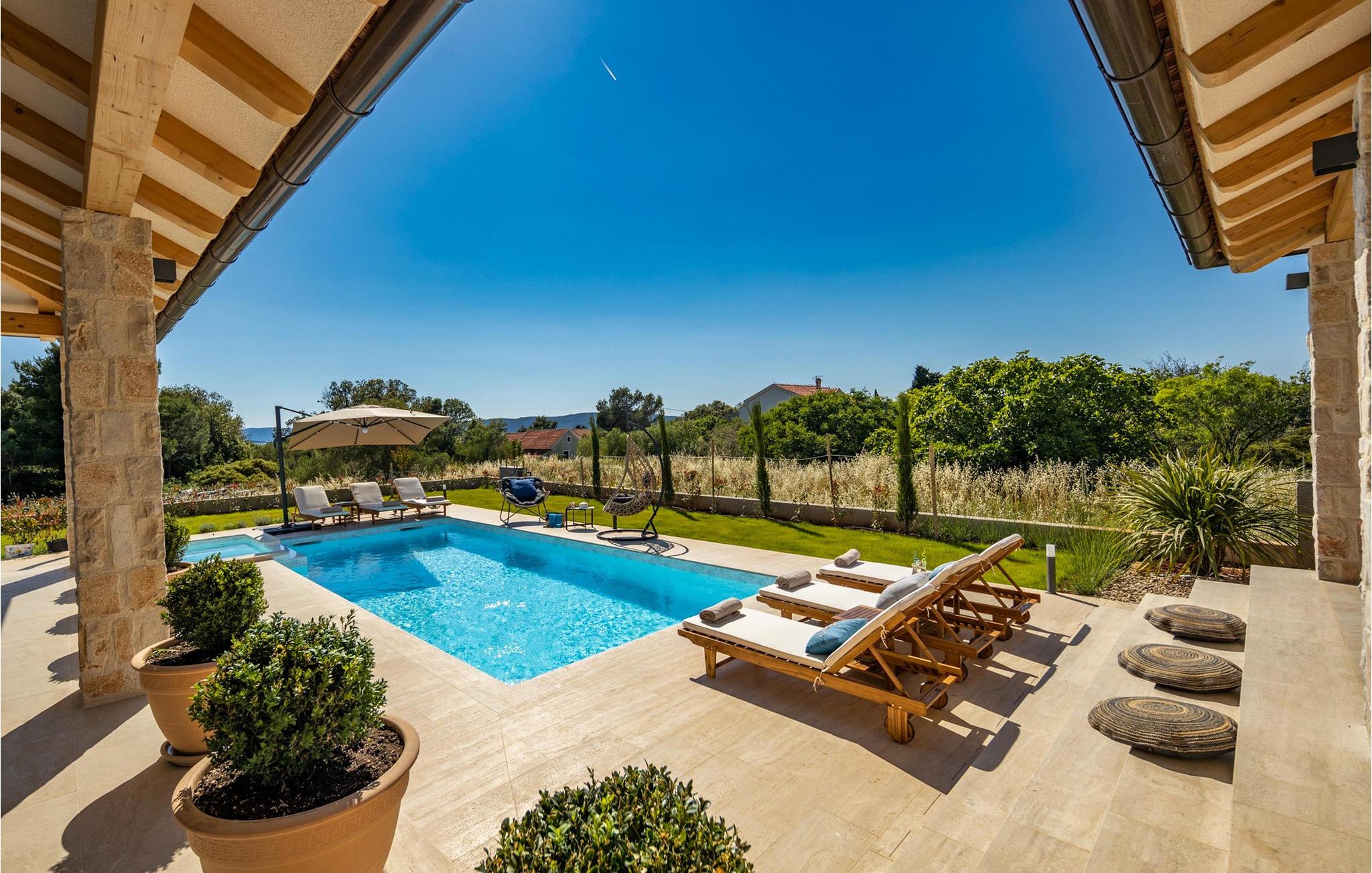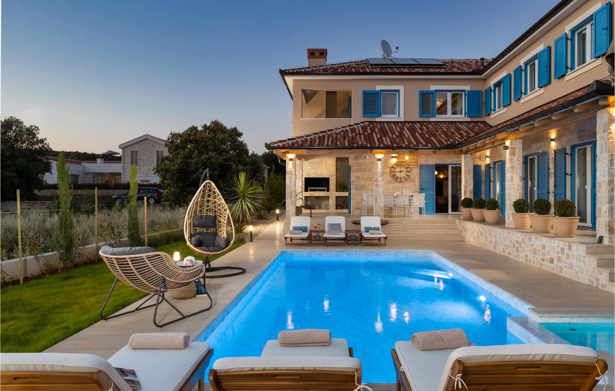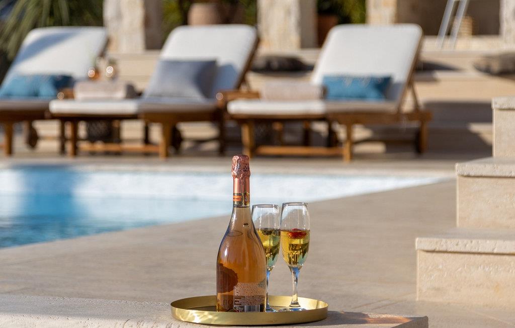 Det lige så fortryllende udendørsområde lokker med en fantastisk pool, hvor I kan snuppe en frisk dukkert når som helst på dagen, mens den blide havbrise kærtegner jeres ansigt, og I lader op på behagelige liggestole. Nyd en drink ved solnedgang, spil bordtennis, badminton eller dart, og server middelhavsdelikatesser på den indbydende terrasse.