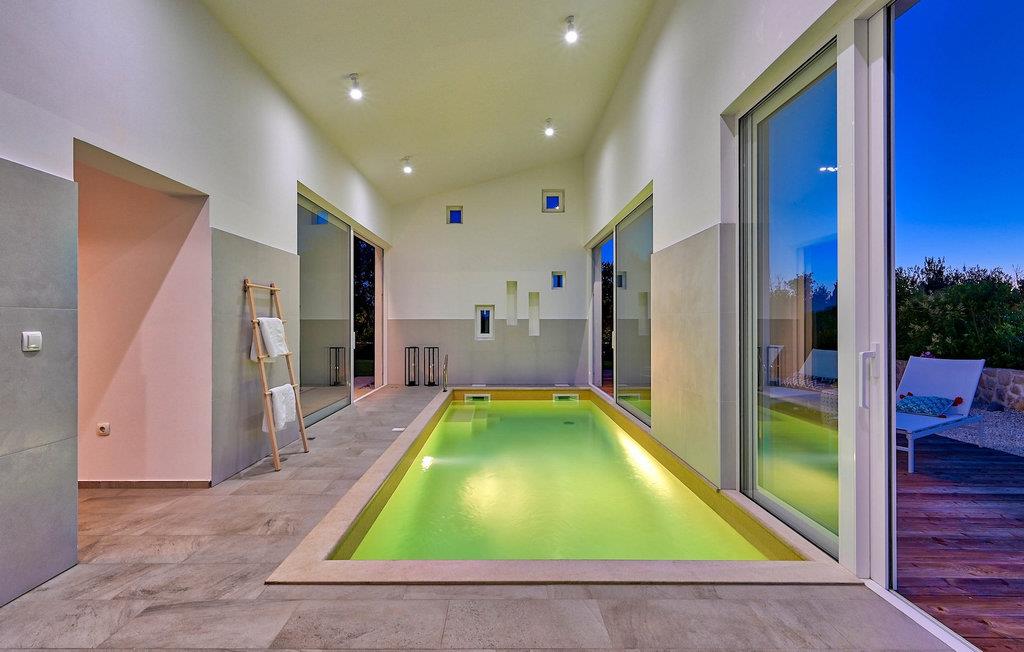 Villa Vela Muline er en smuk villa beliggende i idylliske omgivelser tæt på havet. Villa Vela Muline er virkelig speciel, da den har en opvarmet indendørs pool med store glasskydedøre, så selvom vejret er dårligt, kan du nyde at svømme. Villaen er ideel til en afslappende familieferie for op til 10 gæster. Den overordnede følelse af villaen er luftig med en masse naturligt lys. Villaen har en åbent koncept stue med et fuldt udstyret køkken og spisebord til 10 gæster i stueetagen. Den moderne indrettede stue er den centrale del af villaen, og på venstre fløj fortsætter den til wellness-zonen med indendørs pool. Mod højre fløj er den forbundet med køkkenet med spiseplads. Mellem stuen, køkkenet til højre og den indendørs pool til venstre er der et dejligt hjørne med en udendørs lounge. I venstre side af wellness er zonen et solterrasse med liggestole, så du kan arbejde på din brunfarve. I stueetagen er der også et soveværelse med eget badeværelse og et "spillerum", der fungerer som et multifunktionelt rum og kan omdannes enten til et legerum for børn, hjemmekontor eller ekstra soveværelse med sovesofa. På første sal er der yderligere 3 soveværelser med eget badeværelse, og der er en stor terrasse, der har en flot udsigt over havet og tilbyder fuldstændig privatliv. Villaen er delvist omgivet af en plejet græsplæne, som er perfekt for børn at løbe rundt eller kæledyr at lege med. Villa Vela Muline ligger i den lille landsby Muline på øen Ugljan. Ugljan er den nærmeste ø til Zadar, det kulturelle og økonomiske centrum i amtet. Det er forbundet med Zadar med mange færgelinjer og kan nås inden for 25 minutter.
