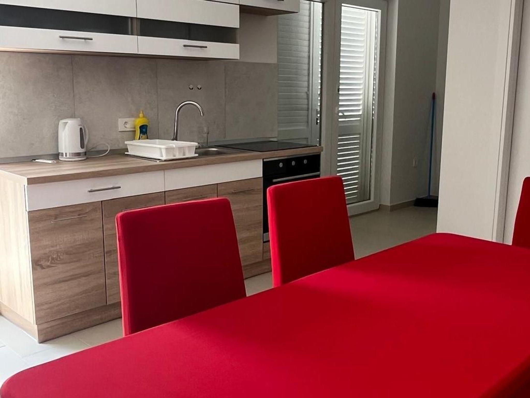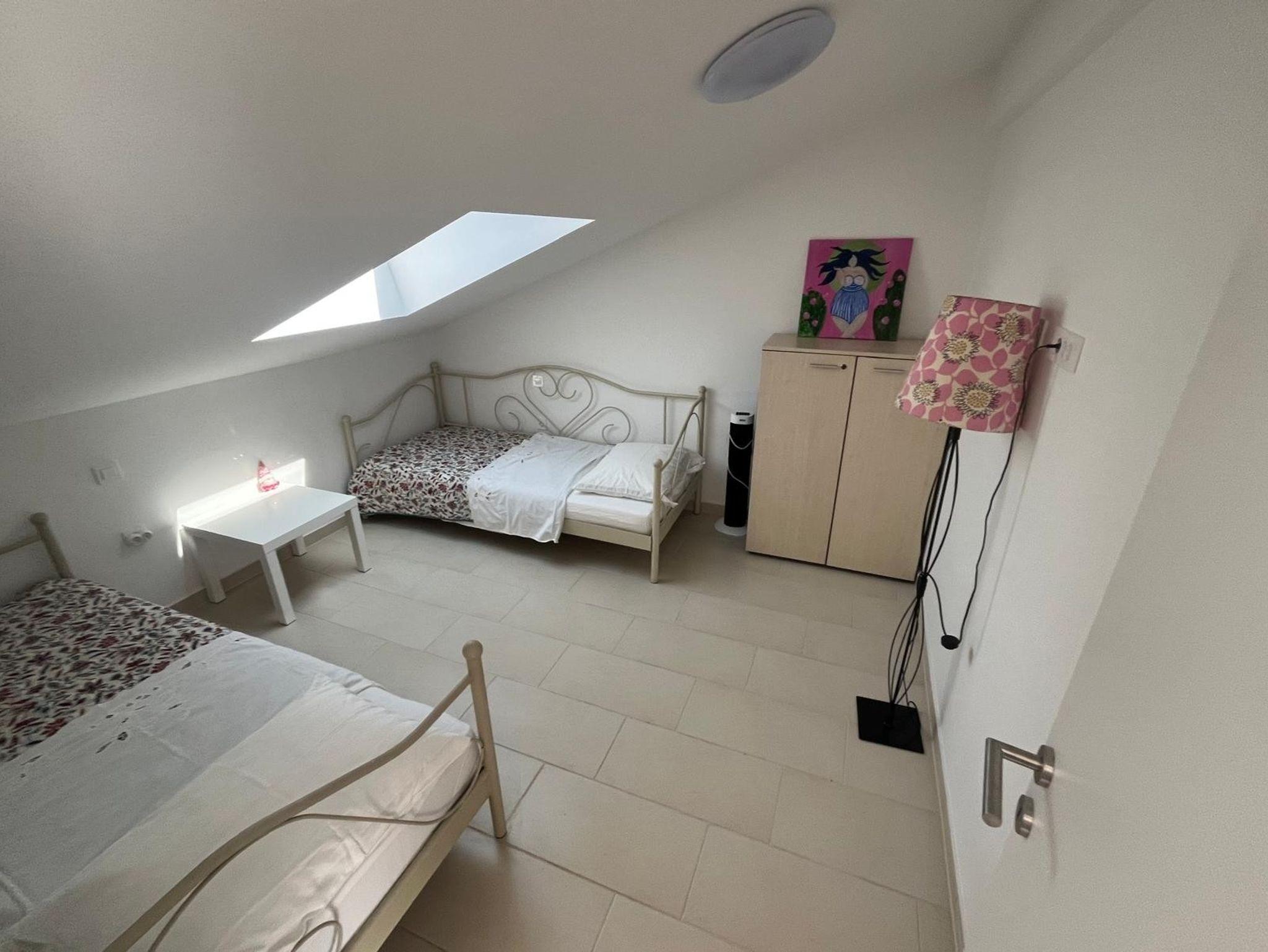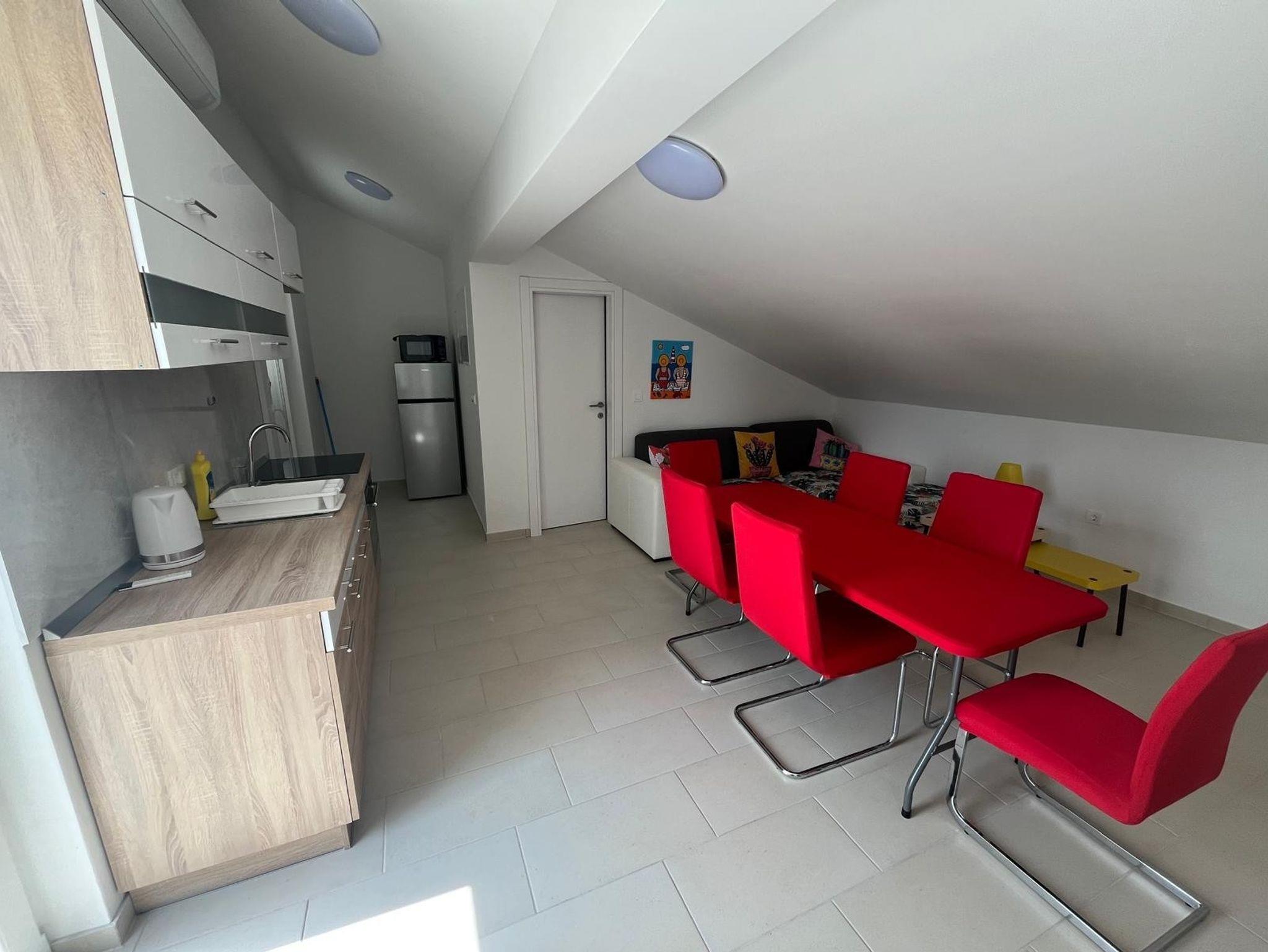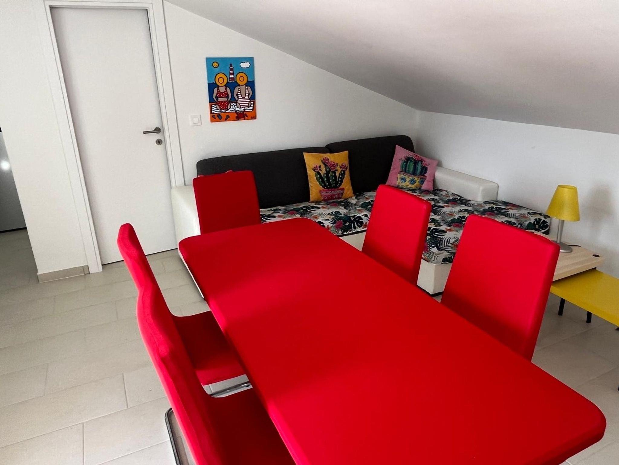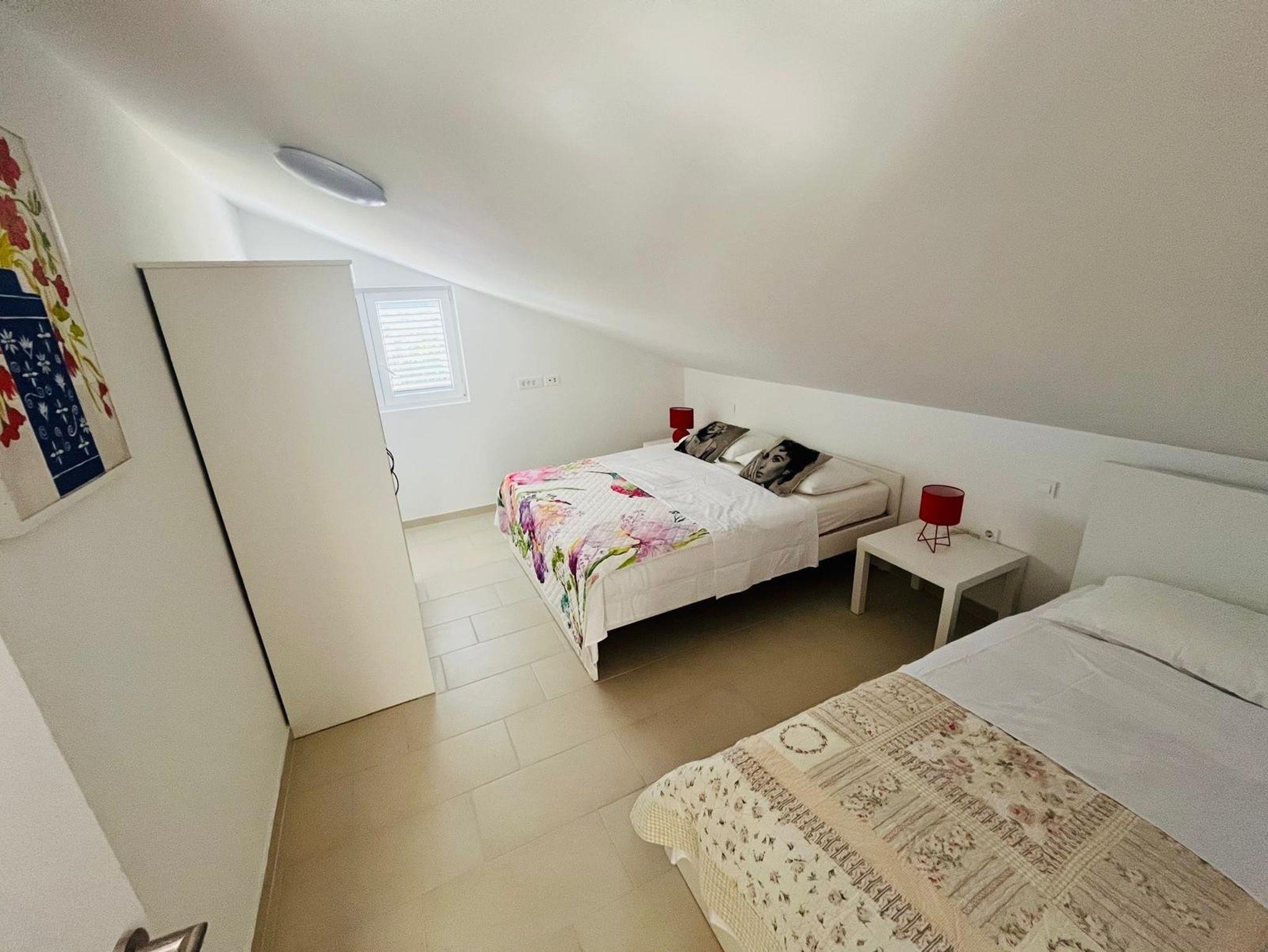 Ferienwohnung bietet Platz für 6 Gäste. Die Betten sind in Schlafzimmern, die es 2 gibt, und in Wohnzimmer, innerhalb einer Gesamtfläche von 45m2, angeordnet. Die Gäste haben eine eigene Terrasse zur Verfügung, auf der sie in warmen Sommernächten genießen können. Das Apartment bietet Meerblick. Es ist erlaubt, Speisen auf dem Gemeinschafts-Grill vorzubereiten. IM PREIS INBEGRIFFEN: Kurtaxe, Endreinigung, Klimatisierung, Parkplatz, Internet, Wäschewaschen, Kinderbett, Bügeleisen, Bügelbrett, Föhn, tragbarer Grill. VERBINDLICHE ZUSÄTZLICHE KOSTEN: Aufzahlung für Kurzaufenthalte (prozentualer Zuschlag pro Nächtigungsanzahl: 30% - 1, 20% - 2, 10% - 3). Die Verfügbarkeit zusätzlicher Dienstleistungen in Ihrem reservierten Termin und die Preise derselben (falls nicht aufgeführt) müssen im Voraus überprüft werden. Zusätzliche Dienstleistungen die in der Zahlungsaufforderung nicht aufgeführt sind werden direkt beim Vermieter bezahlt, angenommen der Gast nutzt auch diese. Ermäßigung auf den Grundpreis: Gratistag 14=13 (bei einem Aufenthalt von 14 Tagen oder mehr erhalten Sie einen Gratistag für den Aufenthalt bis 31.12.26).