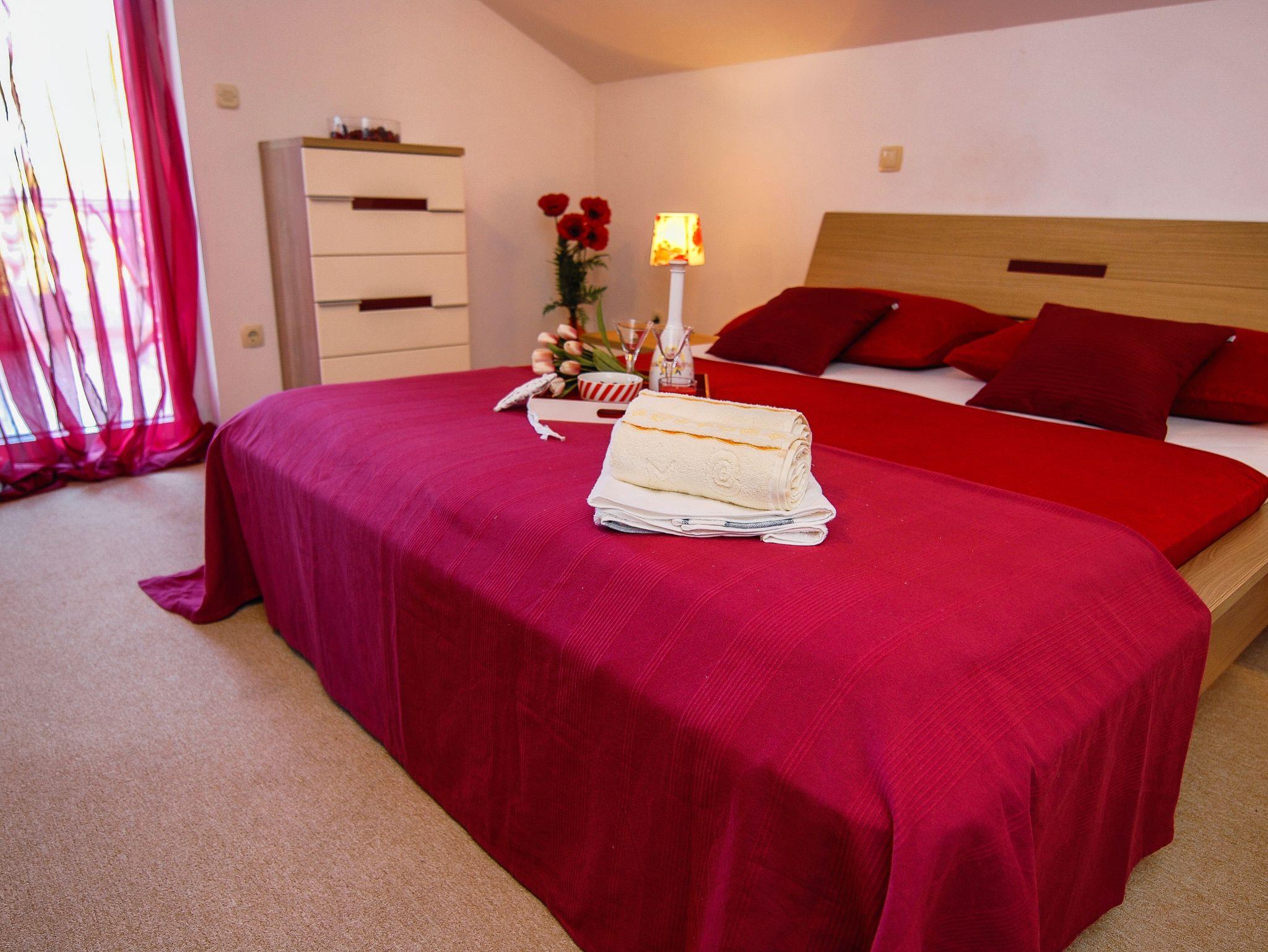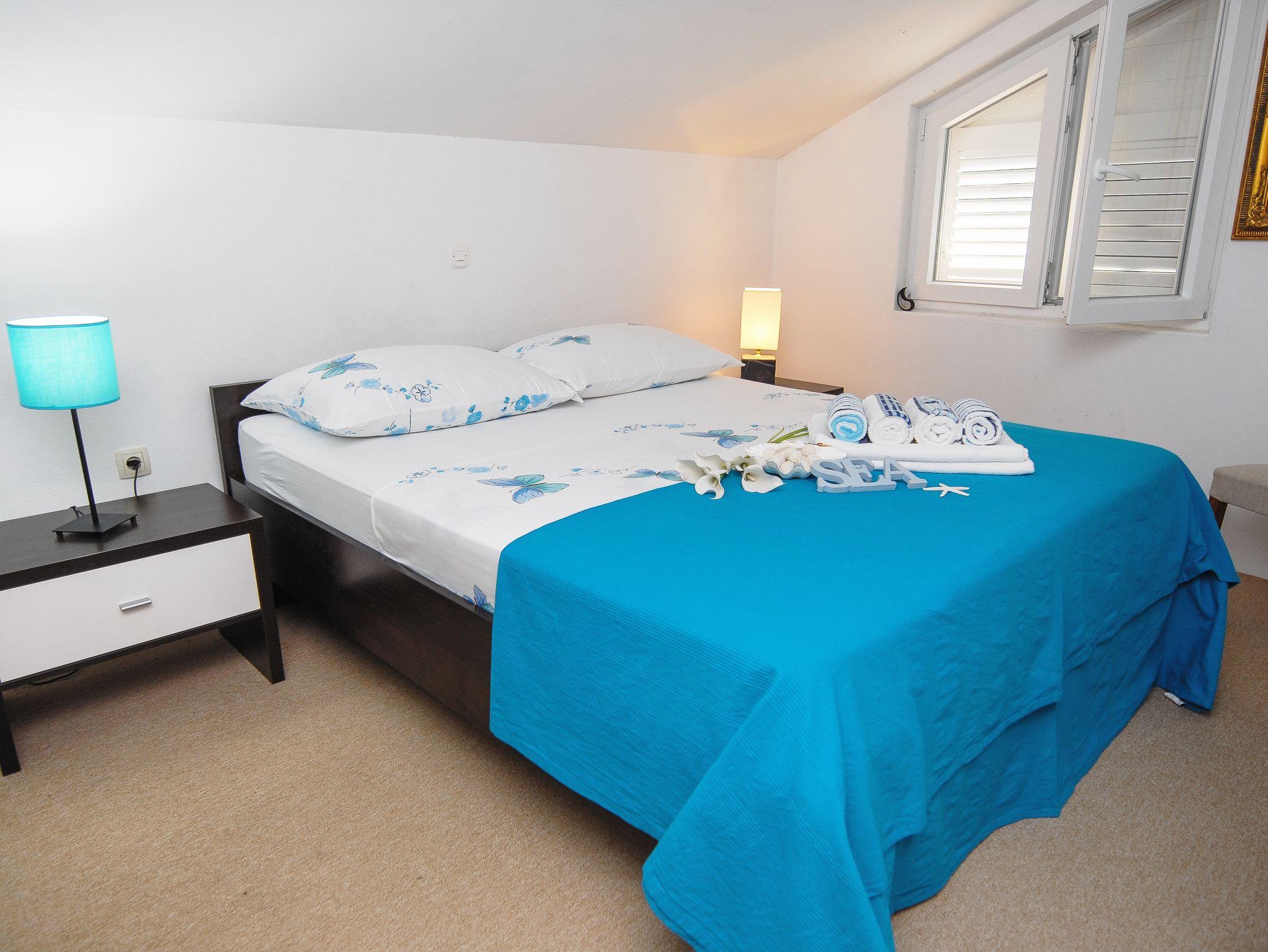 Ferienwohnung bietet Platz für 4 Gäste. Die Betten sind in Schlafzimmern, die es 2 gibt, innerhalb einer Gesamtfläche von 66m2, angeordnet. Die Gäste haben eine eigene Terrasse zur Verfügung, auf der sie in warmen Sommernächten genießen können. Das Apartment bietet Meerblick. Es ist erlaubt, Speisen auf dem Gemeinschafts-Grill vorzubereiten. IM PREIS INBEGRIFFEN: Kurtaxe, Endreinigung, Klimatisierung, Parkplatz, Internet, Kinderbett, Bügeleisen, Bügelbrett, Föhn. VERBINDLICHE ZUSÄTZLICHE KOSTEN: Aufzahlung für Kurzaufenthalte (prozentualer Zuschlag pro Nächtigungsanzahl: 30% - 1, 20% - 2, 10% - 3). Die Verfügbarkeit zusätzlicher Dienstleistungen in Ihrem reservierten Termin und die Preise derselben (falls nicht aufgeführt) müssen im Voraus überprüft werden. Zusätzliche Dienstleistungen die in der Zahlungsaufforderung nicht aufgeführt sind werden direkt beim Vermieter bezahlt, angenommen der Gast nutzt auch diese.