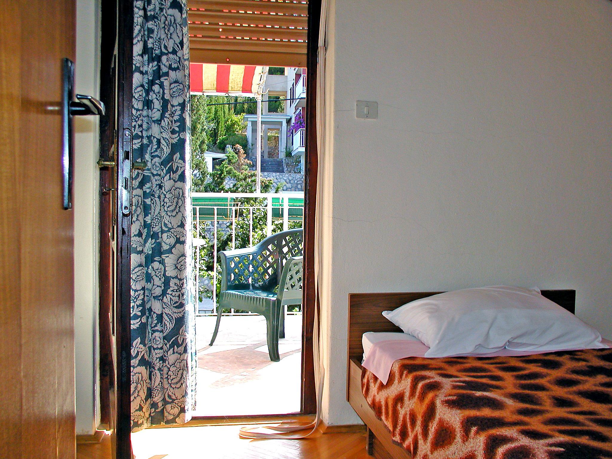 3-room apartment 46 m2 on 2nd floor. Living/dining room with sloping ceilings with 1 bed, satellite TV and air conditioning. Exit to the balcony. 1 double bedroom. 1 room with 1 bed. Kitchenette (2 hot plates). Shower/WC. Air-conditioning (extra). No heating option. Balcony 15 m2. Terrace furniture. Side view of the sea. Facilities: Internet (WiFi, free). Access to the single room from the landing shared with apartment HR4210.130.2, or from the hallway.