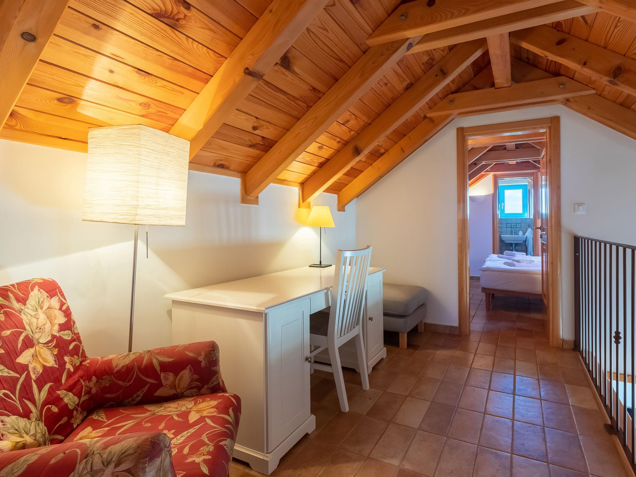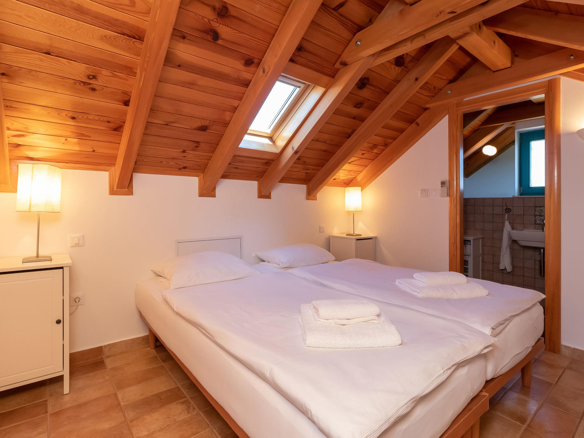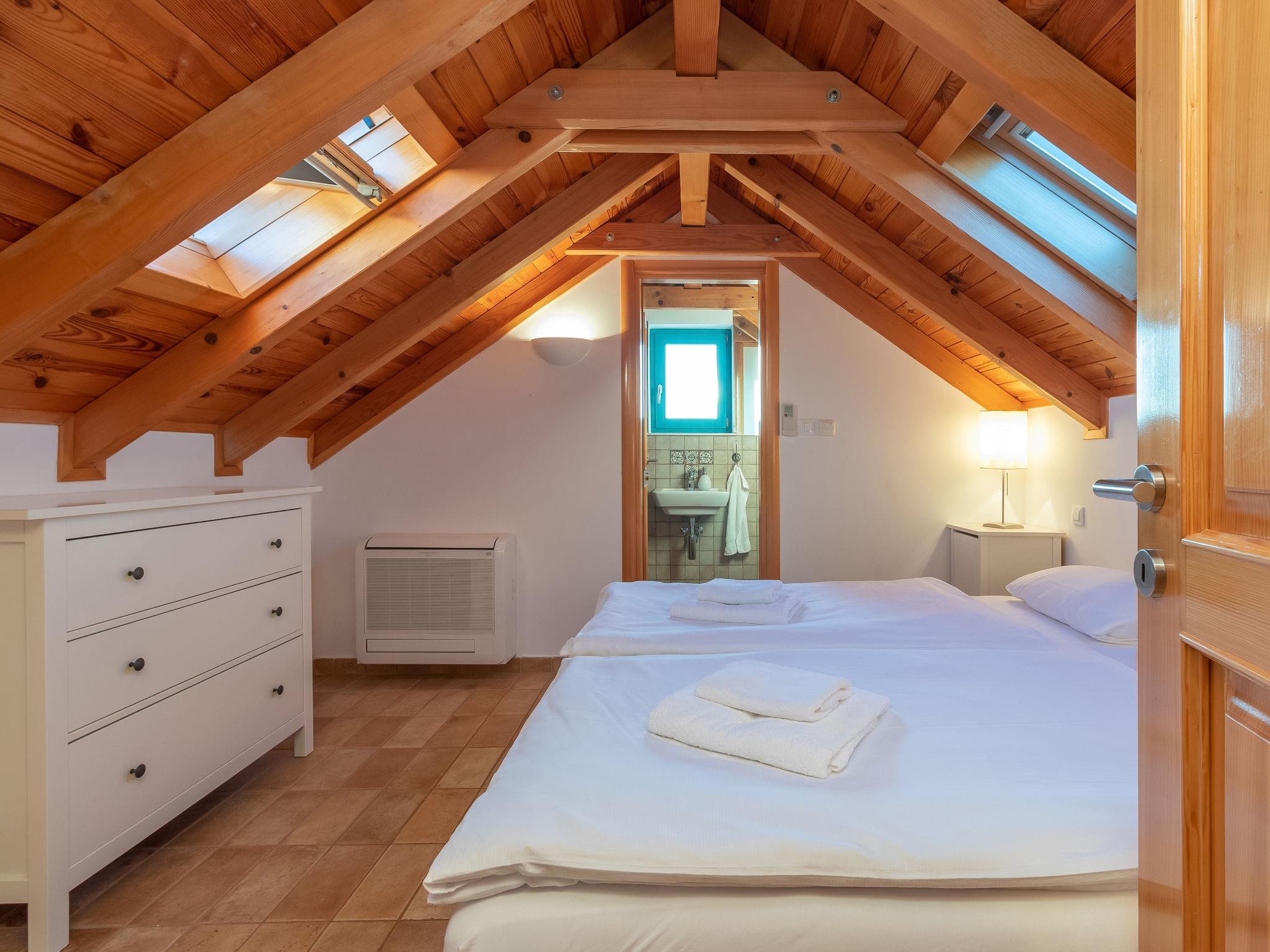 4-room house 105 m2 on 2 levels. Tasteful and cosy furnishings: living/dining room 28 m2 with 1 double sofabed (160 cm, length 200 cm), satellite TV and air conditioning. Exit to the terrace. 1 room 18 m2 with 1 french bed (180 cm, length 200 cm), shower/WC, satellite TV and air conditioning. Open kitchen (oven, dishwasher, 4 ceramic glass hob hotplates, toaster, kettle, microwave, freezer, electric coffee machine) with air conditioning. Exit to the garden. Shower/WC. Top floor: 2 rooms 17 m2, with sloping ceilings, ceiling height 110 - 245 cm with rooflight, each room with 2 beds (90 cm, length 200 cm), shower/WC and air conditioning. Forced-air heating. No heating option. Terrace 35 m2, roofed. Terrace furniture. Very beautiful panoramic view of the sea. Facilities: safe, iron, mosquito net, children's high chair, baby cot. Internet (WiFi, free). Please note: non-smoking house. On the ground floor (separate, external entrance): shower/WC.