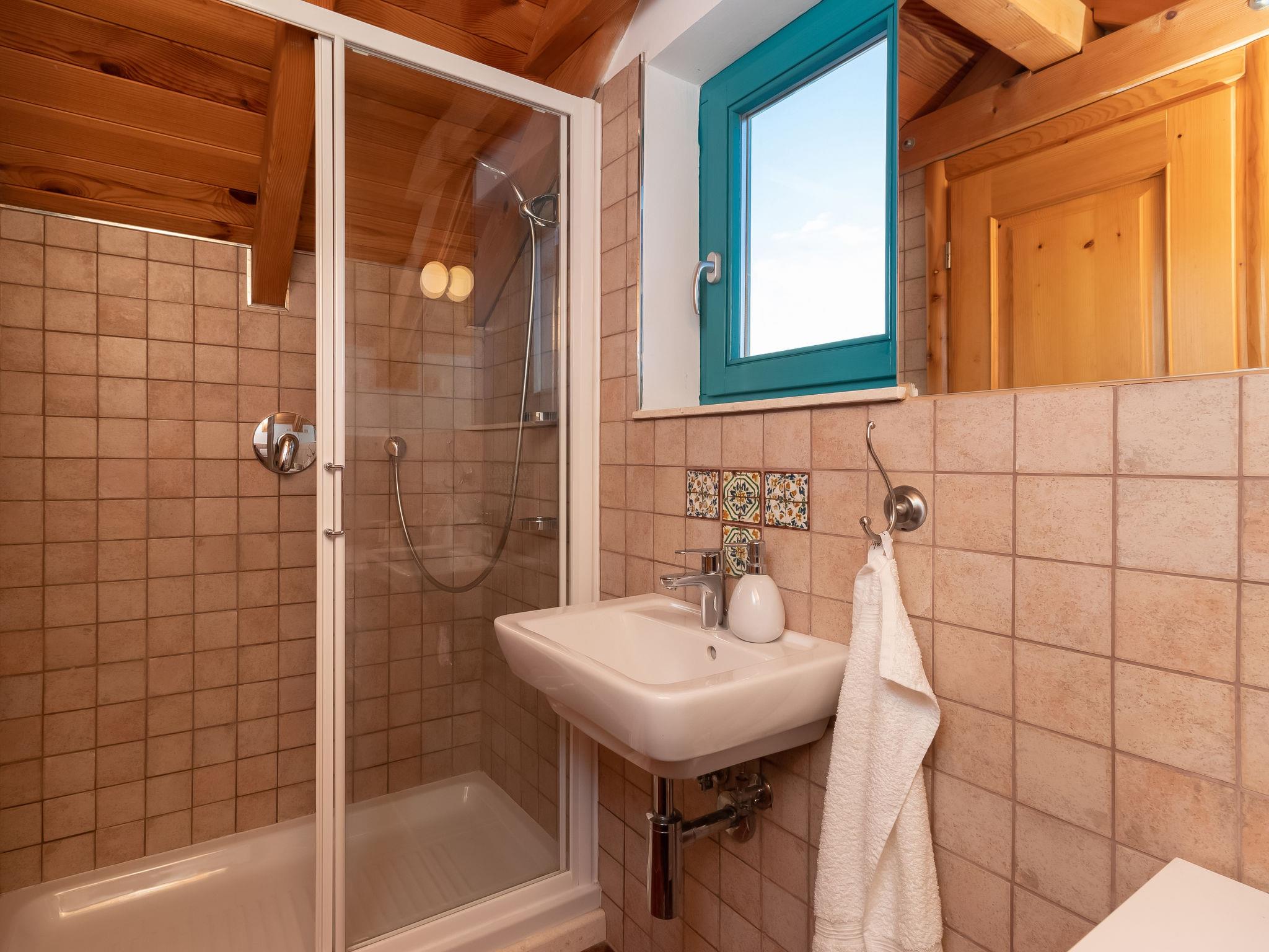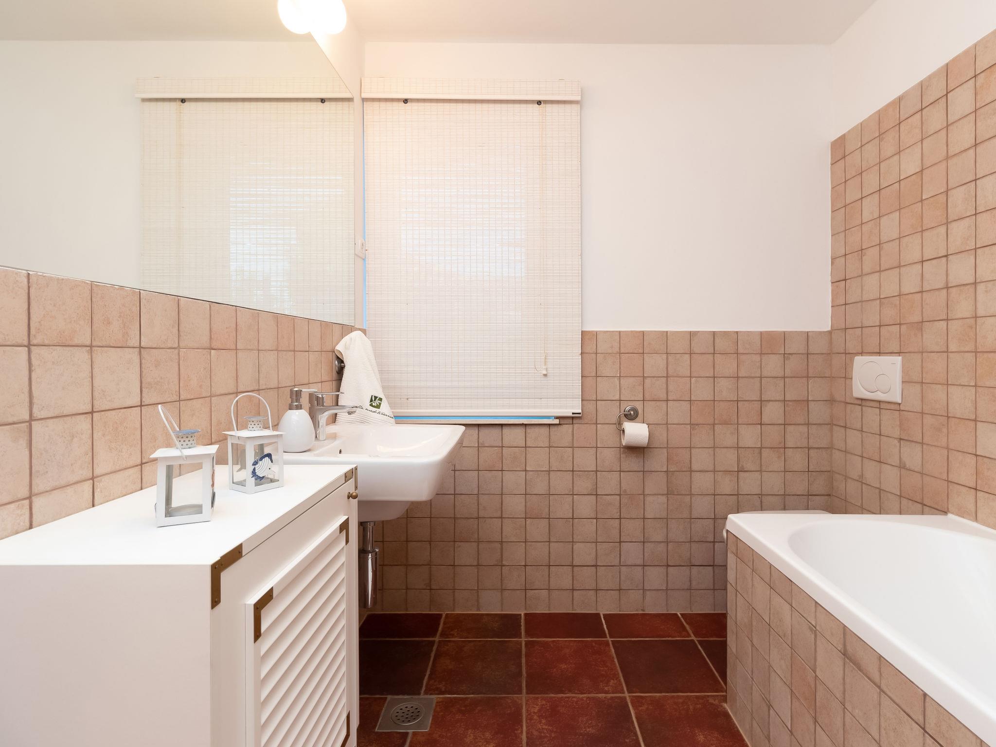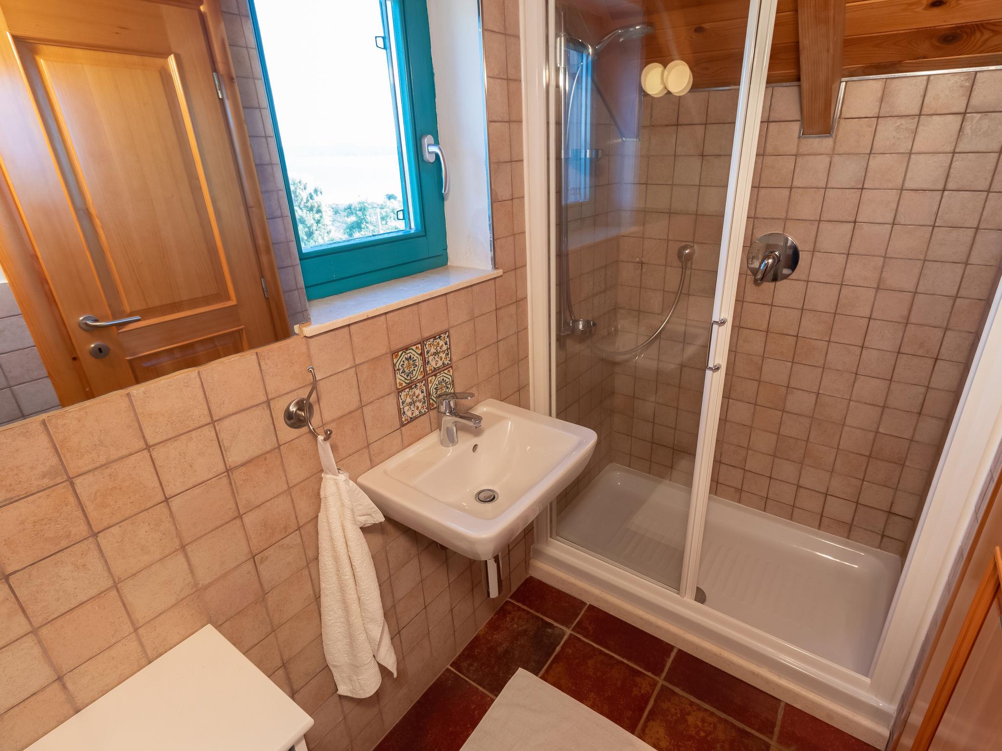4-room house 105 m2 on 2 levels. Tasteful and cosy furnishings: living/dining room 28 m2 with 1 double sofabed (160 cm, length 200 cm), satellite TV and air conditioning. Exit to the terrace. 1 room 18 m2 with 1 french bed (180 cm, length 200 cm), shower/WC, satellite TV and air conditioning. Open kitchen (oven, dishwasher, 4 ceramic glass hob hotplates, toaster, kettle, microwave, freezer, electric coffee machine) with air conditioning. Exit to the garden. Shower/WC. Top floor: 2 rooms 17 m2, with sloping ceilings, ceiling height 110 - 245 cm with rooflight, each room with 2 beds (90 cm, length 200 cm), shower/WC and air conditioning. Forced-air heating. No heating option. Terrace 35 m2, roofed. Terrace furniture. Very beautiful panoramic view of the sea. Facilities: safe, iron, mosquito net, children's high chair, baby cot. Internet (WiFi, free). Please note: non-smoking house. On the ground floor (separate, external entrance): shower/WC.