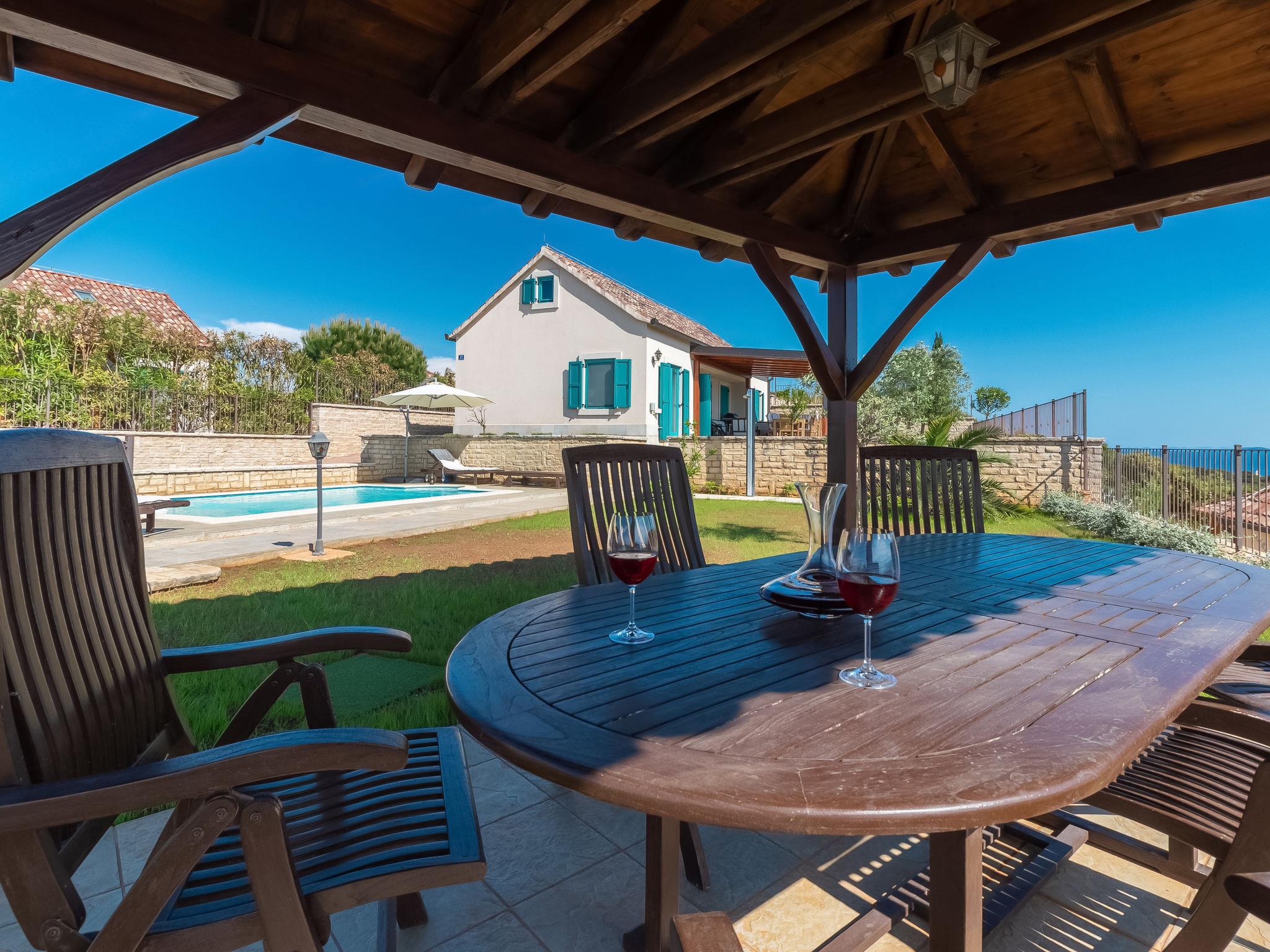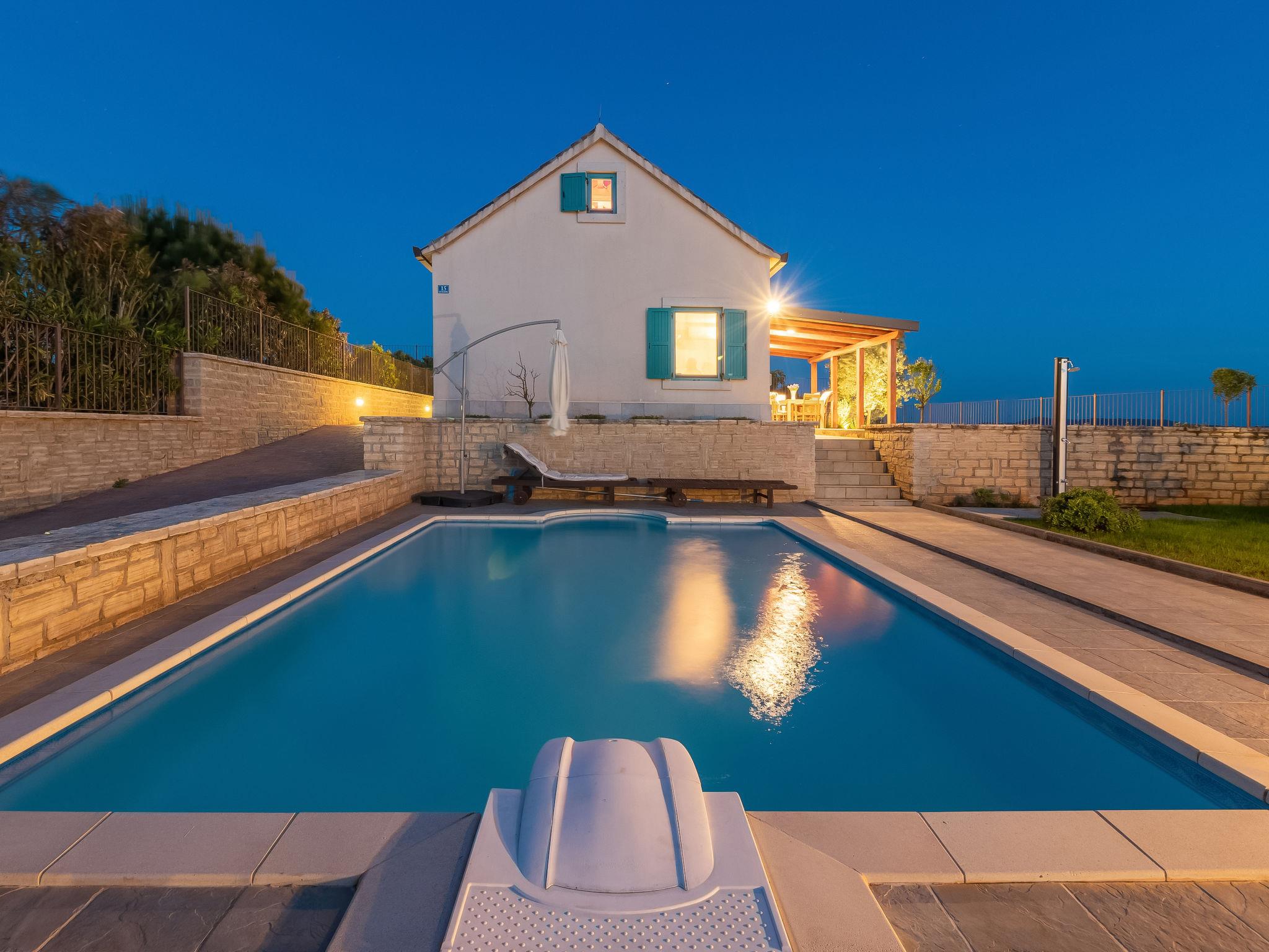 Guduce: Beautiful single-family house "Villa Bugenvila", 2 storeys. 2.5 km from the centre of Ugljan, 2 km from the centre of Muline, in a quiet, sunny position, 200 m from the sea, 200 m from the beach. Private: property 525 m2 (fenced), beautiful garden with lawn and wildlife garden, swimming pool angular, heated (6 x 4 m, depth 150 cm, seasonal availability: 15.May. - 01.Oct.) with internal staircase. Outdoor shower, arbour (12 m2), garden furniture, barbecue. In the house: internet access, storage room for bicycles, washing machine. Available: children's bicycles (1). Motor access to the house (200 m via unmade road). Parking (for 2 cars) at the house on the premises. Shop 2.5 km, supermarket 2.5 km, restaurant 2.5 km, café 2.5 km, bus stop 21.7 km, pebble beach 200 m. Please note: suitable for families. The owner does not accept any youth groups. Building work taking place 20m from the property.