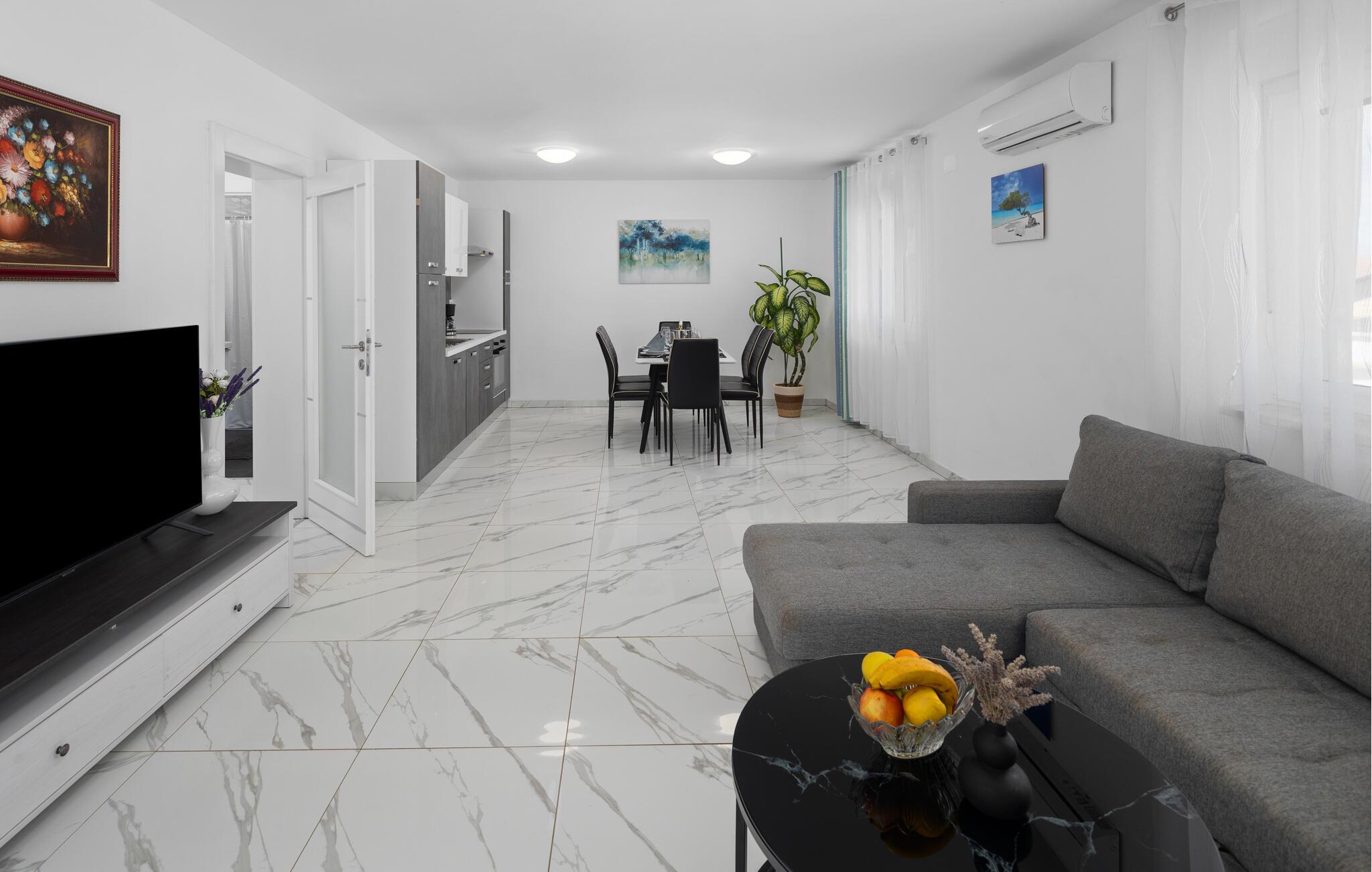 Velkommen til lejlighedens attraktive, moderne rum, som giver jer optimale rammer til en ferie med strandture, udforskning af omgivelserne og hyggelige aftener sammen, for eksempel i den indbydende sofa.