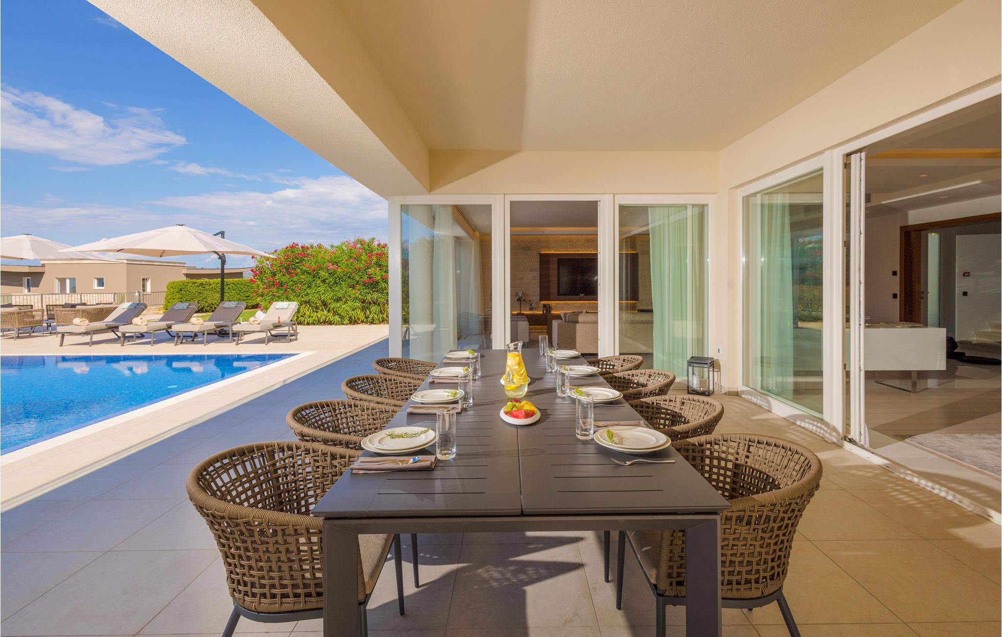 Det luksuriøse interiør fortsætter udenfor. Her kan I slappe af i solen og skyggen, bade i solen på liggestolene ved poolen og tilberede jeres livretter på grillen om aftenen. Her finder I kort sagt alt, hvad I behøver til den ideelle ferieafslapning.