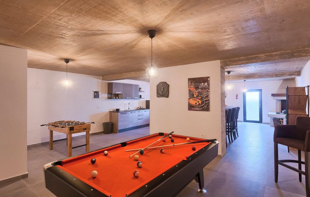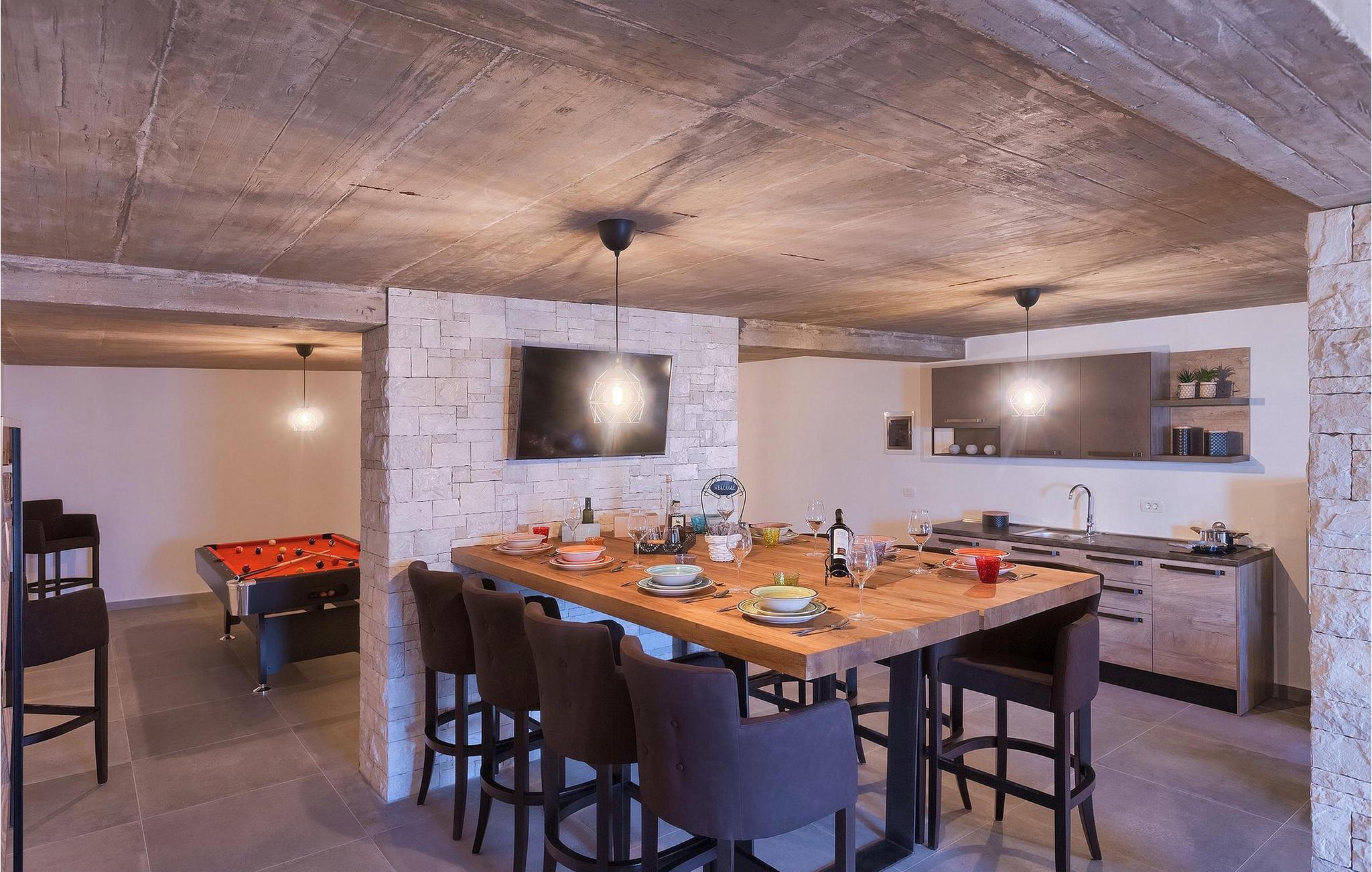 Den stilfulde villa Dolcea er en fire-værelses villa beliggende i den charmerende landsby Kastel cirka 8 km fra havet. Villaen er perfekt for alle, der ønsker at nyde en fredelig atmosfære og idyllisk natur. Kan du bare forestille dig at slappe af på de komfortable liggestole ved den private pool? Stueetagen består af en moderne indrettet stue, to hyggelige dobbeltværelser og et fuldt udstyret, rummeligt køkken og spisestue, begge fuld af lys. På første sal finder du de to andre soveværelser. Bortset fra ved poolen kan du nyde den istriske sol på den dejlige terrasse på første sal. Et ekstra køkken, hvor du kan tilberede lækre måltider til din familie og venner, er placeret under stueetagen, samt et underholdningsrum. De konkurrencedygtige, der ikke ønsker at slappe af ved poolen hele dagen, kan nyde at spille dart, pool på det professionelle billardbord eller bordfodbold. Villaen har aircondition, der er tv i hvert værelse, og hvert soveværelse har eget badeværelse. Som hendes navn siger, vil du tilbringe den sødeste ferie i Villa Dolcea. Vila Dolcea ligger i Kastel, en istrisk landsby tæt på kystbyen Umag. Umag tilbyder et stort udvalg af fritidsaktiviteter, turistfaciliteter samt en lille havn. Fremragende restauranter, barer og caféer kan findes i dens brostensbelagte gader. Gå ikke glip af din chance og prøv nogle trøfler, istrisk prosciutto, fisk og skaldyrsspecialiteter og lokal ost. I dag er Umag især kendt for sport: hver juli finder Croatia Open (en del af ATP World Tour 250-serien) sted der, med mange store navne fra mændenes tennisverden. Ikke langt væk fra Umag ligger også det prisvindende vandland Istralandia, ideelt til en sjov dag for hele familien. Kanegra-stranden, som er tættest på vilaen, er en lang stenstrand og en af de mest attraktive i Istrien.