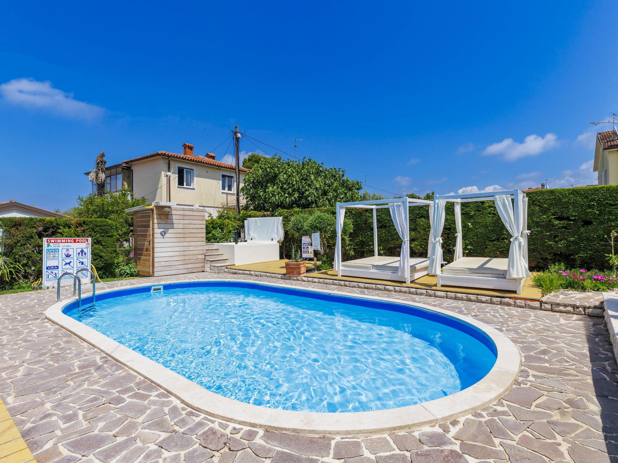 Apartment house "Nika". In the district of Punta 2 km from the centre of Umag, in a sunny position, 300 m from the sea, 300 m from the beach. For shared use: property 1'500 m2 (fenced), well-kept garden, swimming pool (8 x 4 m, depth 135 cm, seasonal availability: 25.Apr. - 19.Sep.). Outdoor shower, hot tub, barbecue. In the house: internet access, bicycles available (extra). Available: boat (extra). Parking. E-charging station. Shop, restaurant 500 m, bus stop 1.9 km, pebble beach 300 m. Tennis 200 m, children's playground 20 m. For shared use: hot tub available from 15.05. - 15.09. Video surveillance of the driveway and parking.
