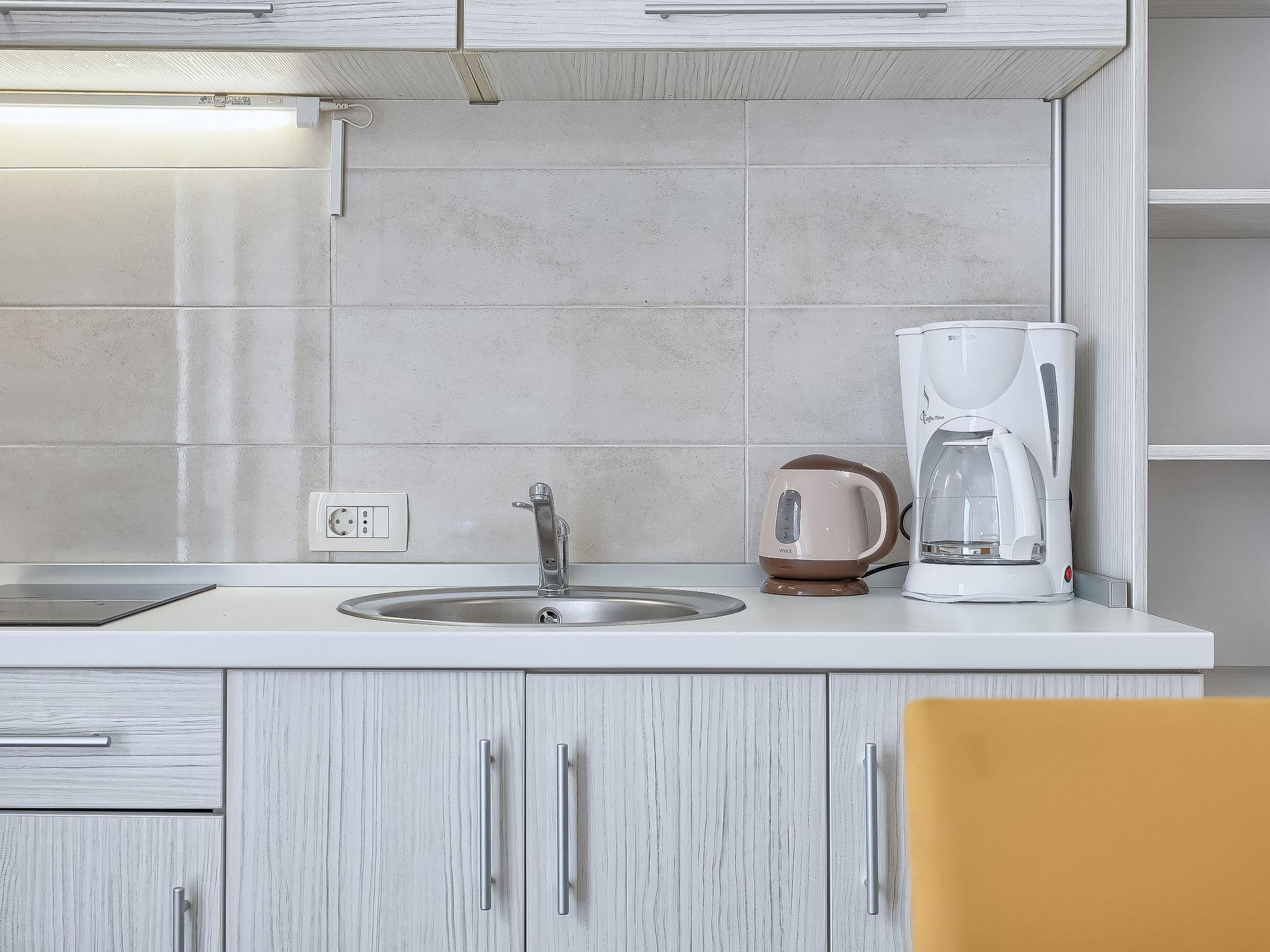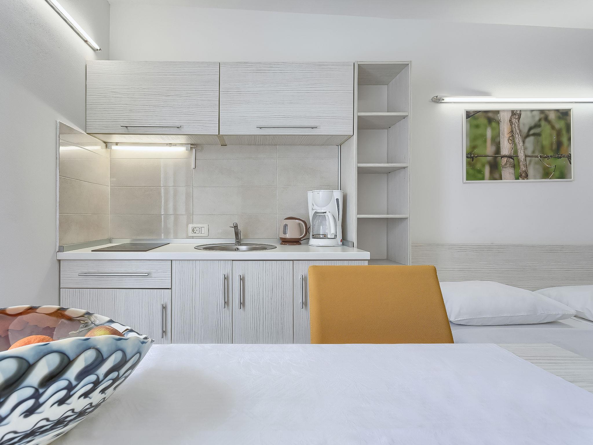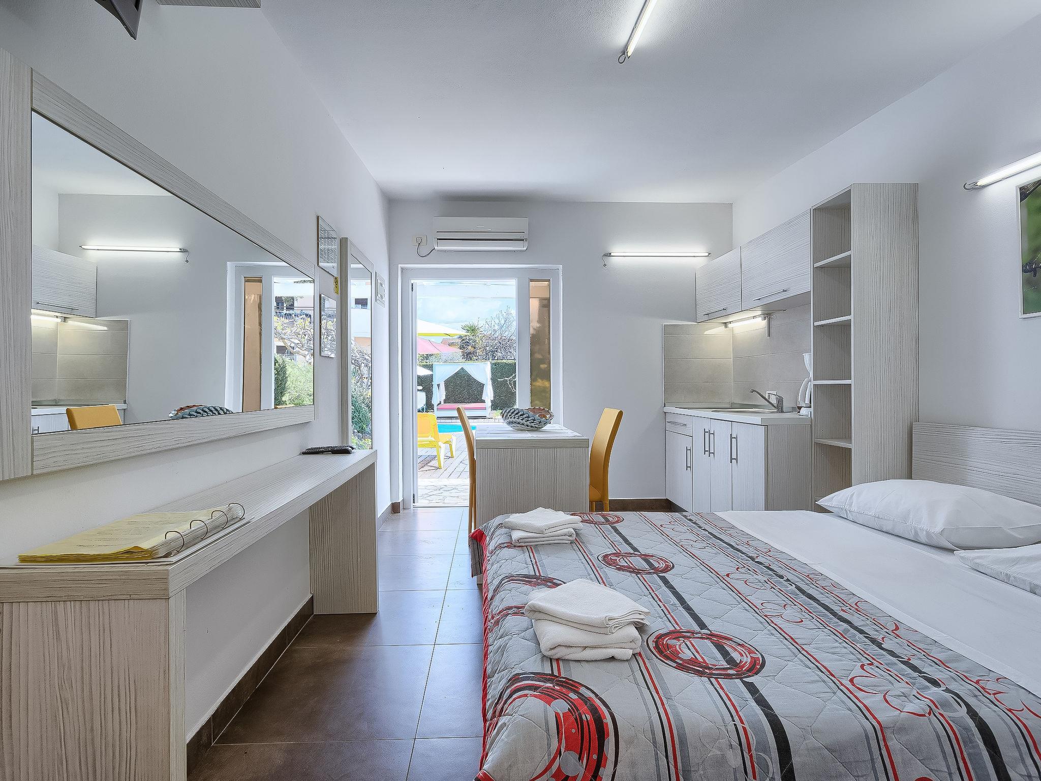 1-room apartment 18 m2, on the ground floor. Studio with 1 french bed (160 cm, length 200 cm), satellite TV (flat screen), air conditioning. Exit to the terrace, to the swimming pool. Open kitchen (2 ceramic glass hob hotplates, microwave) with dining table. Shower/WC. Terrace 6 m2, roofed. Terrace furniture. View of the swimming pool. Facilities: Internet (WiFi, free).