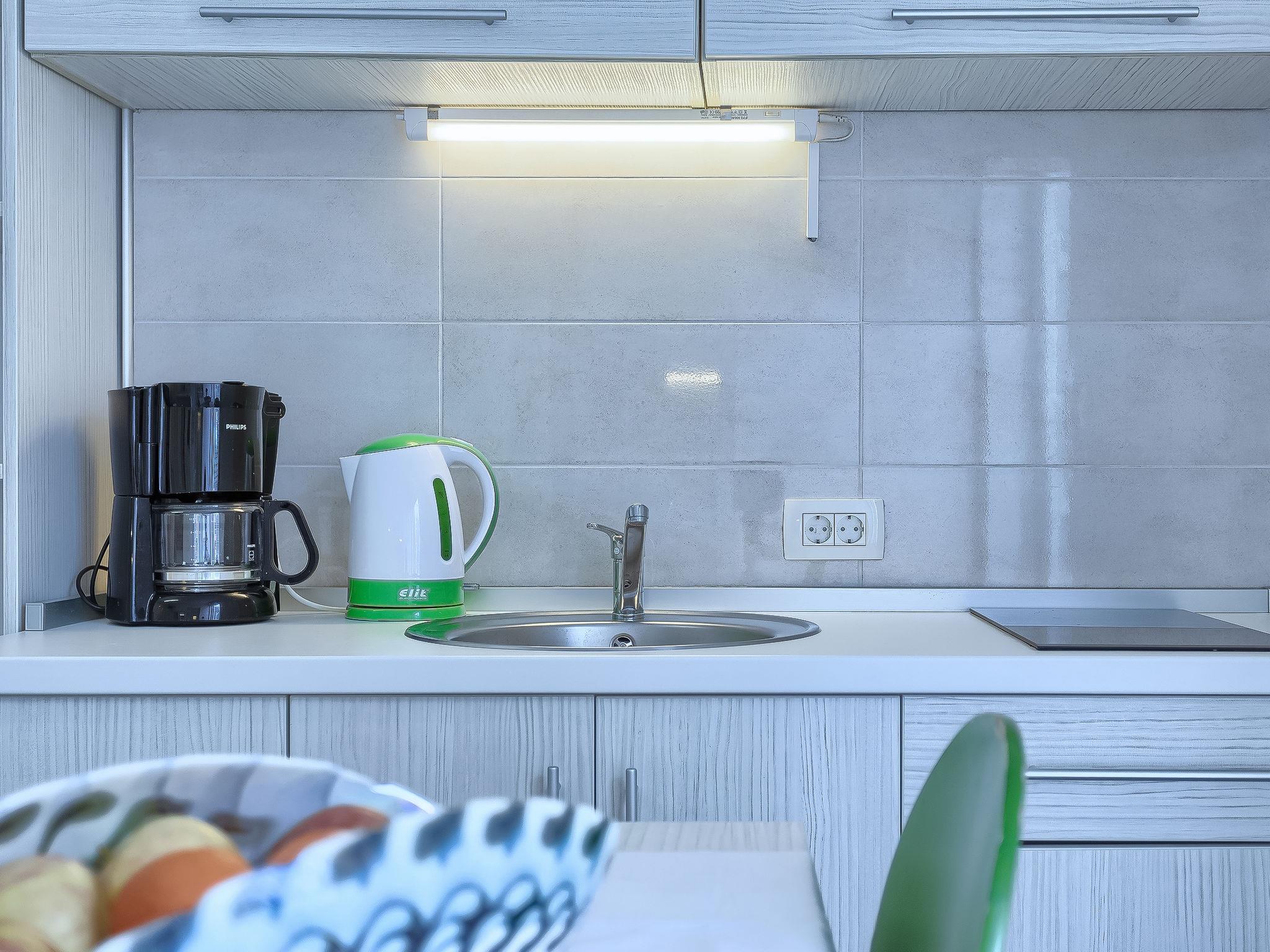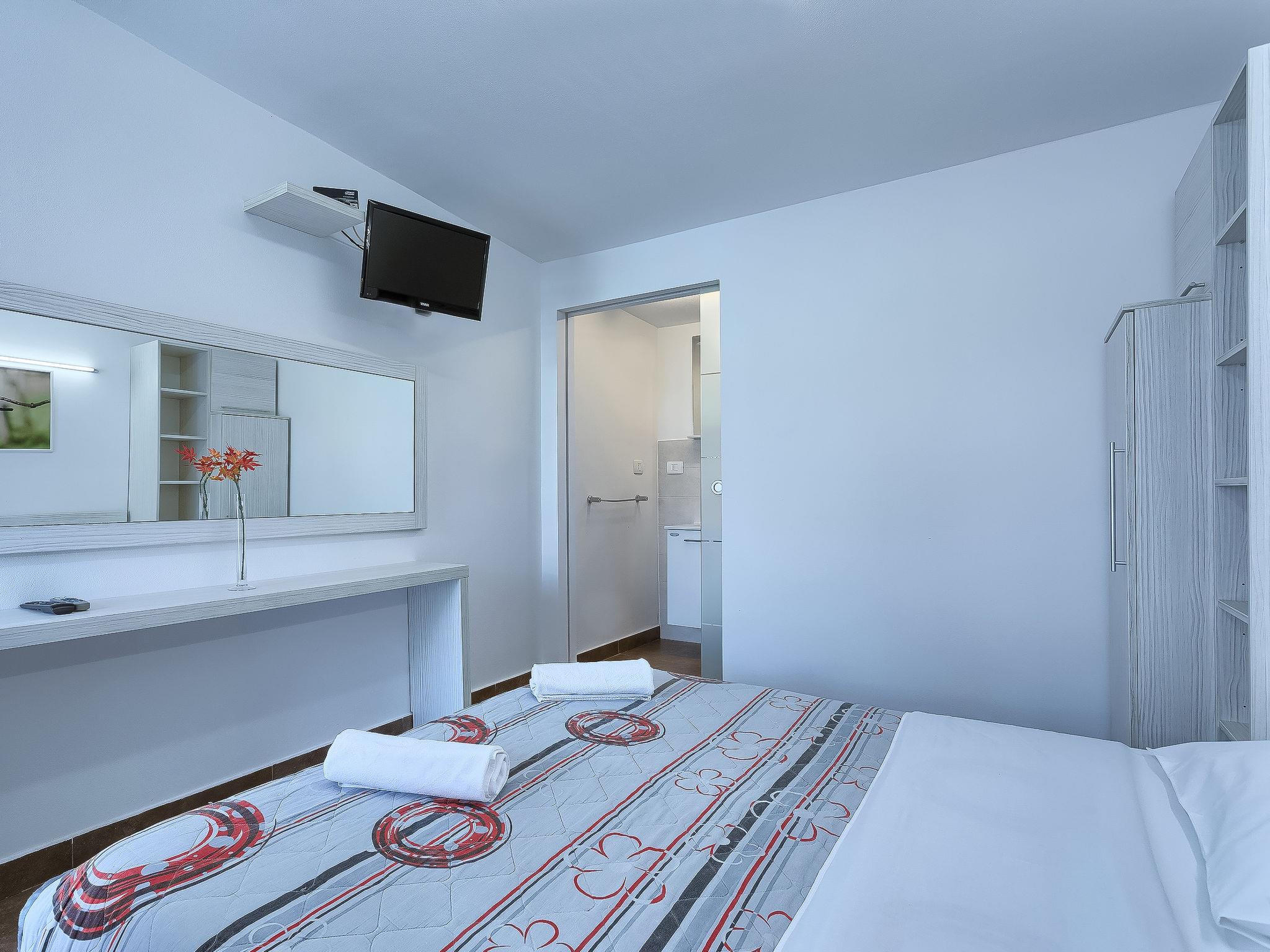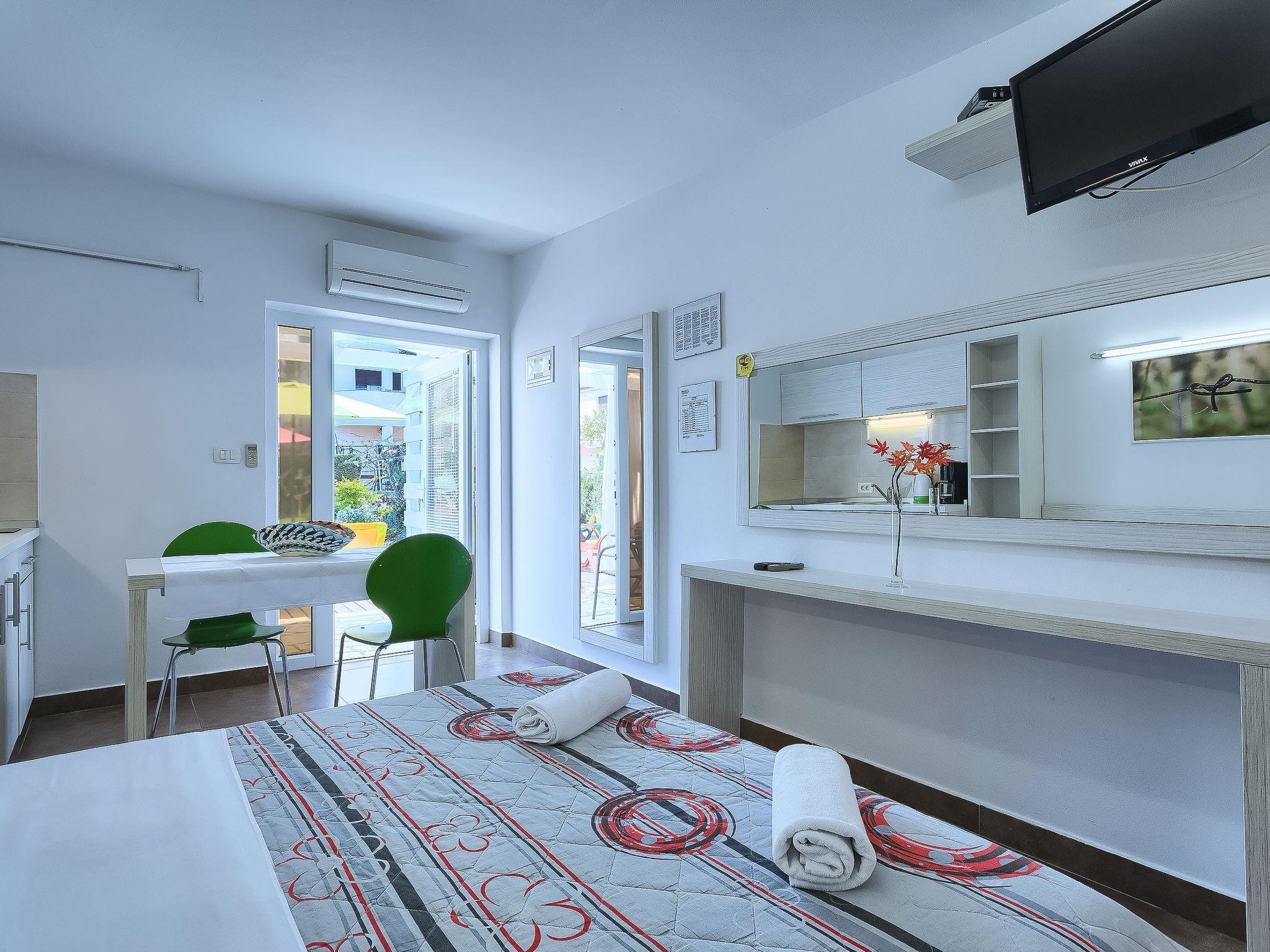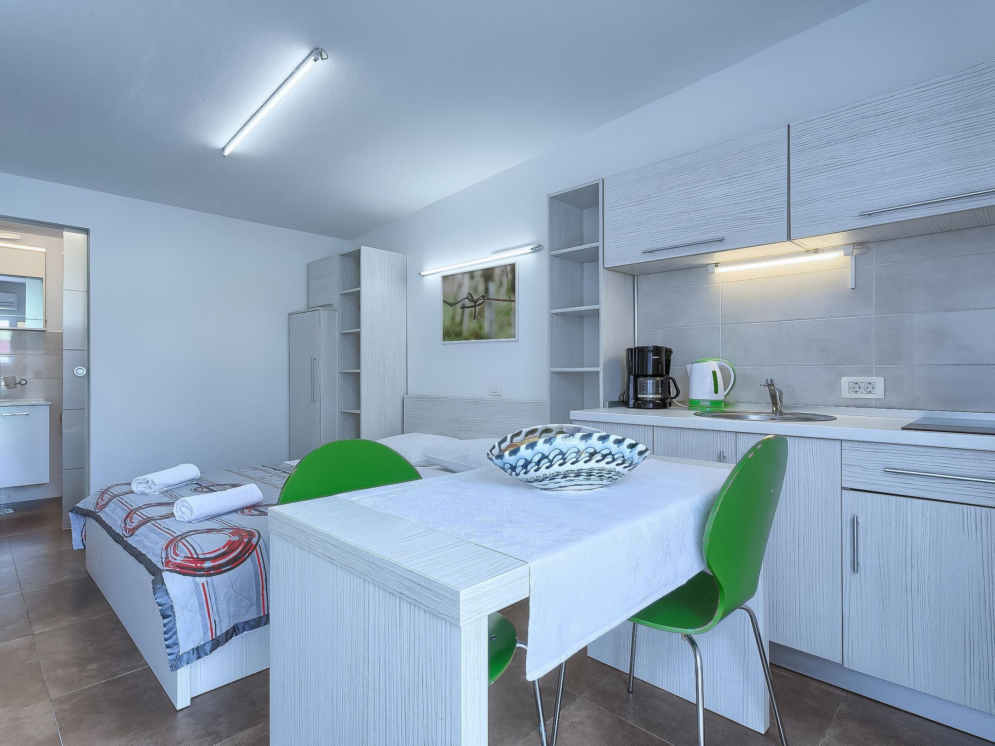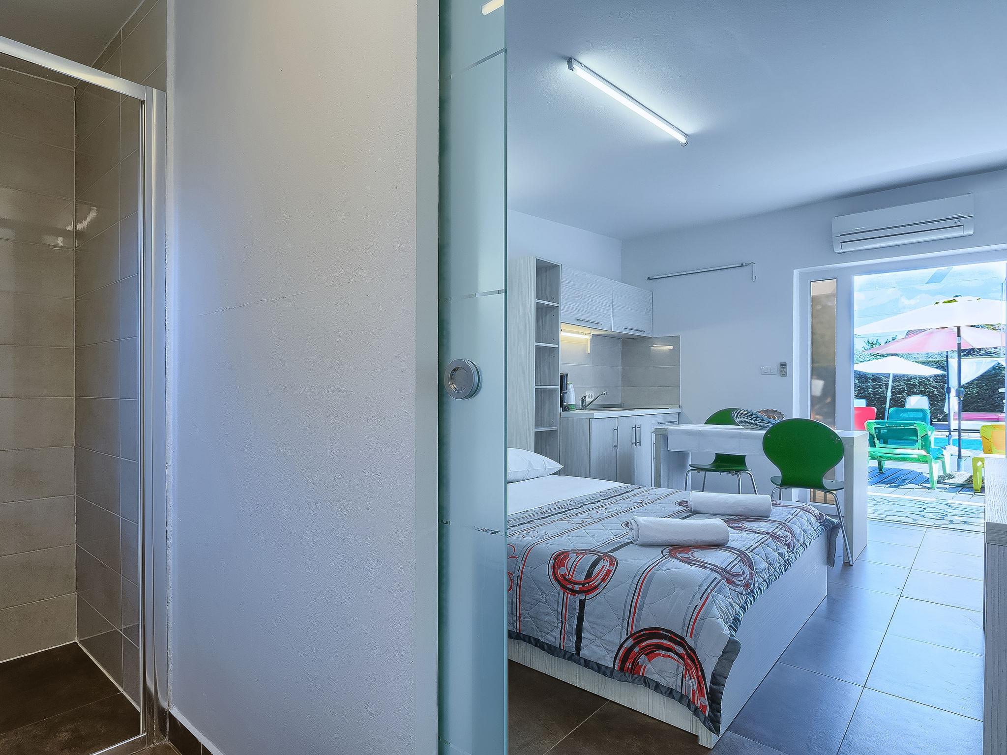 1-room apartment 18 m2, on the ground floor. Studio with 1 french bed (160 cm, length 200 cm), satellite TV (flat screen), air conditioning. Exit to the terrace, to the swimming pool. Open kitchen (2 ceramic glass hob hotplates, microwave) with dining table. Shower/WC. Terrace 6 m2, roofed. Terrace furniture. View of the swimming pool. Facilities: Internet (WiFi, free).