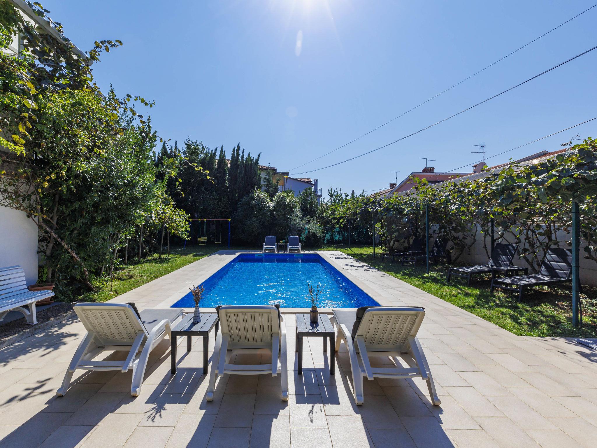 Beautiful single-family house "Villa Toni", 2 storeys. 500 m from the centre of Umag, in a quiet, sunny position, 800 m from the sea, from the beach. Private: property 1'200 m2 (fenced), beautiful garden with lawn and wildlife garden, swimming pool angular (10 x 4 m, depth 140 cm, seasonal availability: 27.Apr. - 12.Oct.) with internal staircase and salt-electrolysis pool-cleaning system. WC in the pool area, outdoor shower, terrace (30 m2), garden furniture, barbecue. In the house: internet access, table tennis, storage room for bicycles, washing machine. Parking (for 3 cars) at the house on the premises. Shop, restaurant 200 m, bus stop 1.4 km, sandy beach, pebble beach 800 m. Golf course (18 hole) 10 km, tennis 1 km, walking paths from the house 100 m, cycle lane 150 m. The owner does not accept any youth groups. Neighbourhood highly sensitive to noise. Quietness and good behaviour expected. Ground floor is closed and not occupied. Outdoor kitchen (4 ceramic glass hob hotplates). Organizing a party is not allowed.