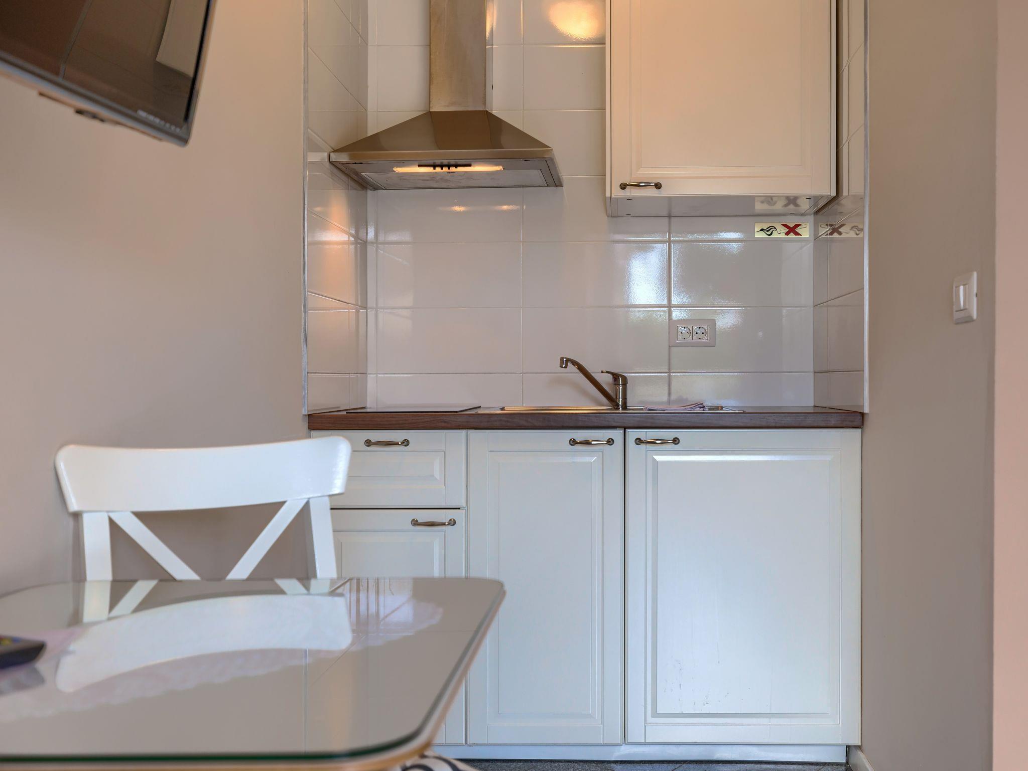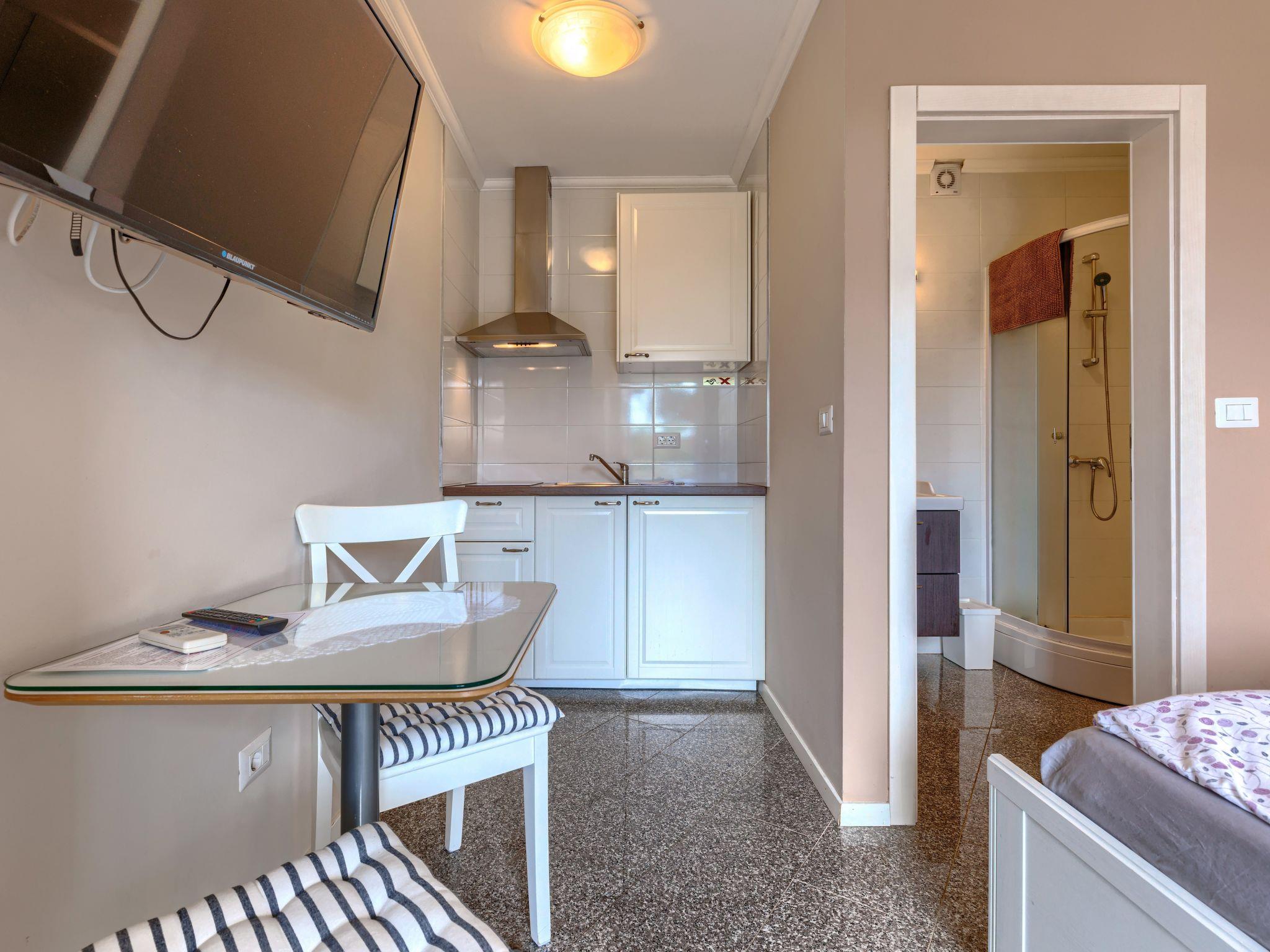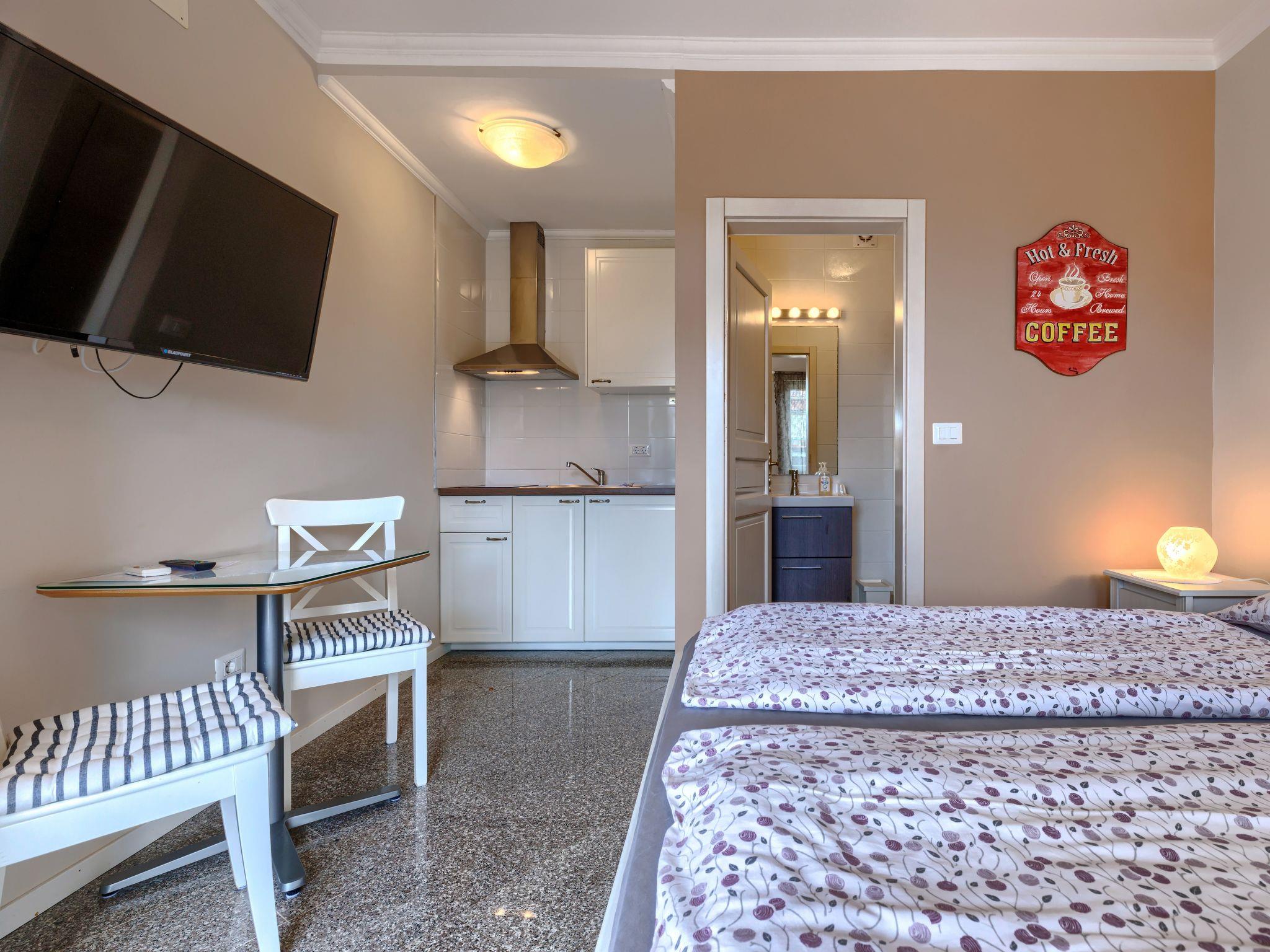 "Veccio", 1-room apartment 18 m2, on the ground floor. Tasteful furnishings: Studio with 1 french bed (160 cm, length 200 cm), satellite TV and air conditioning. Exit to the terrace, to the swimming pool. Open kitchen (2 ceramic glass hob hotplates, freezer) with dining table. Shower/WC. Terrace 5 m2. Terrace furniture. Facilities: Internet (WiFi, free).