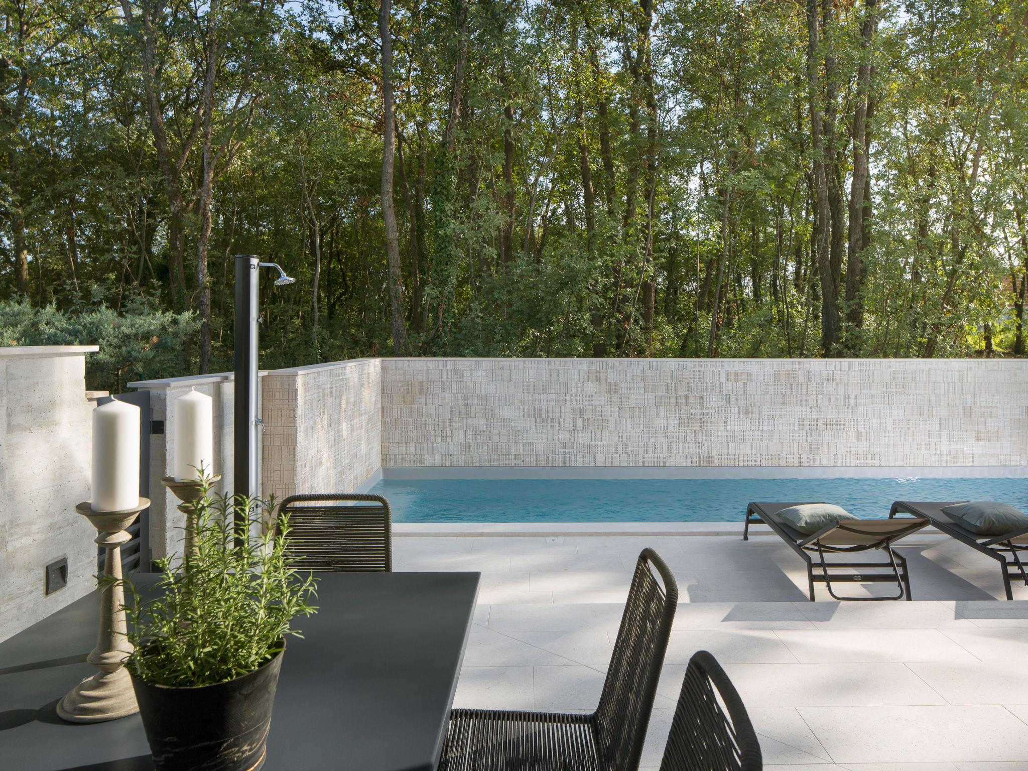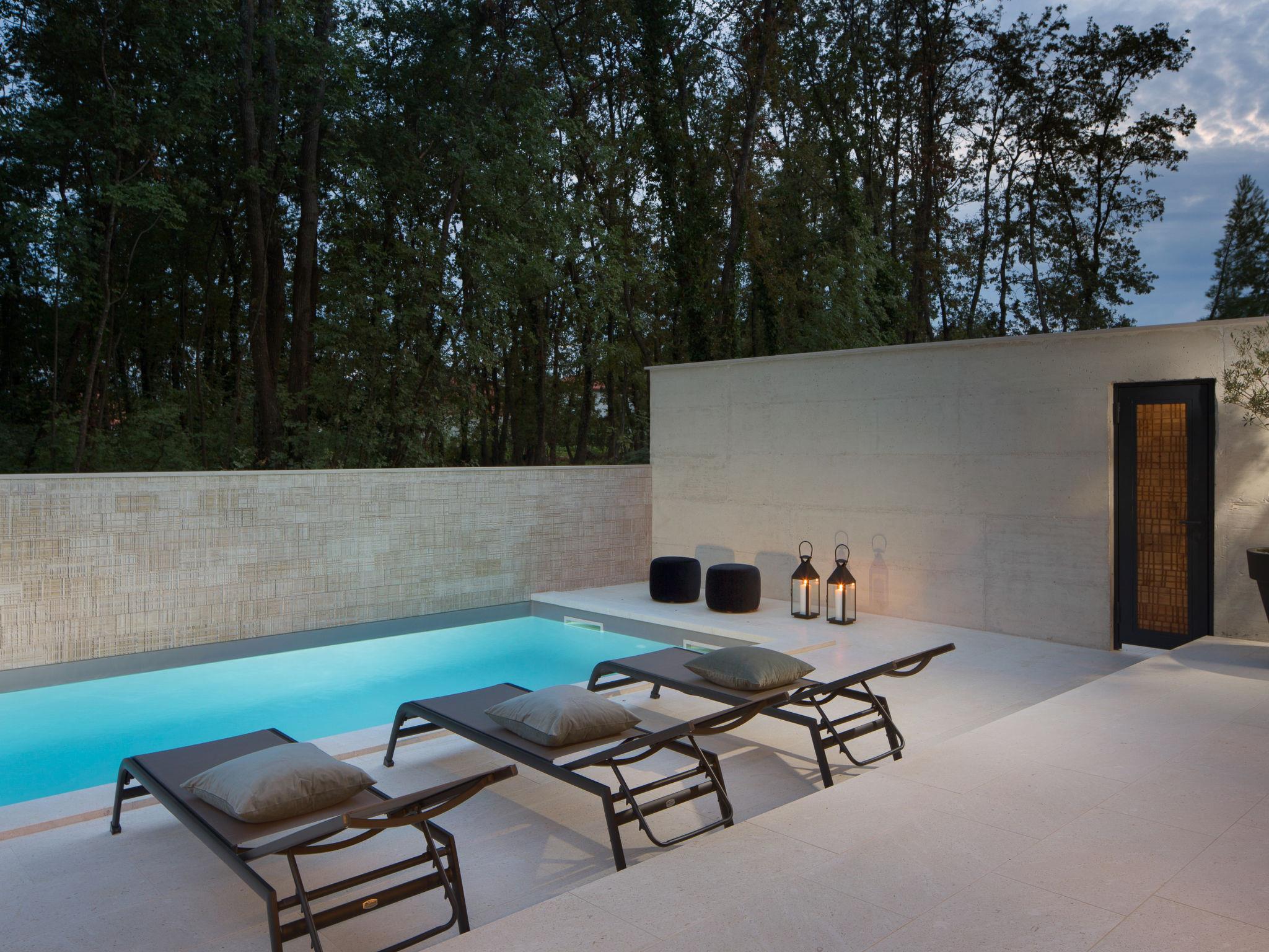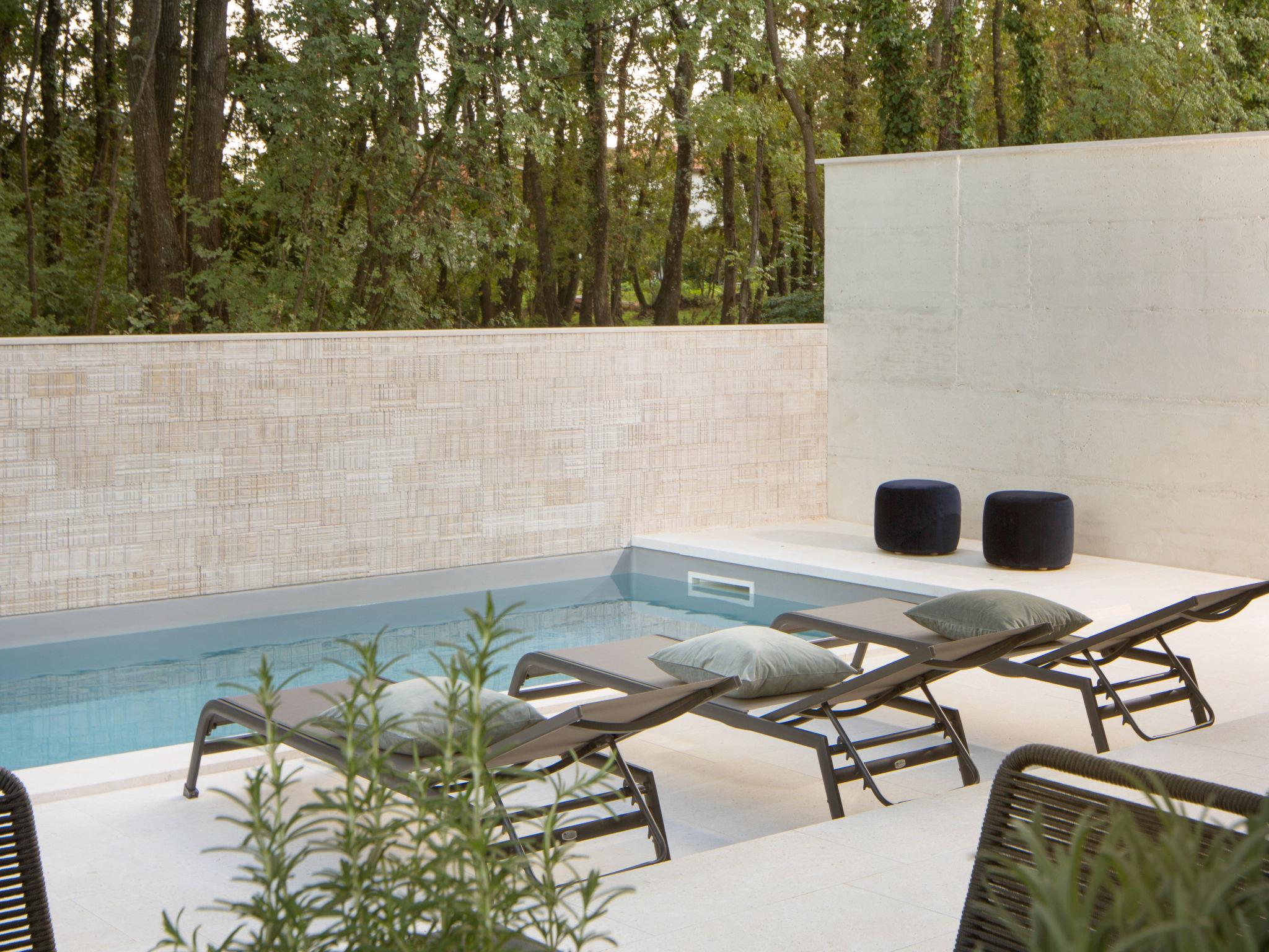 Modern semi-detached house "Oliva 2", 4 storeys, built in 2017. In the hamlet Križine 4 km from the centre of Umag, in a quiet, sunny position, 200 m from the sea, from the beach. For shared use: property 2'000 m2 (fenced), beautiful garden with lawn and plants. Children's playground (slide, swing). Private: property 100 m2 (fenced), swimming pool angular, heated (8 x 4 m, depth 140 cm, seasonal availability: 01.Jan. - 31.Dec.) with internal staircase. Outdoor shower. In the house: internet access, billiard table, table football, central heating system, washing machine, tumble dryer. Parking (for 2 cars) at the house on the premises. E-charging station. Shop 300 m, supermarket 3 km, restaurant 300 m, bus stop 400 m, pebble beach, rocky beach 200 m. Golf course (18 hole) 12 km, tennis 4 km, riding stable 5 km, walking paths from the house 100 m, cycle lane 150 m. Youth groups are not allowed. Swimming pool heated (extra).