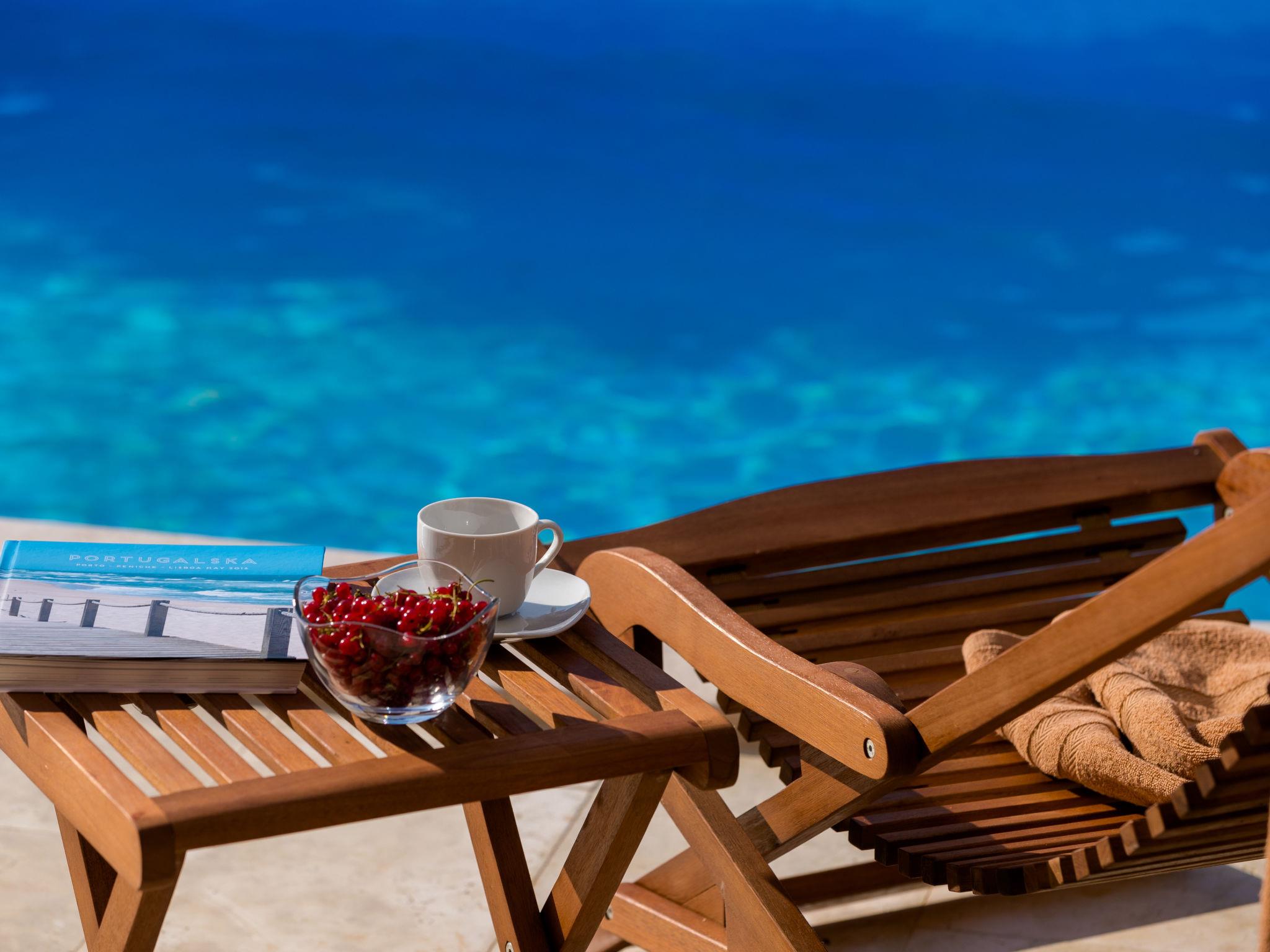 3-room house 150 m2 on 2 levels. Comfortable furnishings: living/dining room 40 m2 with 1 sofabed (80 cm, length 190 cm), 1 sleeping facility (80 cm, length 190 cm), satellite TV (flat screen), air conditioning. Exit to the garden, to the terrace, to the swimming pool. 1 room with 1 french bed (180 cm, length 200 cm), shower/WC and air conditioning. Open kitchen (oven, dishwasher, 4 ceramic glass hob hotplates, freezer, electric coffee machine). Shower/bidet/WC. Upper floor: 1 room with 1 french bed (160 cm, length 200 cm), air conditioning. Exit to the terrace. 1 room with 2 beds (90 cm, length 200 cm), air conditioning. Shower/bidet/WC. Heating (extra). Terrace 15 m2, roofed, terrace 5 m2, roofed. Terrace furniture, deck chairs. Distant view of the sea. Facilities: hair dryer. Internet (WiFi, free). Please note: non-smoking house. 1 small pet/ dog allowed.