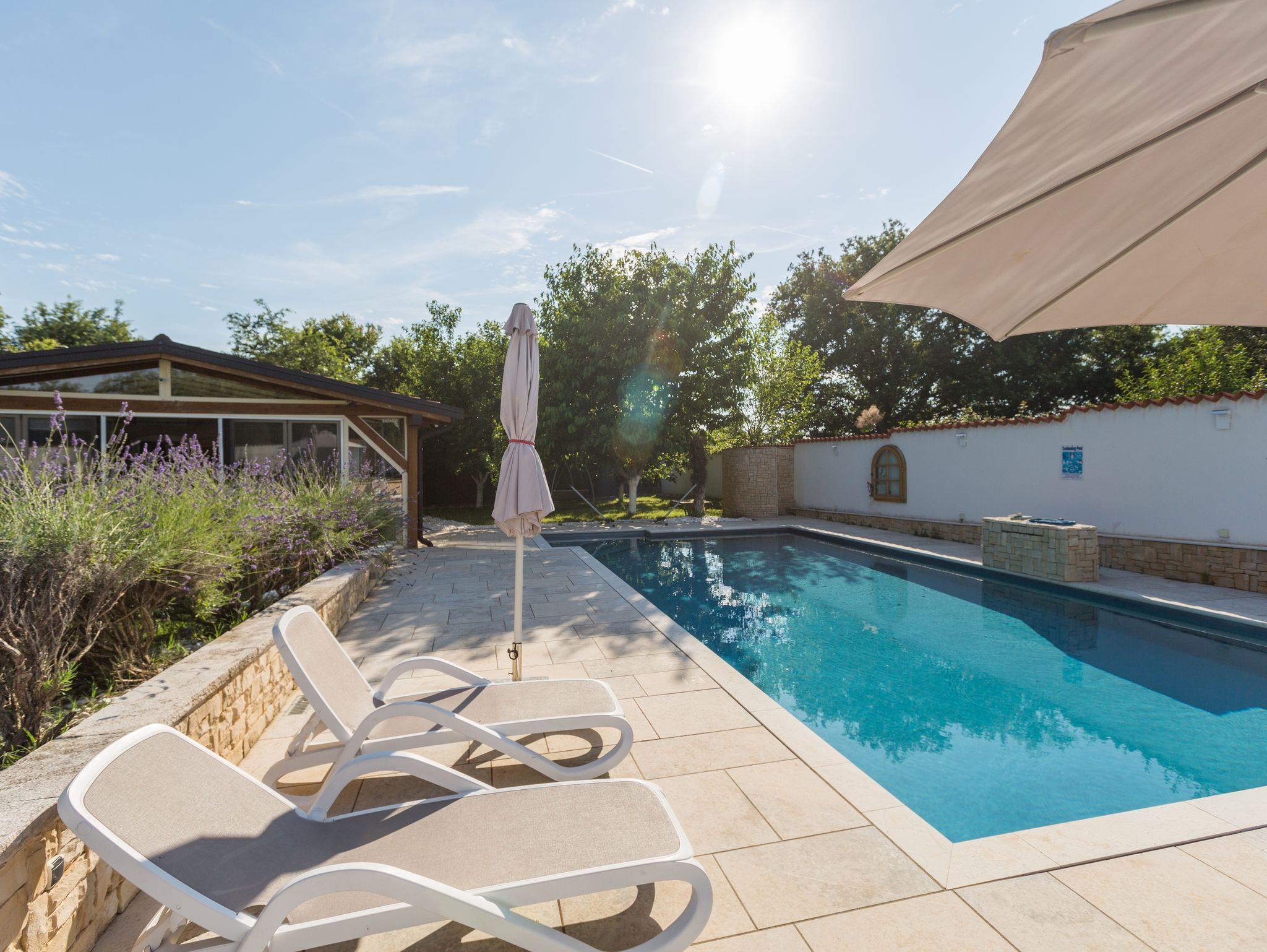 Haus bietet Platz für 6 Gäste. Die Betten sind in Schlafzimmern, die es 2 gibt, und in Wohnzimmer, innerhalb einer Gesamtfläche von 75m2, angeordnet. Für vollen Genuss und Entspannung gibt es einen privaten Grill für Gäste dieser Unterkunft. Während ihres Aufenthalts können sich Gäste im privaten Schwimmbad entspannen. Die reservierte Unterkunftseinheit hat keinen Balkon und keine Terrasse. IM PREIS INBEGRIFFEN: Kurtaxe, Endreinigung, Klimatisierung, Zentralheizung, Pool, Parkplatz, Internet, Kinderbett, Bügeleisen, Bügelbrett, Föhn, Sonnenschirm, Liegestühle. VERBINDLICHE ZUSÄTZLICHE KOSTEN: Aufzahlung für Kurzaufenthalte (prozentualer Zuschlag pro Nächtigungsanzahl: 30% - 1, 20% - 2, 10% - 3). Die Verfügbarkeit zusätzlicher Dienstleistungen in Ihrem reservierten Termin und die Preise derselben (falls nicht aufgeführt) müssen im Voraus überprüft werden. Zusätzliche Dienstleistungen die in der Zahlungsaufforderung nicht aufgeführt sind werden direkt beim Vermieter bezahlt, angenommen der Gast nutzt auch diese.