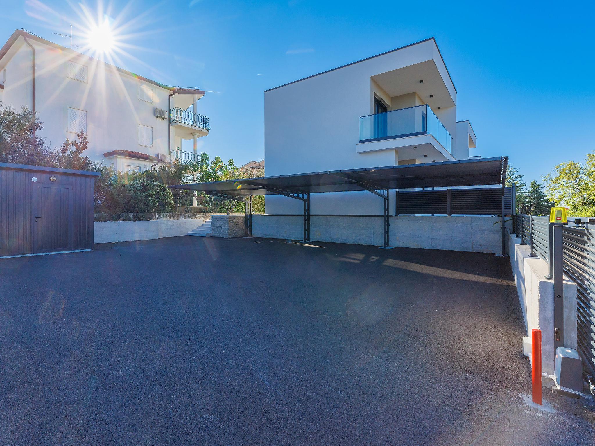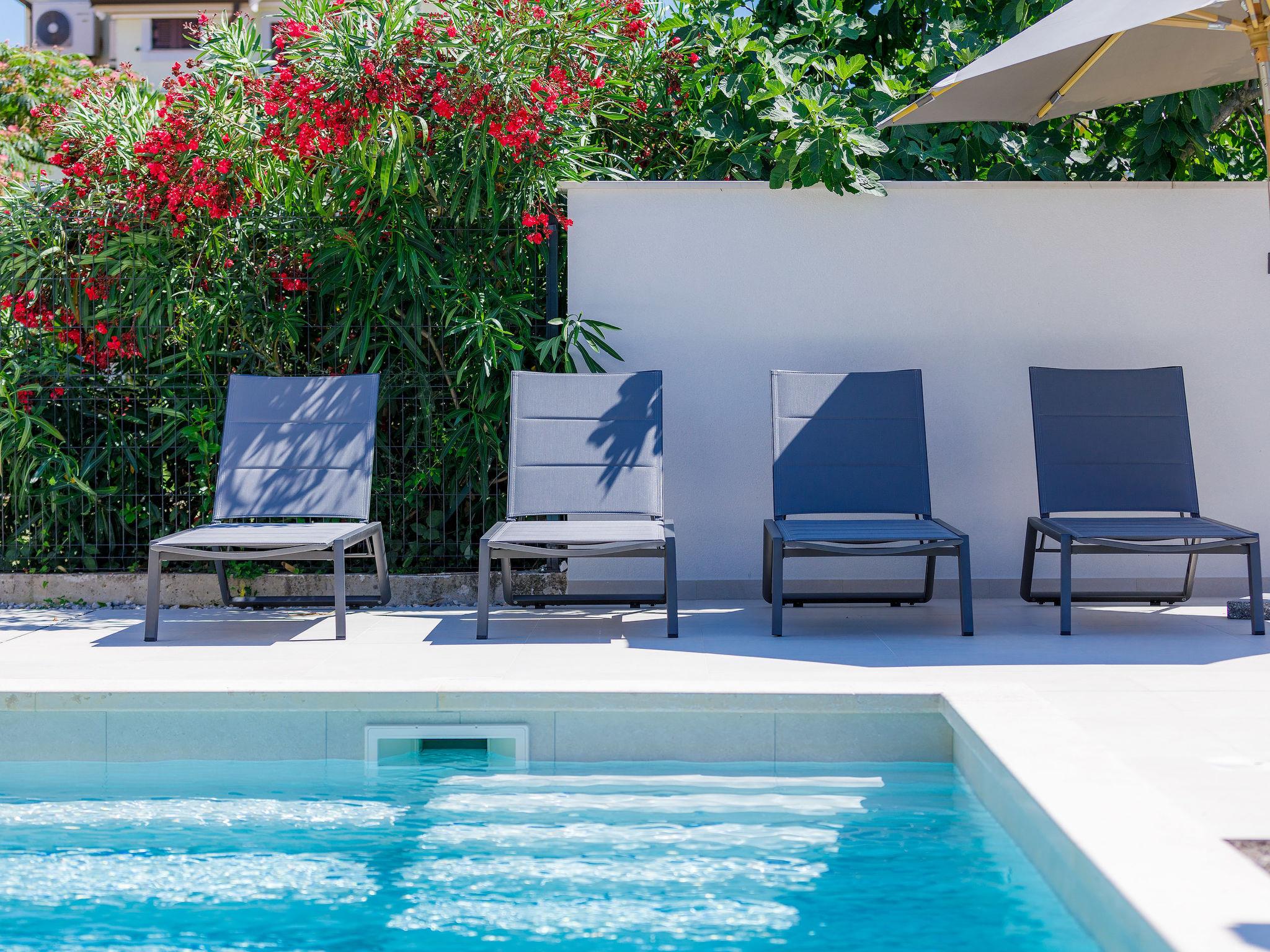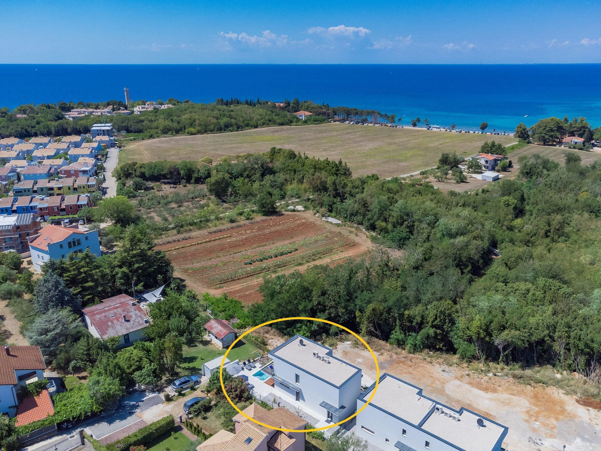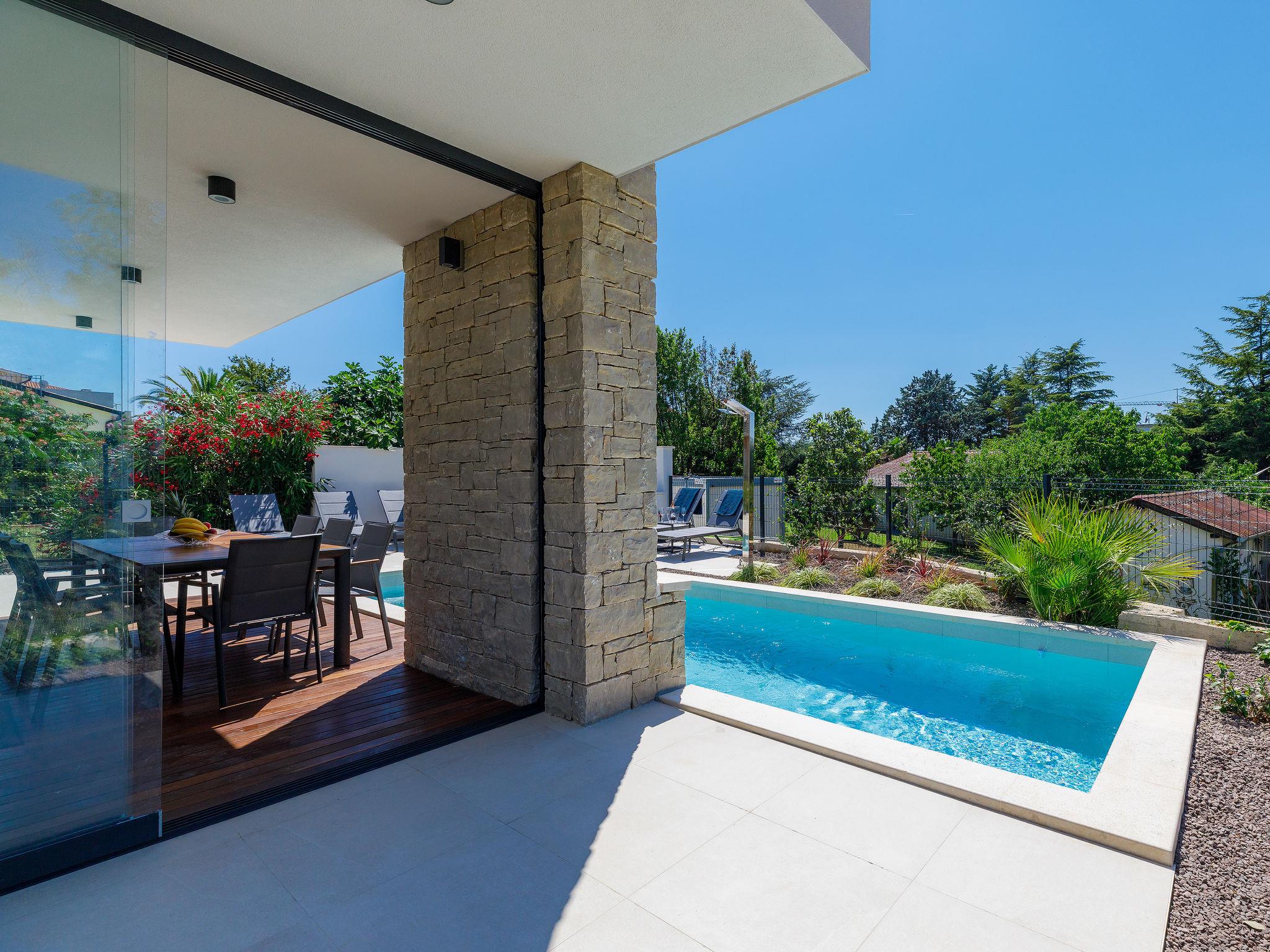 Beautiful single-family house "Villa Irena", 2 storeys, built in 2022. In the district of Bašanija 6 km from the centre of Umag, in a quiet, sunny position, from the sea, 400 m from the beach, in a cul-de-sac. Private: property 300 m2, swimming pool angular, heated (7 x 4 m, depth 150 cm, seasonal availability: 01.Apr. - 30.Oct.) with internal staircase and salt-electrolysis pool-cleaning system. Outdoor shower. In the house: internet access, storage room for bicycles, washing machine. Parking (for 2 cars) at the house on the premises. Shop, supermarket, restaurant 300 m, bus stop 7 km, railway station 35 km, pebble beach, rocky beach 400 m. Golf course (18 hole) 4 km, walking paths from the house 100 m, cycle lane 150 m. The owner does not accept any youth groups. Organizing a party is not allowed. Swimming pool heated (extra). It is necessary to announce 7 days in advance if the pool heating is required.