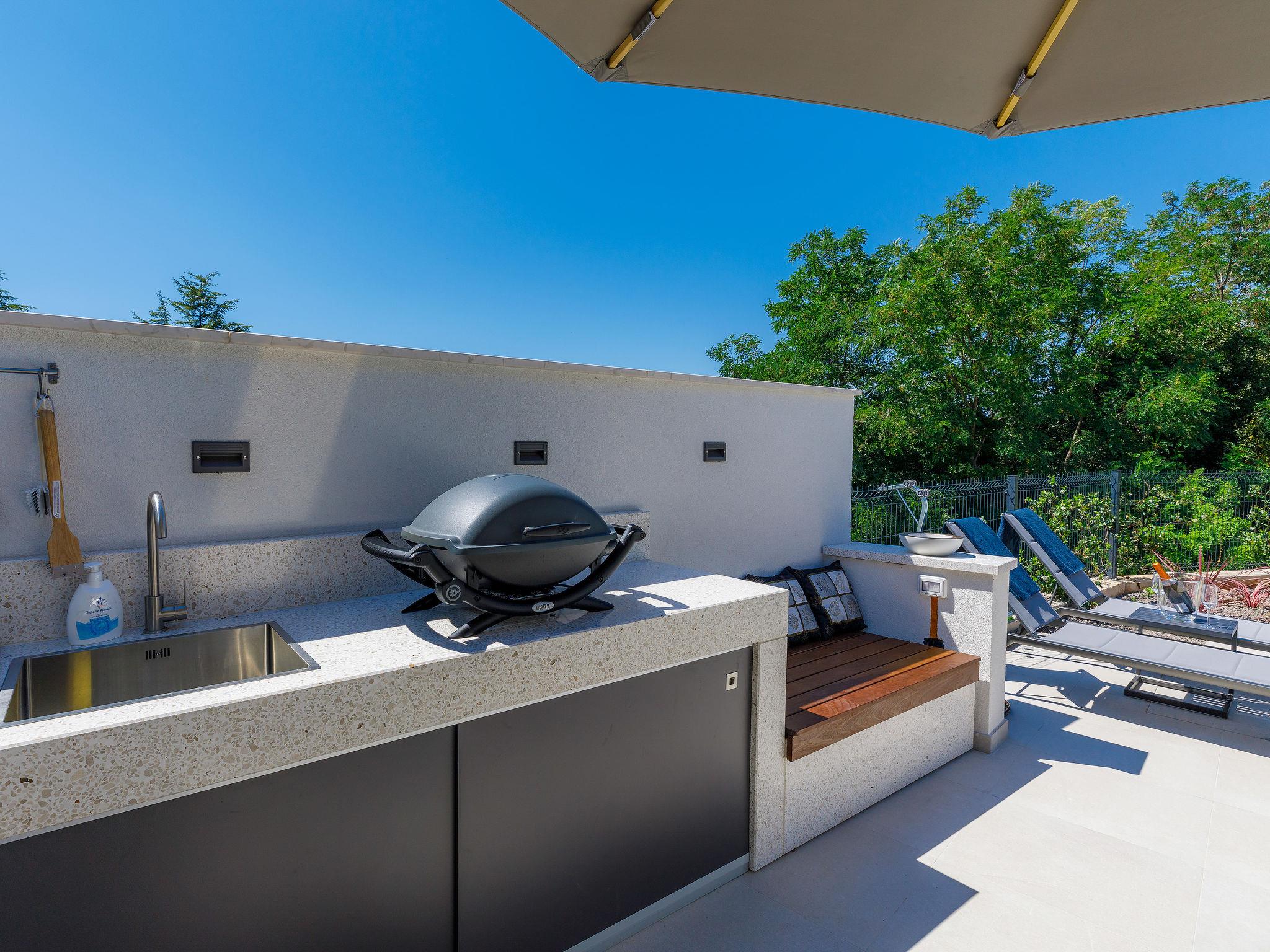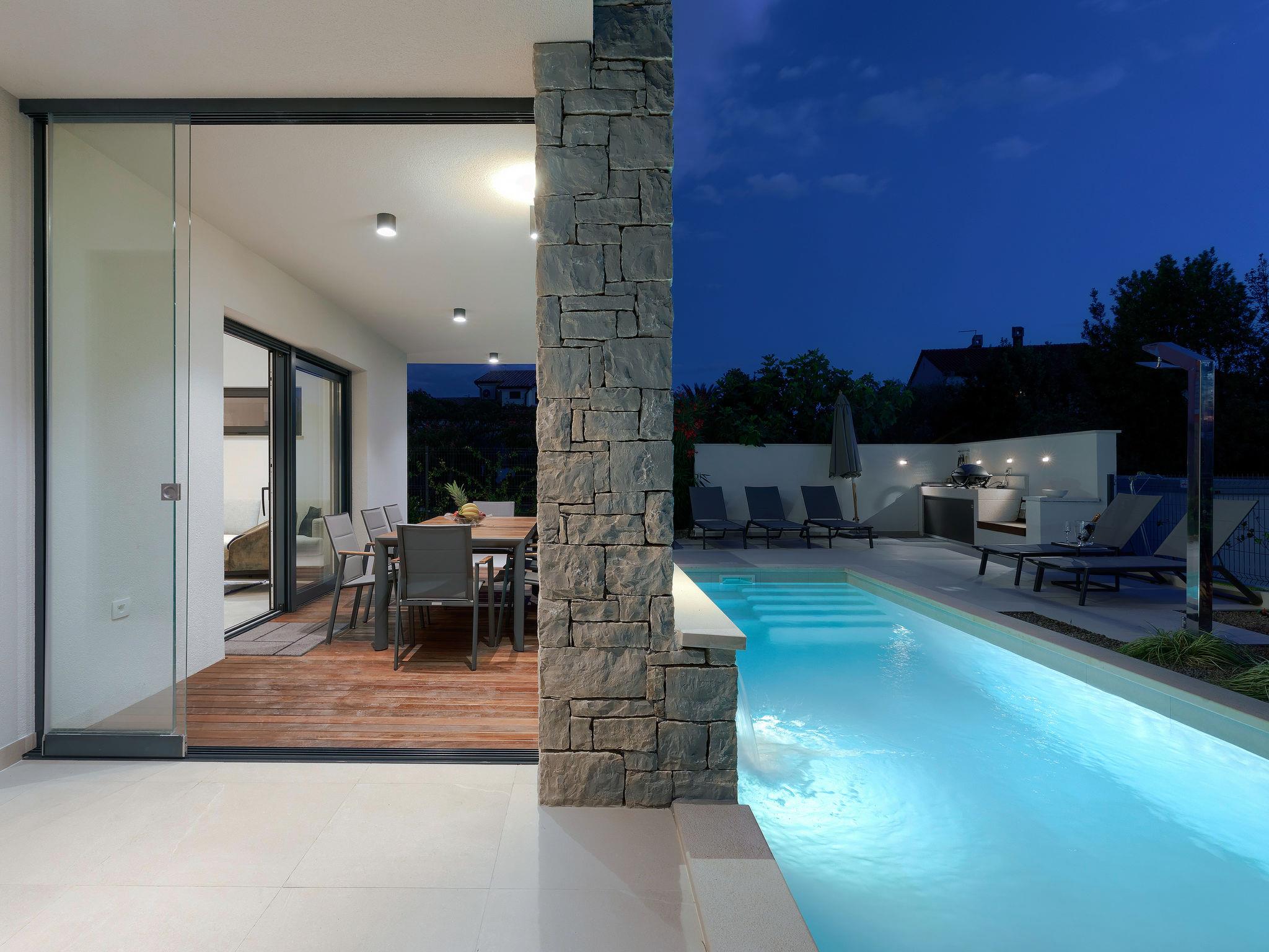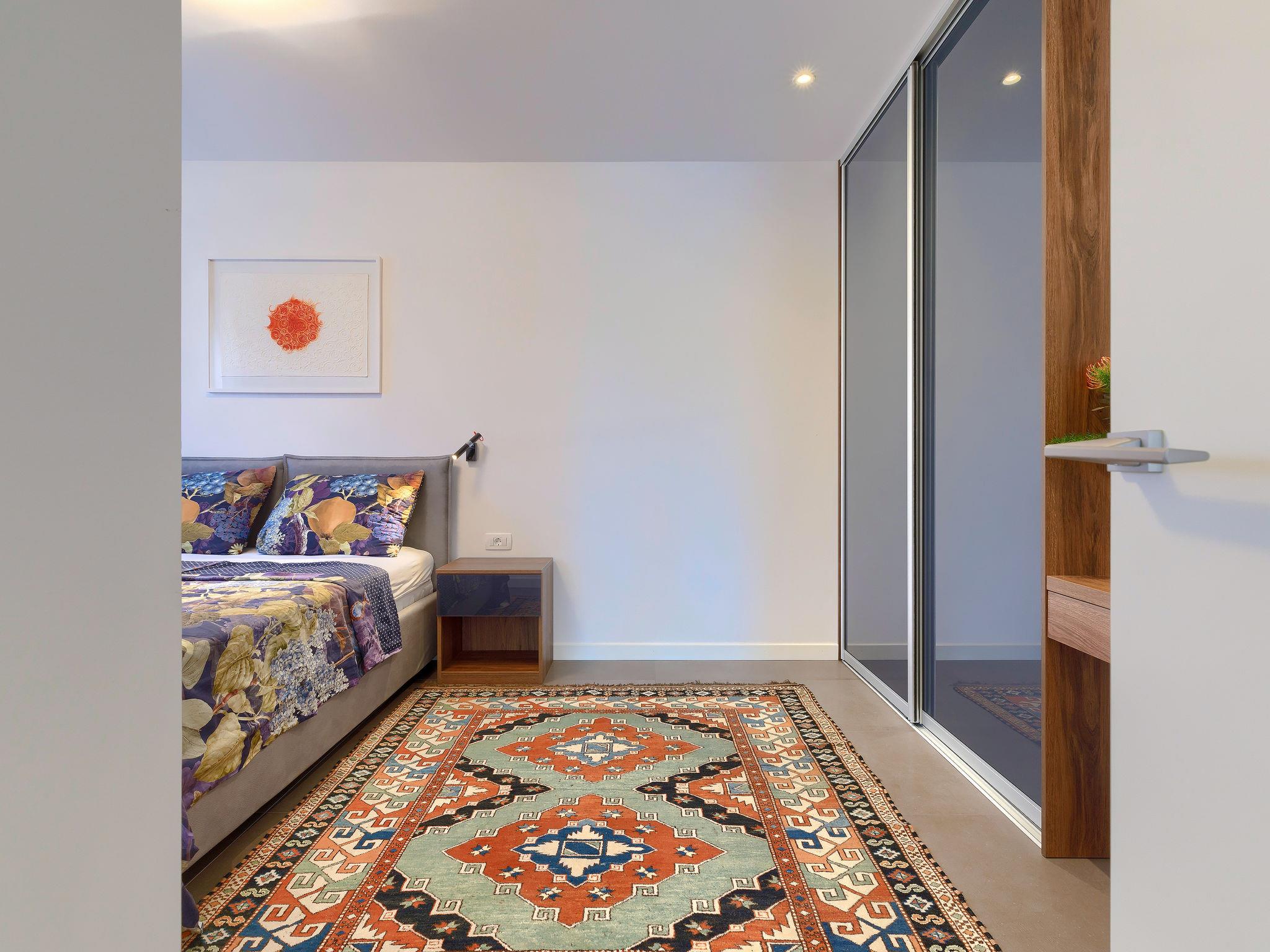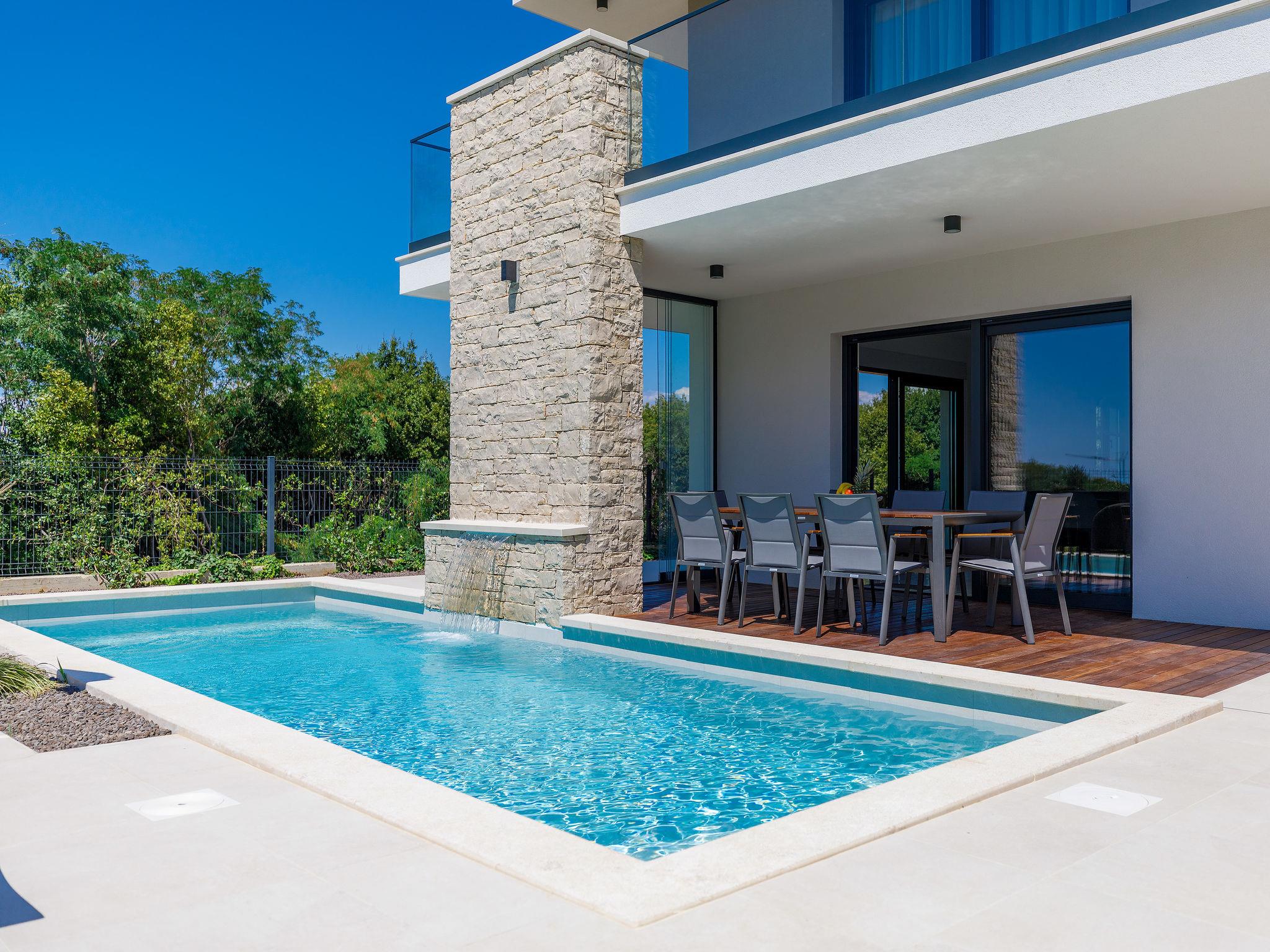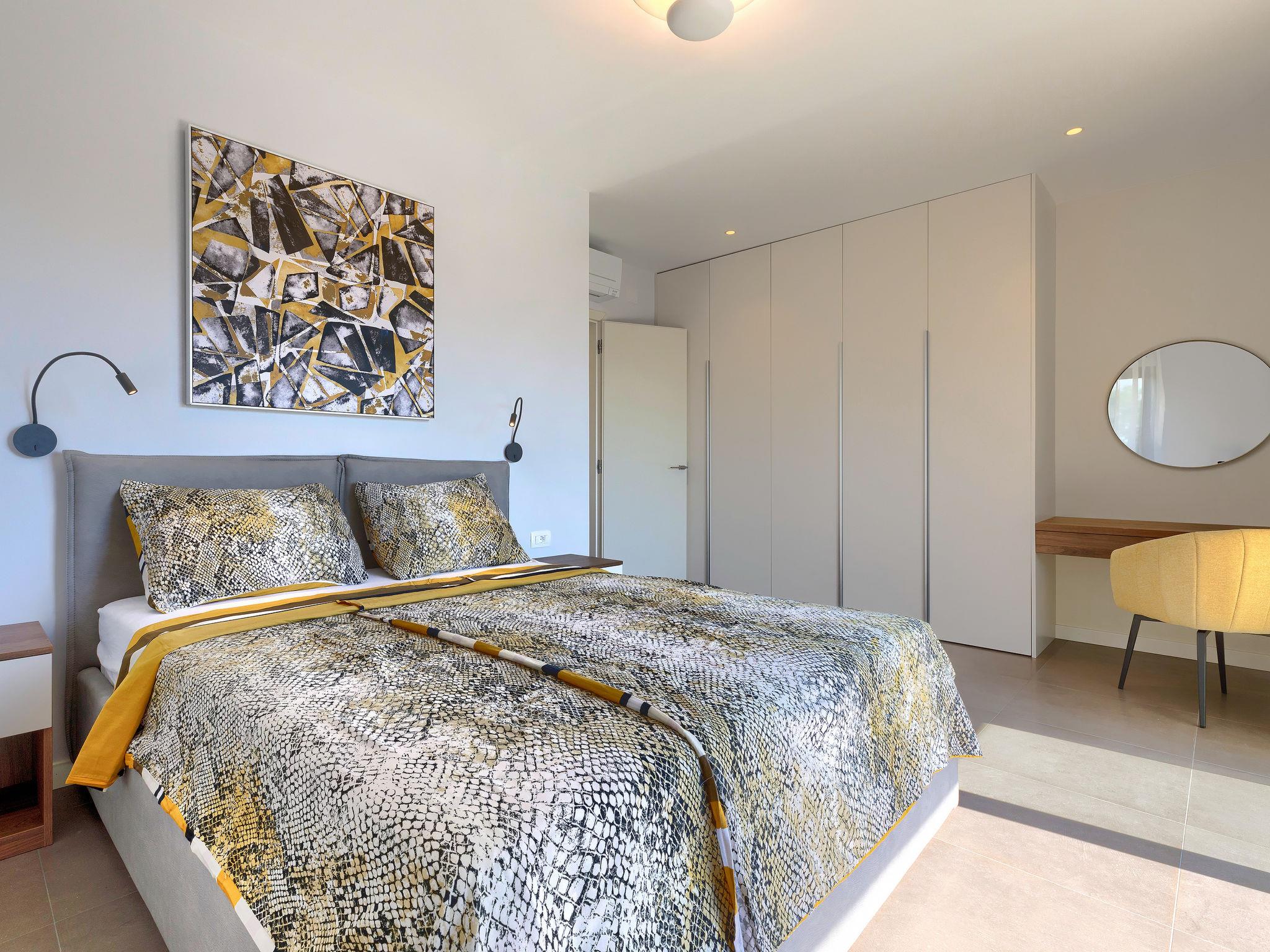 Beautiful single-family house "Villa Irena", 2 storeys, built in 2022. In the district of Bašanija 6 km from the centre of Umag, in a quiet, sunny position, from the sea, 400 m from the beach, in a cul-de-sac. Private: property 300 m2, swimming pool angular, heated (7 x 4 m, depth 150 cm, seasonal availability: 01.Apr. - 30.Oct.) with internal staircase and salt-electrolysis pool-cleaning system. Outdoor shower. In the house: internet access, storage room for bicycles, washing machine. Parking (for 2 cars) at the house on the premises. Shop, supermarket, restaurant 300 m, bus stop 7 km, railway station 35 km, pebble beach, rocky beach 400 m. Golf course (18 hole) 4 km, walking paths from the house 100 m, cycle lane 150 m. The owner does not accept any youth groups. Organizing a party is not allowed. Swimming pool heated (extra). It is necessary to announce 7 days in advance if the pool heating is required.