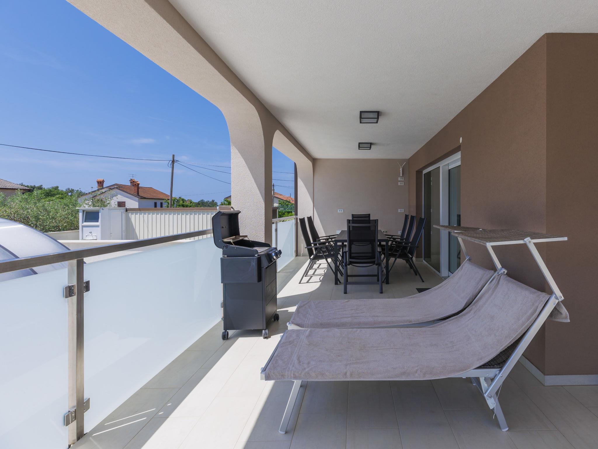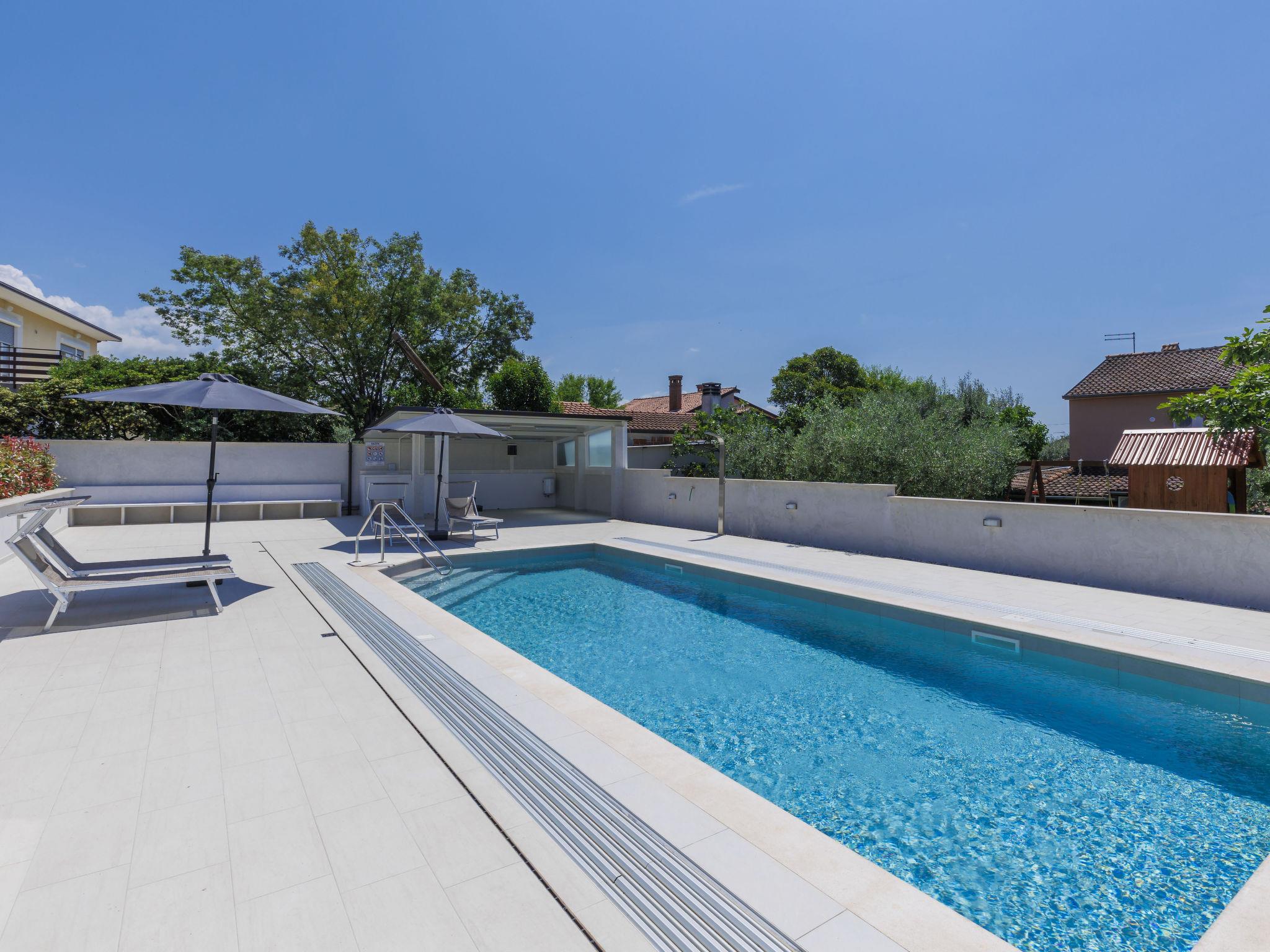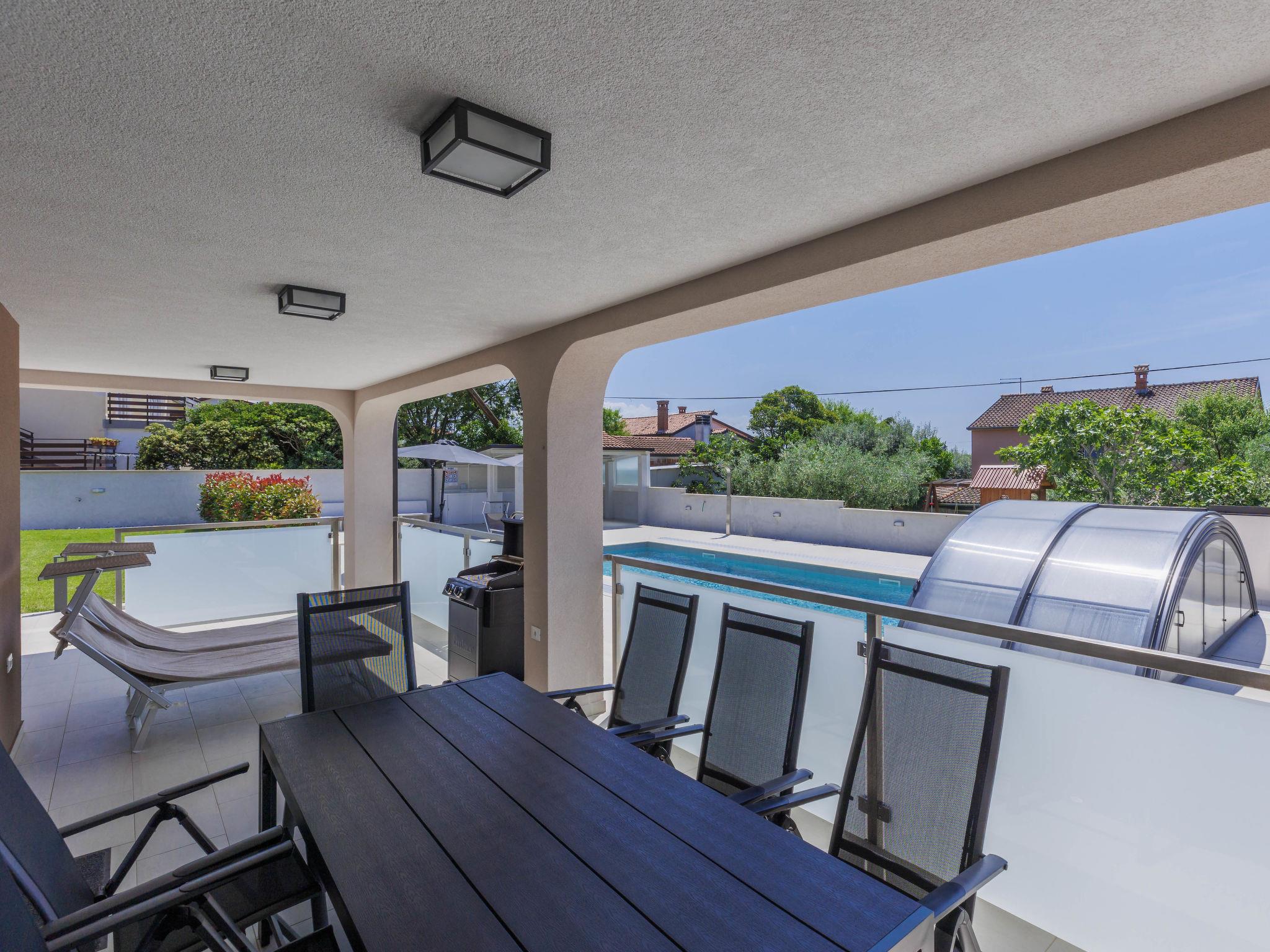 Murine 3 km from Umag: Apartment house "Villa Galici", built in 2022. In the hamlet Galici 1 km from the centre of Murine, in a sunny position, 2.5 km from the sea, 2.5 km from the beach. For shared use: property 1'000 m2 with lawn, swimming pool angular heated (10 x 5 m, depth 150 cm, seasonal availability: 01.Jan. - 31.Dec.) with internal staircase and shutter cover. Outdoor shower. In the house: internet access, table football. Parking at the house on the premises. Shop 1.5 km, restaurant 800 m, bus stop 4.1 km, pebble beach 2.5 km, rocky beach 2.5 km. Walking paths from the house 100 m, cycle lane 150 m. The owner does not accept any youth groups.