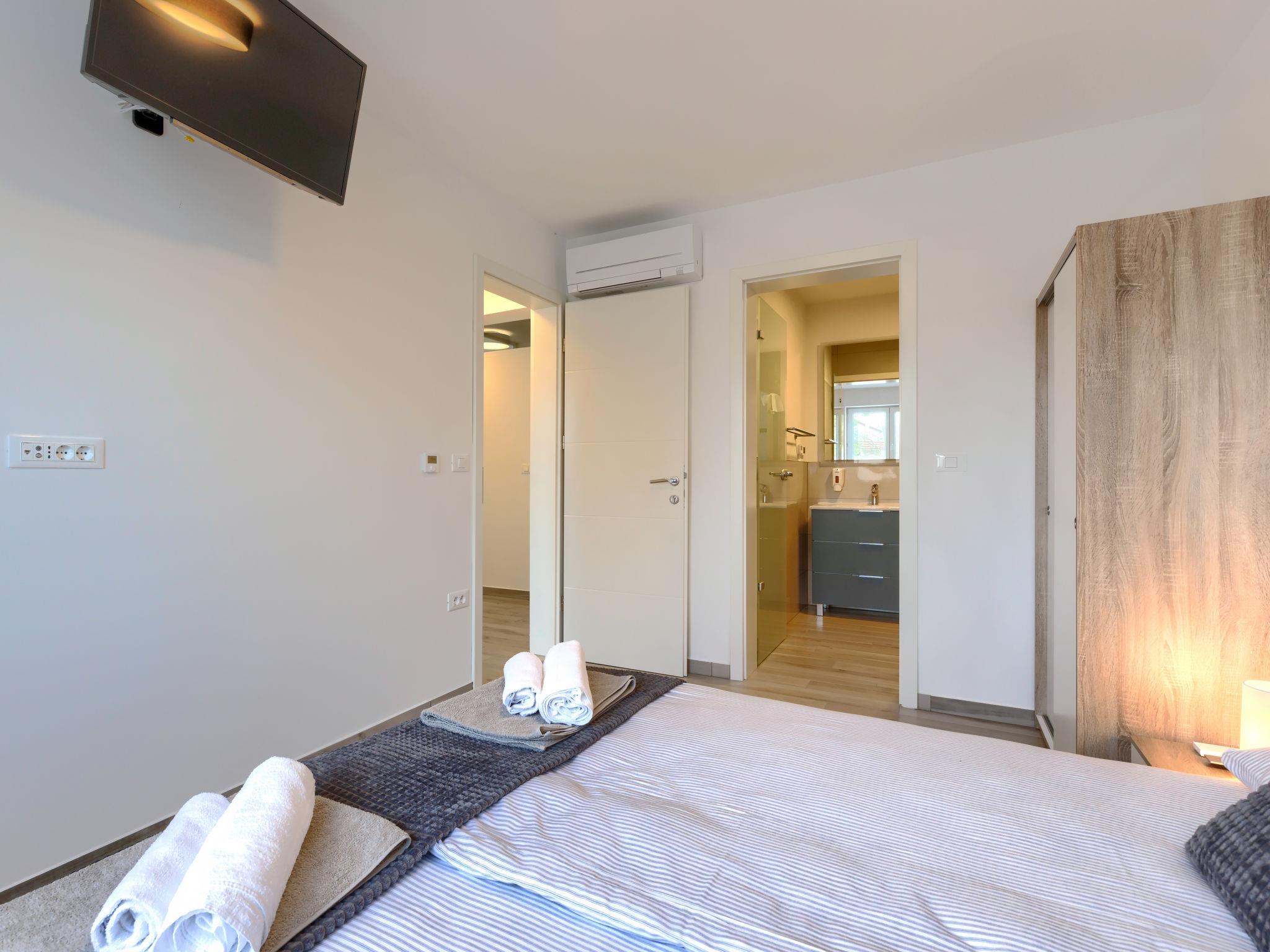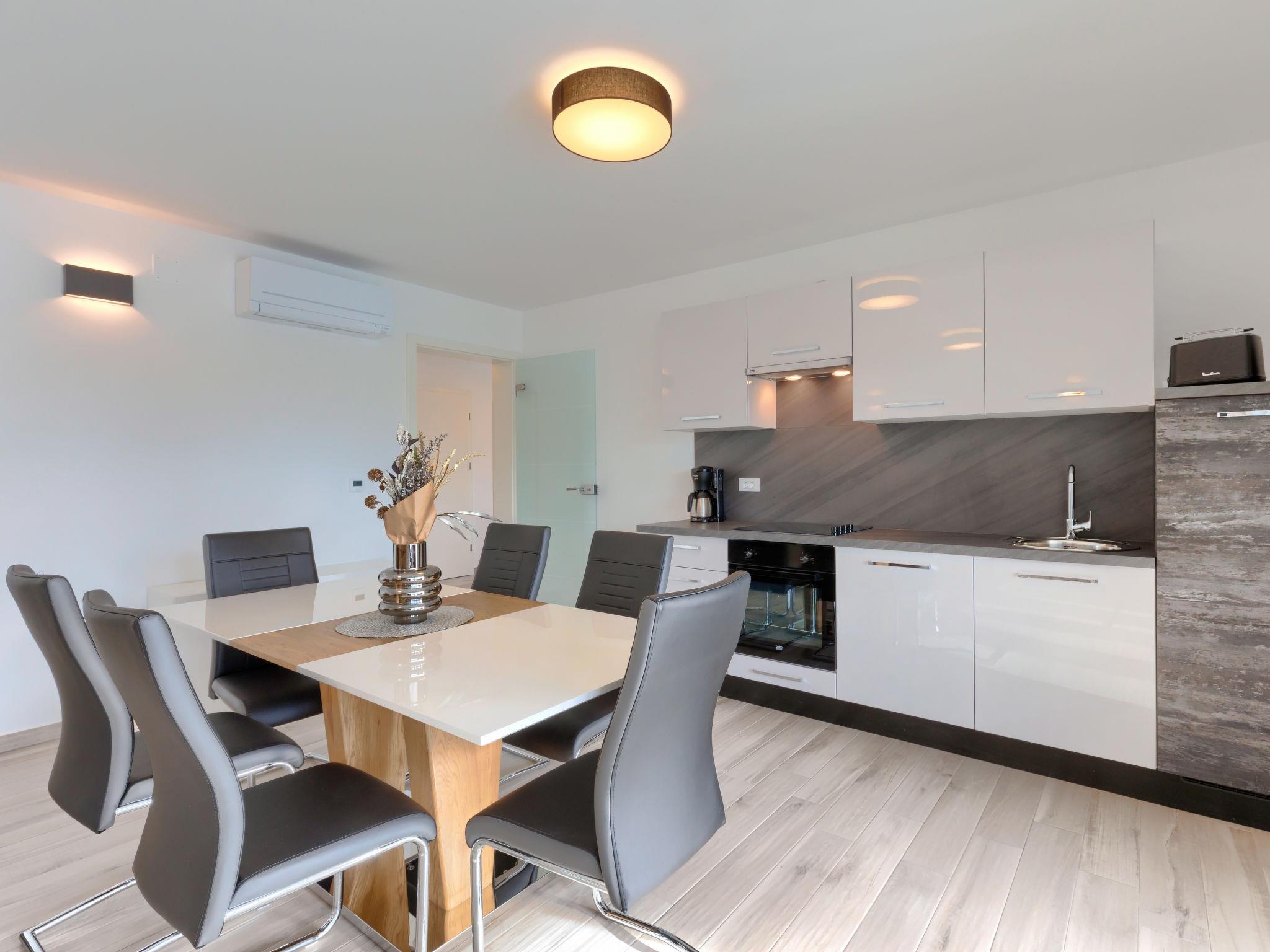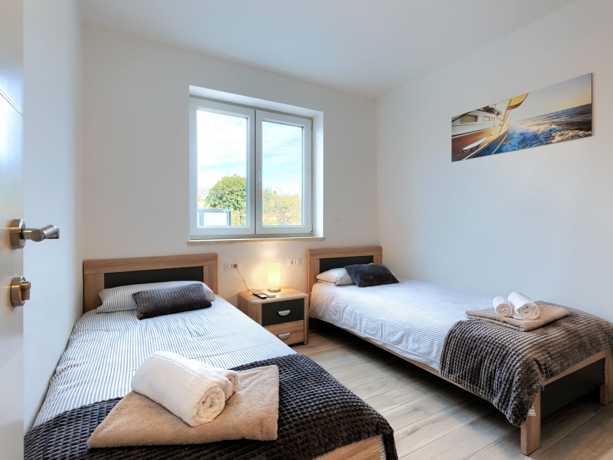 Murine 3 km from Umag: Apartment house "Villa Galici", built in 2022. In the hamlet Galici 1 km from the centre of Murine, in a sunny position, 2.5 km from the sea, 2.5 km from the beach. For shared use: property 1'000 m2 with lawn, swimming pool angular heated (10 x 5 m, depth 150 cm, seasonal availability: 01.Jan. - 31.Dec.) with internal staircase and shutter cover. Outdoor shower. In the house: internet access, table football. Parking at the house on the premises. Shop 1.5 km, restaurant 800 m, bus stop 4.1 km, pebble beach 2.5 km, rocky beach 2.5 km. Walking paths from the house 100 m, cycle lane 150 m. The owner does not accept any youth groups.