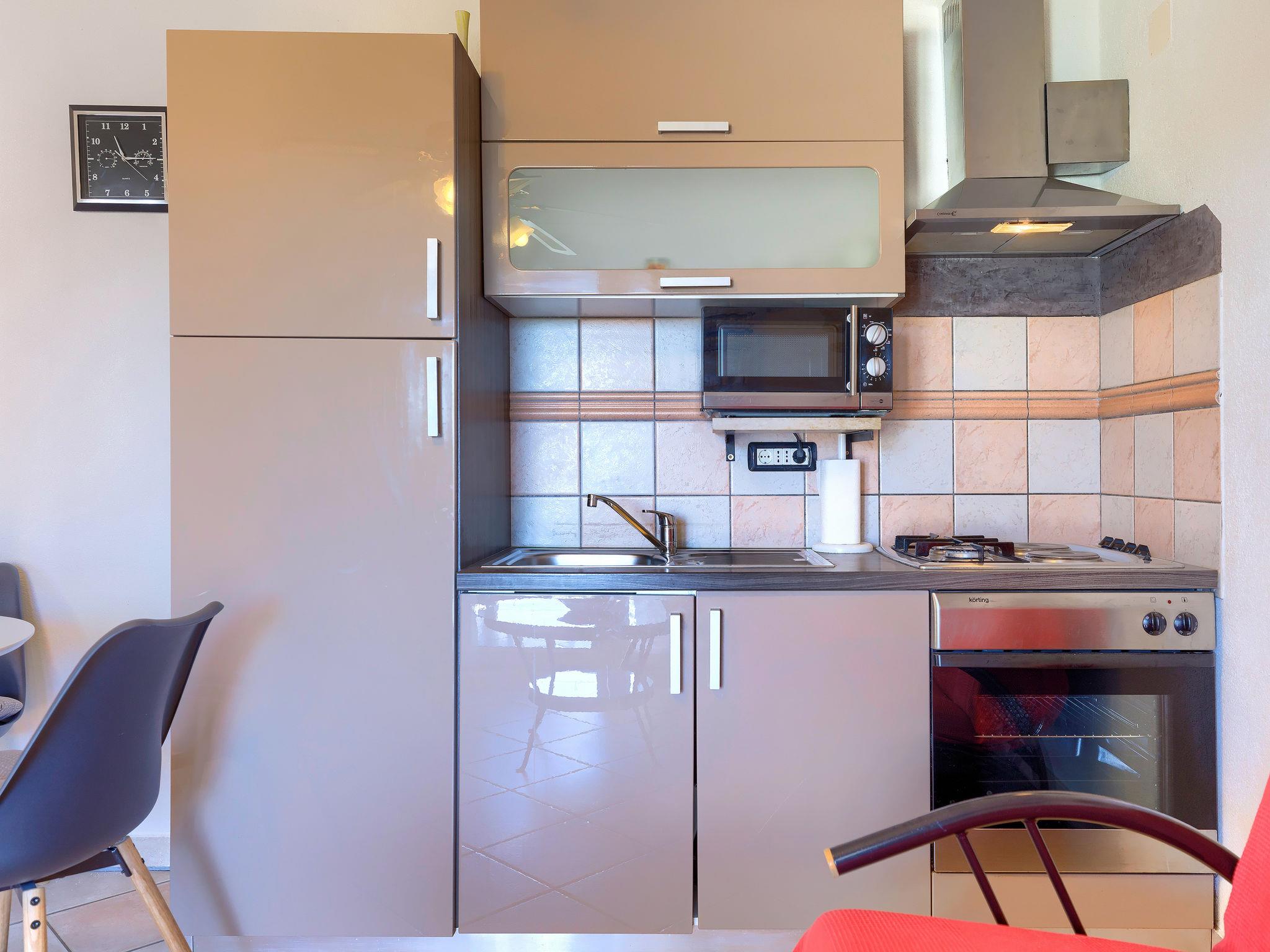 3-room apartment 46 m2 on 1st floor. Living/dining room with satellite TV (flat screen), air conditioning. Exit to the terrace. 1 room with 1 french bed (160 cm, length 200 cm). 1 room with 2 beds (80 cm, length 190 cm). Open kitchen (4 hot plates, oven, microwave, freezer). Shower/WC. Heating (extra). Terrace 12 m2. Terrace furniture. Facilities: safe. Internet (WiFi, free). 388