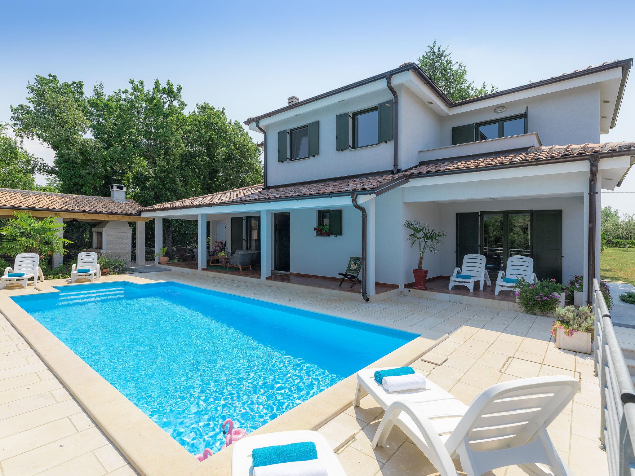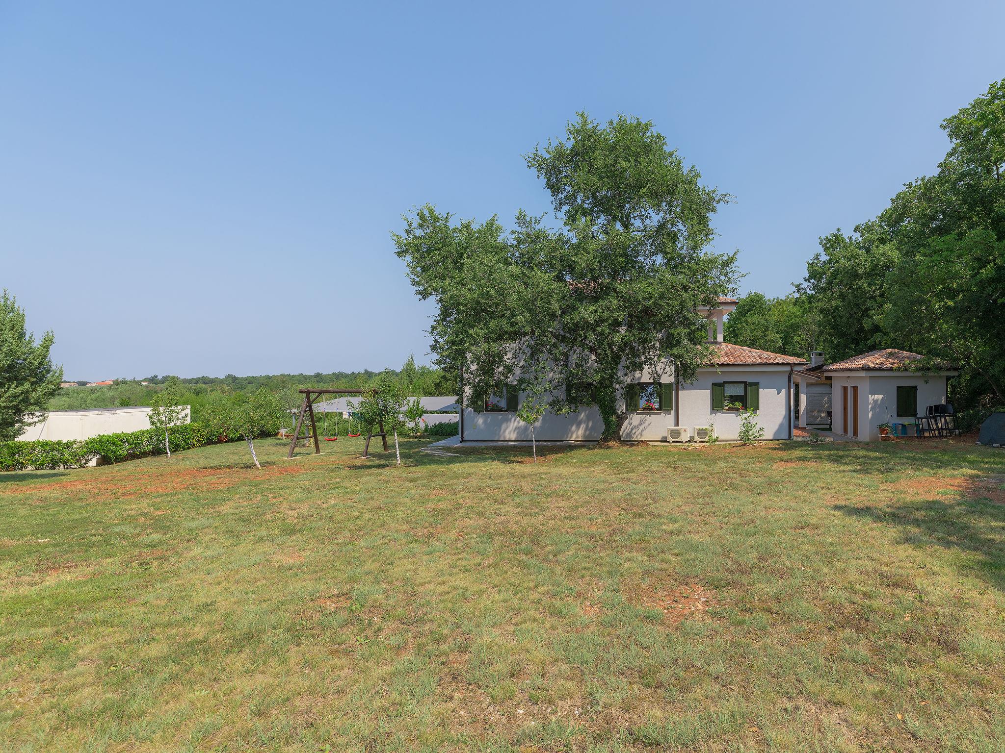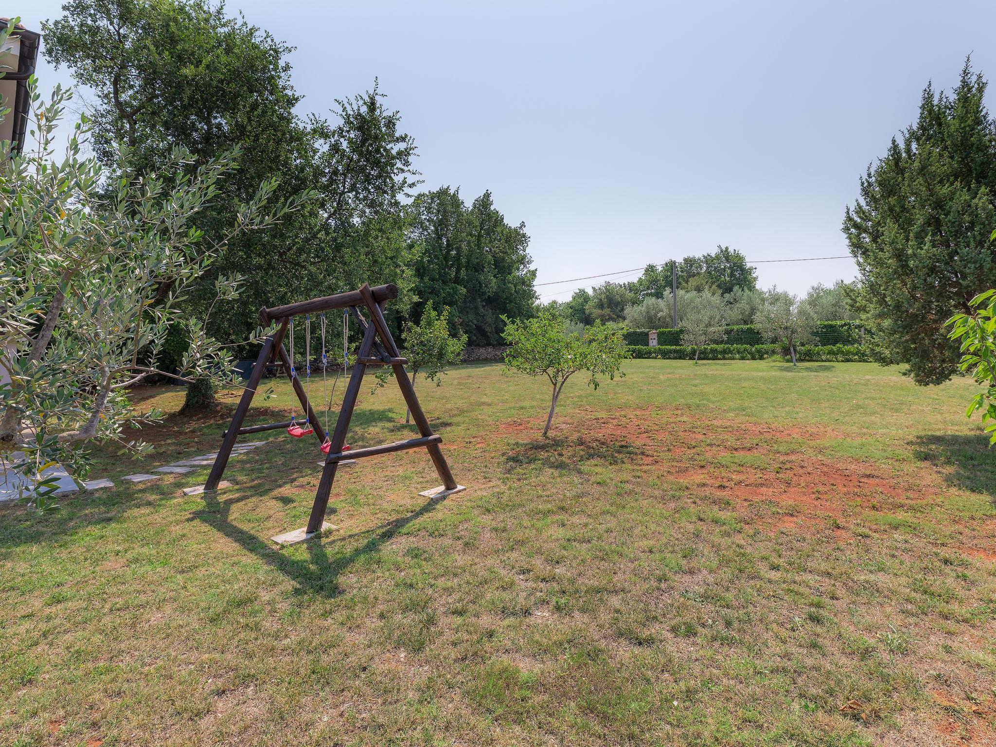 Murine: Single-family house "Fratrici", 2 storeys. In the hamlet Fratrici 1 km from the centre of Murine, 2.5 km from the centre of Umag, in a quiet, sunny position, 2.5 km from the sea, 2.5 km from the beach, in a cul-de-sac. Private: property 1'700 m2 (fenced), garden with lawn and wildlife garden, swimming pool angular (8 x 4 m, depth 100 - 140 cm, seasonal availability: 01.May. - 01.Nov.) with internal staircase. Outdoor shower, garden furniture, barbecue (swing). In the house: internet access, washing machine. Parking (for 3 cars) at the house on the premises. Shop, restaurant 500 m, bus stop 4.3 km, pebble beach 2.5 km, rocky beach 2.5 km. Tennis 2.5 km, walking paths from the house, cycle lane 200 m.