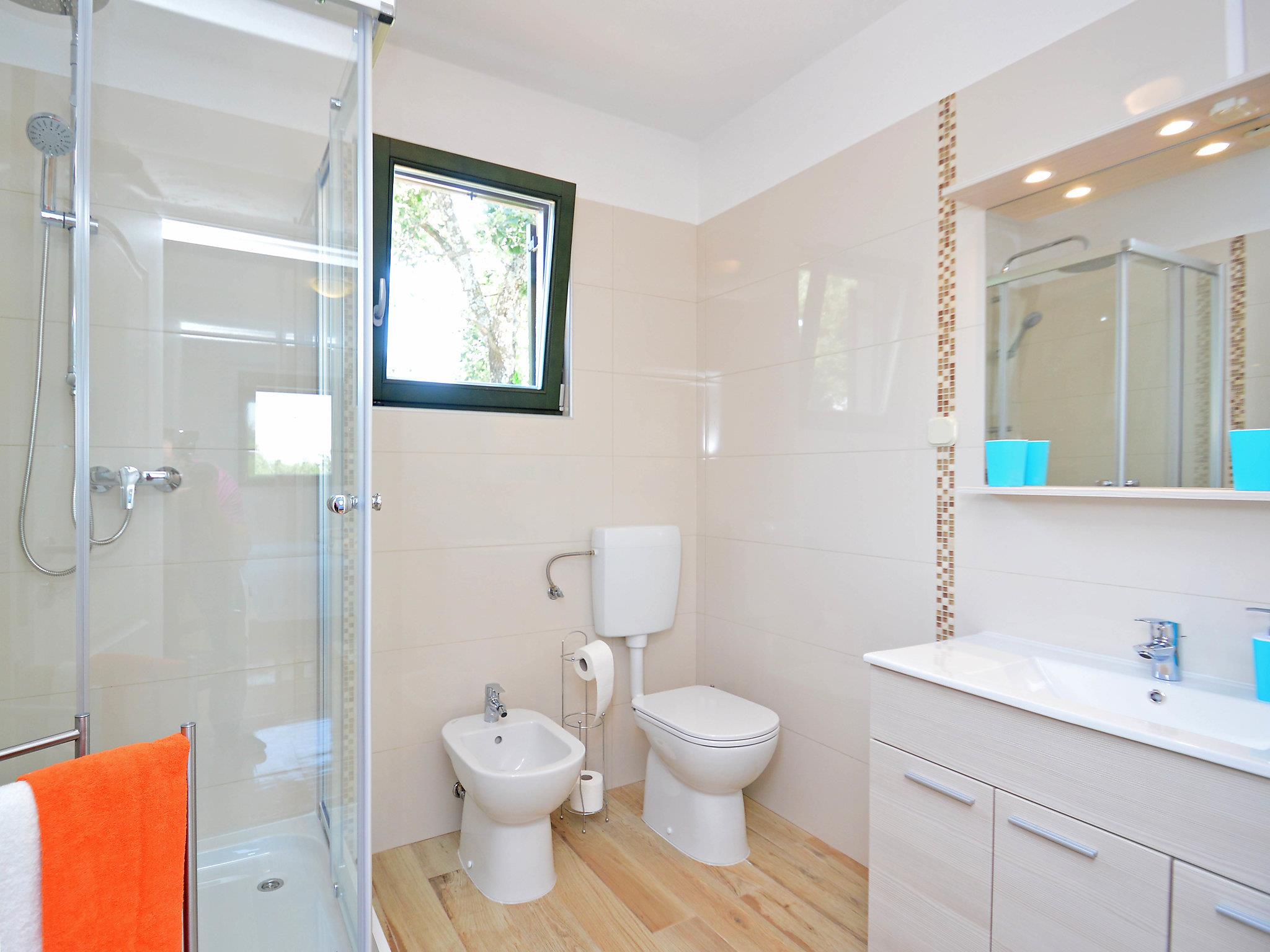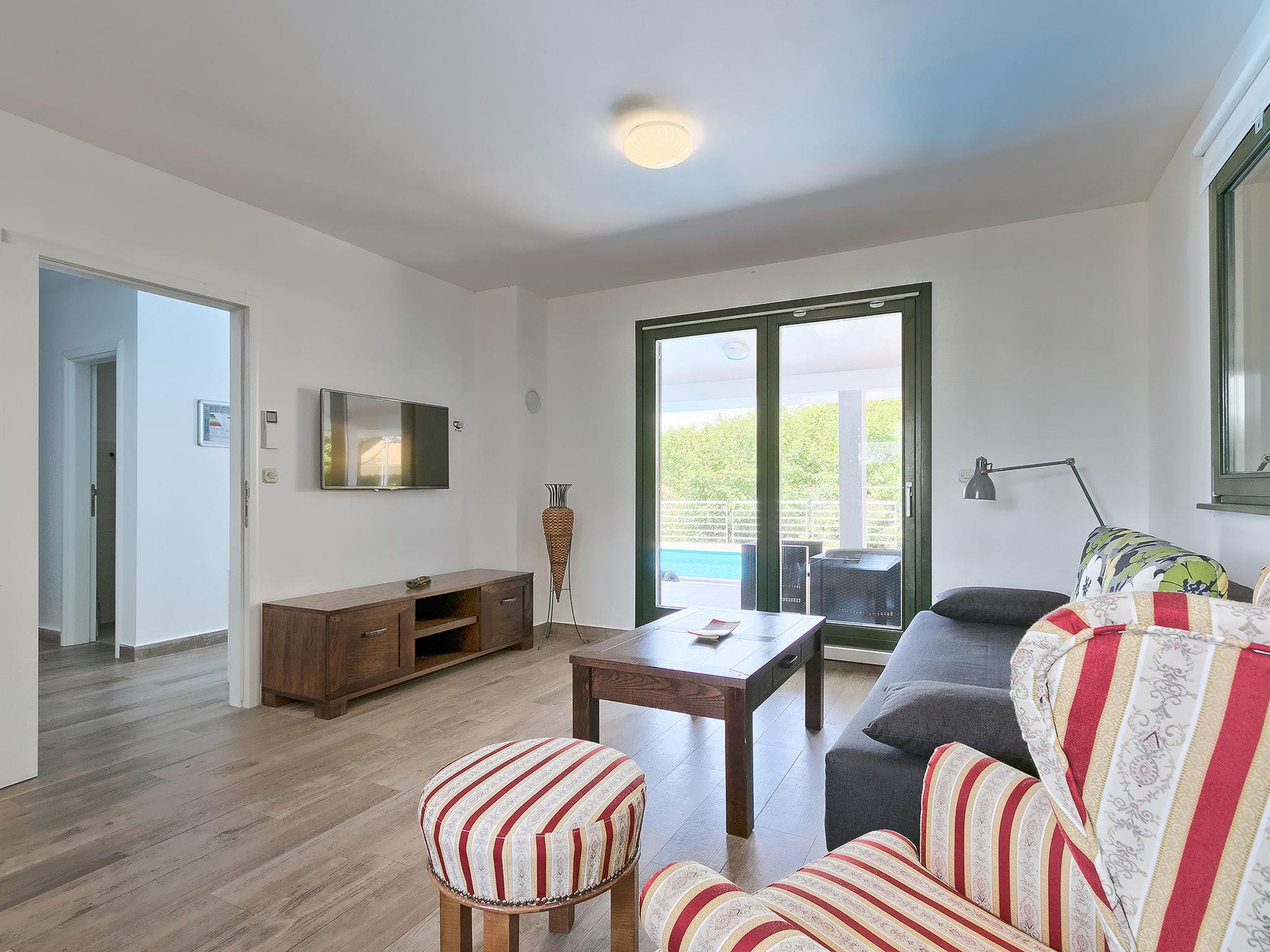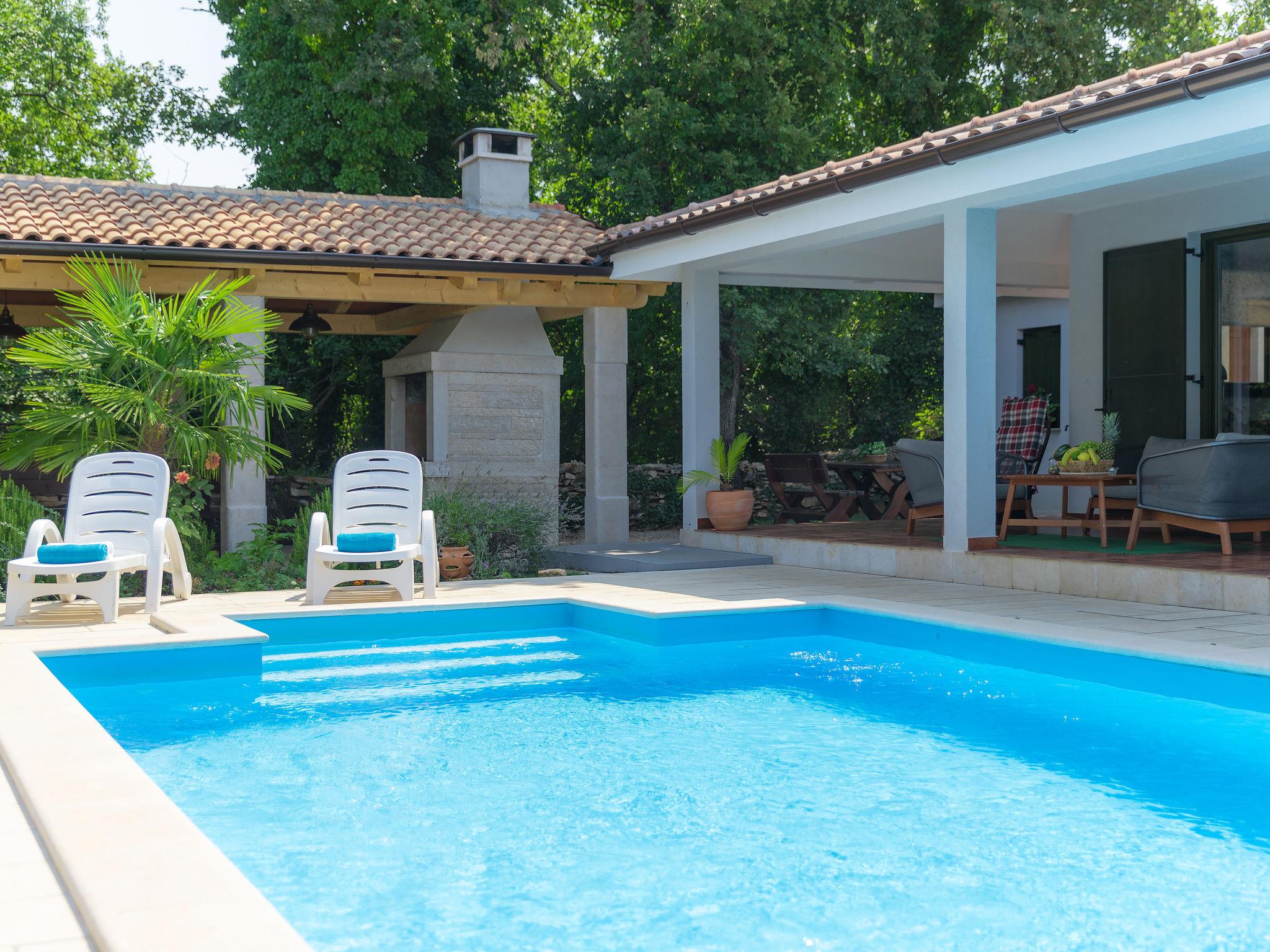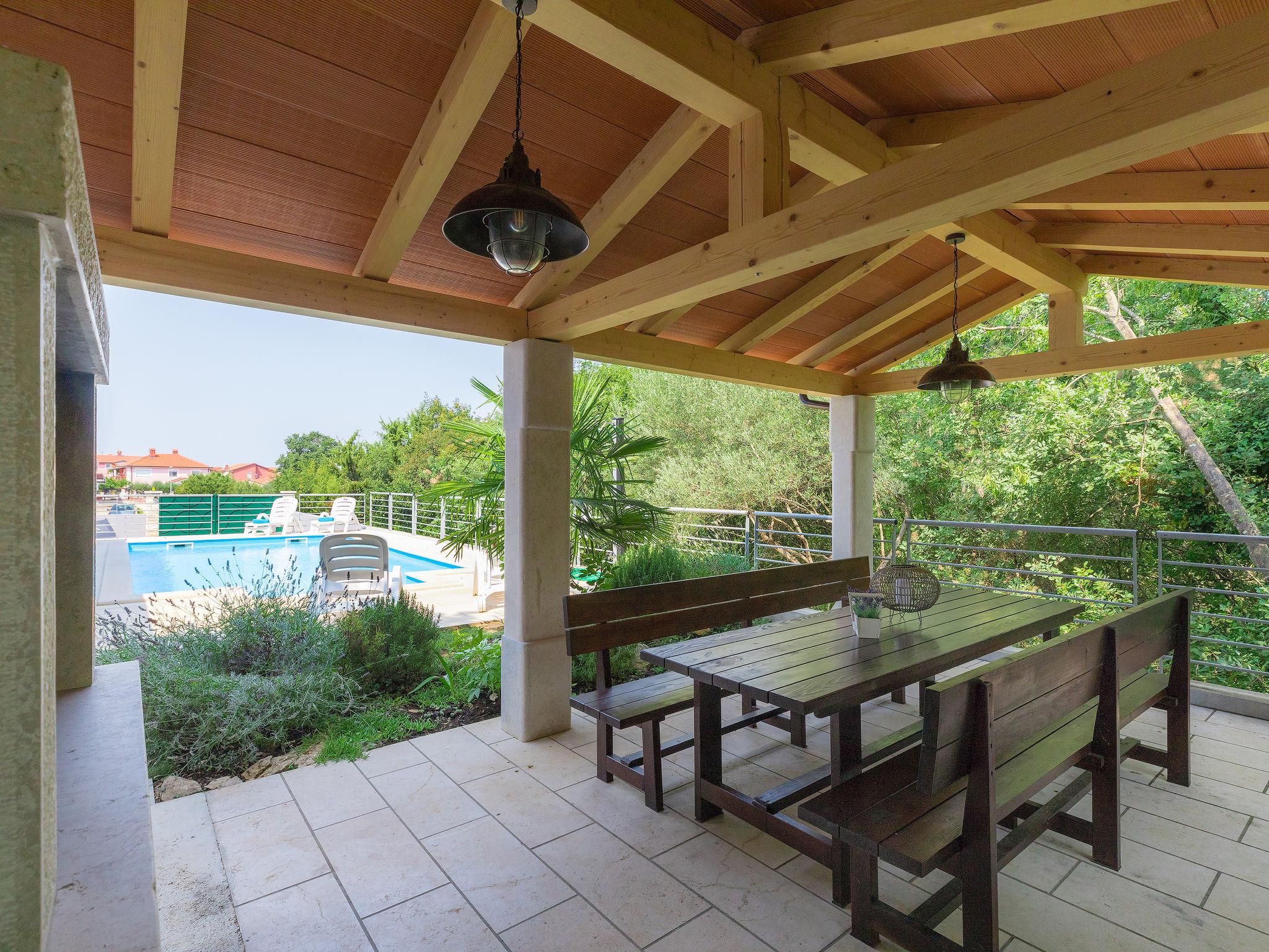 Murine: Single-family house "Fratrici", 2 storeys. In the hamlet Fratrici 1 km from the centre of Murine, 2.5 km from the centre of Umag, in a quiet, sunny position, 2.5 km from the sea, 2.5 km from the beach, in a cul-de-sac. Private: property 1'700 m2 (fenced), garden with lawn and wildlife garden, swimming pool angular (8 x 4 m, depth 100 - 140 cm, seasonal availability: 01.May. - 01.Nov.) with internal staircase. Outdoor shower, garden furniture, barbecue (swing). In the house: internet access, washing machine. Parking (for 3 cars) at the house on the premises. Shop, restaurant 500 m, bus stop 4.3 km, pebble beach 2.5 km, rocky beach 2.5 km. Tennis 2.5 km, walking paths from the house, cycle lane 200 m.