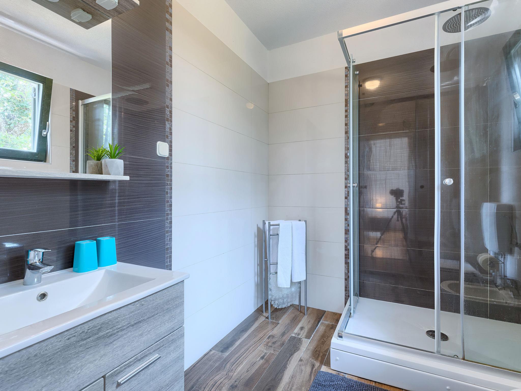 4-room house 139 m2 on 2 levels. Living/dining room with satellite TV (flat screen), air conditioning. Exit to the terrace. 1 room with 1 french bed (180 cm, length 200 cm), shower/bidet/WC, satellite TV and air conditioning. Exit to the terrace. Open kitchen (oven, dishwasher, 4 ceramic glass hob hotplates, microwave, freezer, electric coffee machine). Sep. WC. Upper floor: 1 room with 1 french bed (160 cm, length 200 cm), shower/bidet/WC, satellite TV and air conditioning. Exit to the terrace. 1 room with 1 double bed (2 x 90 cm, length 200 cm), shower/bidet/WC, satellite TV and air conditioning. Exit to the terrace. Forced-air heating. Terrace 40 m2, roofed, terrace 10 m2, roofed. Terrace furniture, deck chairs. View of the swimming pool and the forest. Facilities: safe, baby cot (extra). Internet (WiFi, free). 2 terraces 6 m2.