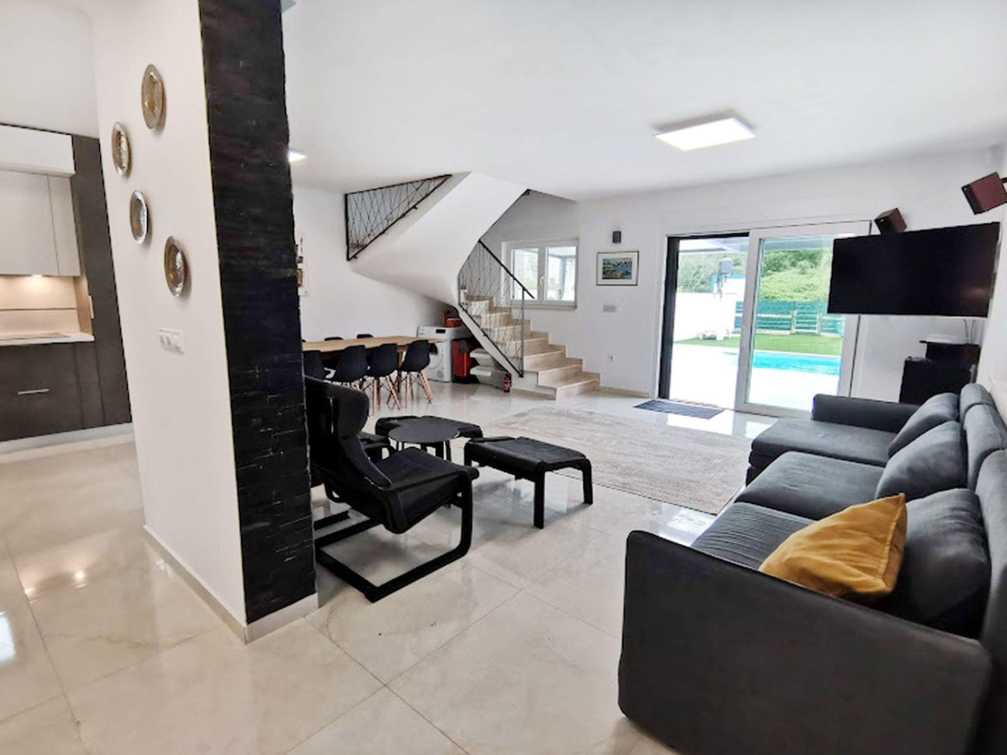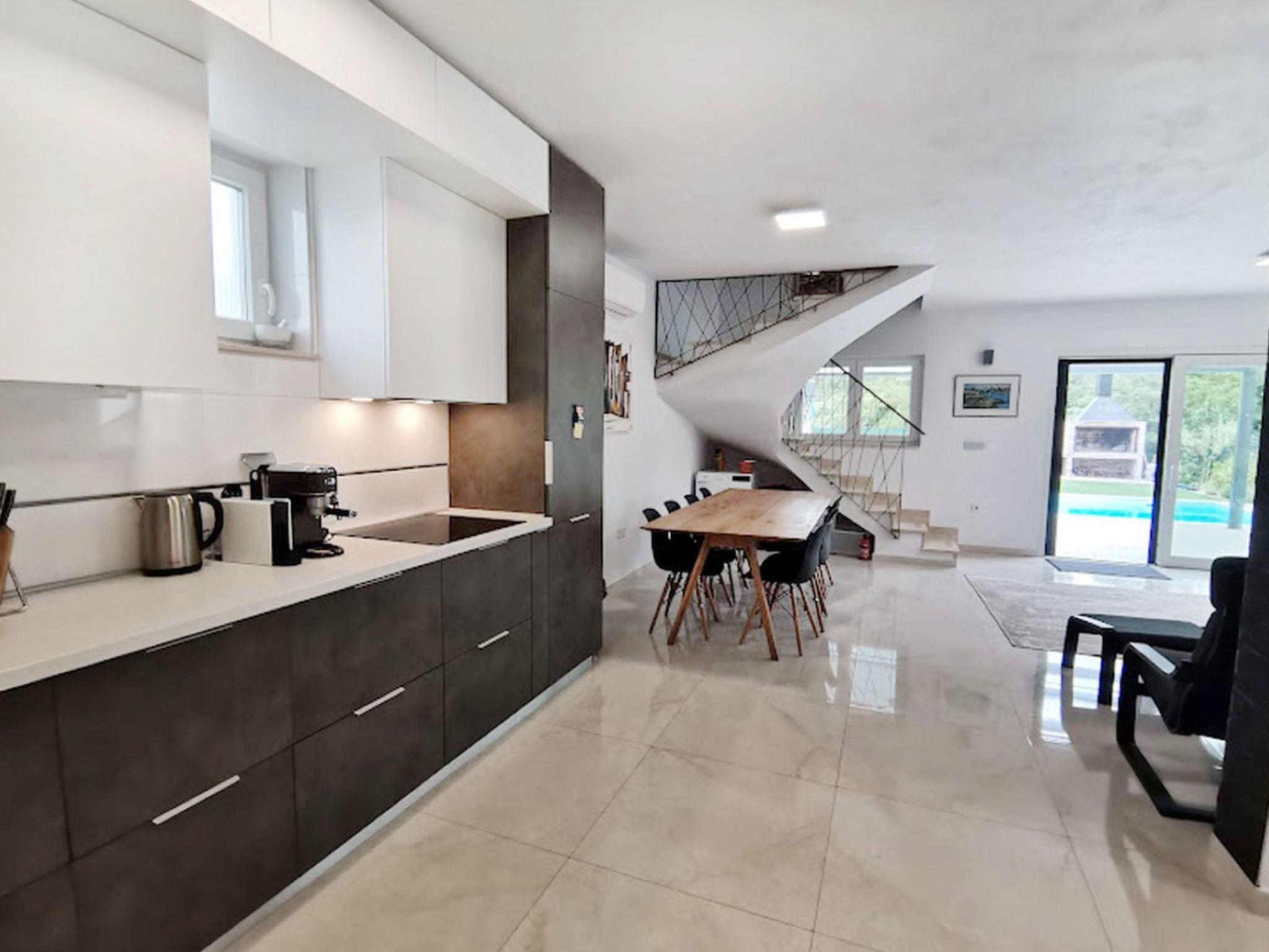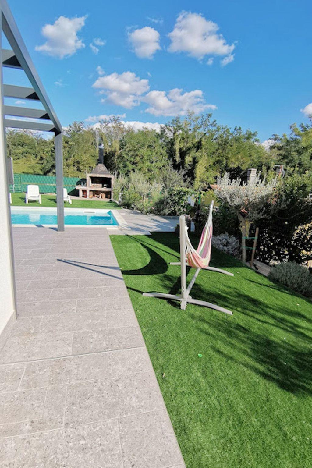 The idyllic setting continues outside: a spacious, covered terrace provides the perfect setting for morning breakfasts under the blue sky or evening socialising. The view of the well-tended garden, the private pool and the picturesque Istrian landscape makes every minute spent outdoors a pleasure. In addition, the nearby free car park facilitates your mobility during your stay.