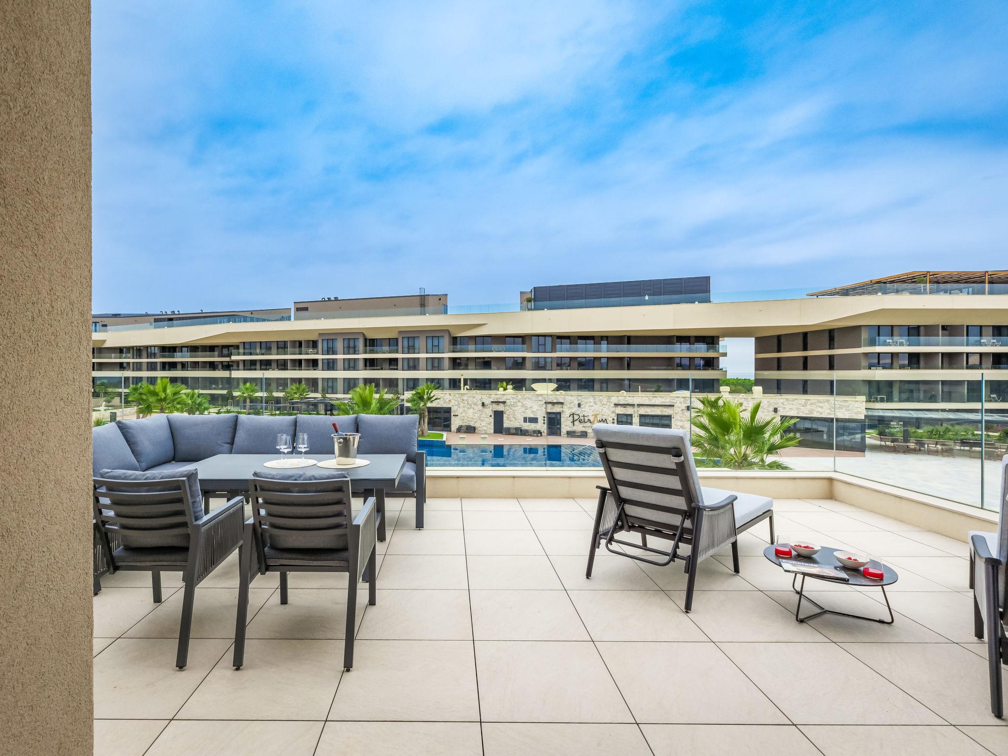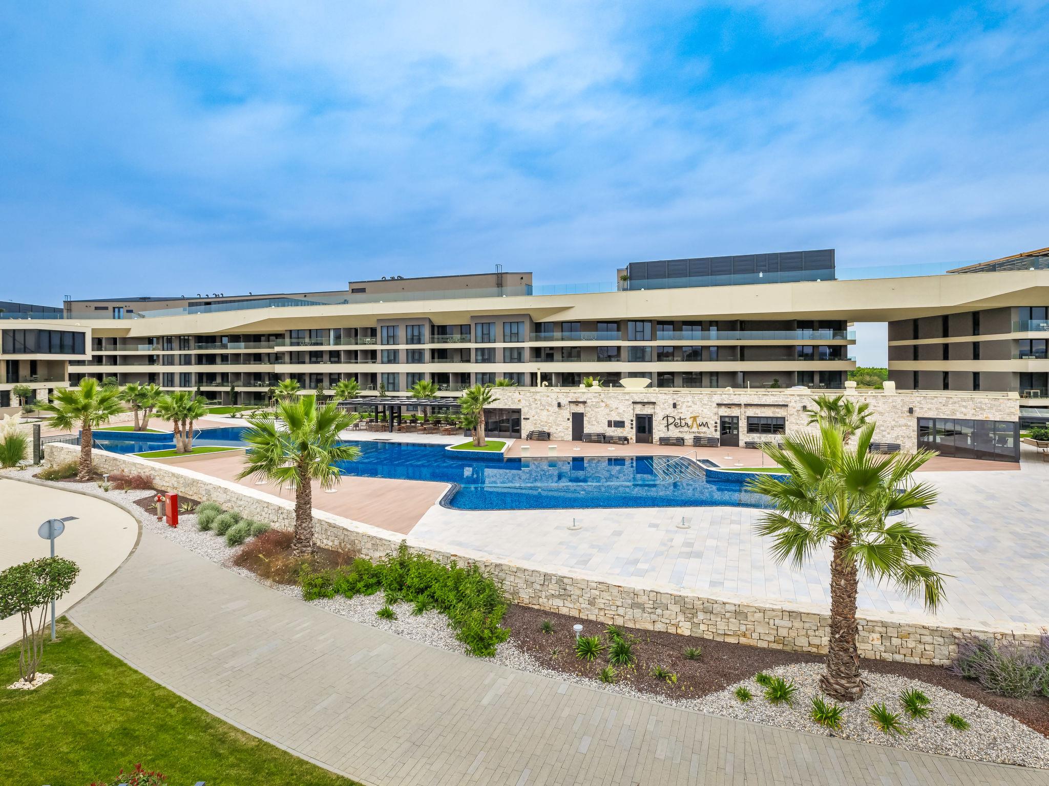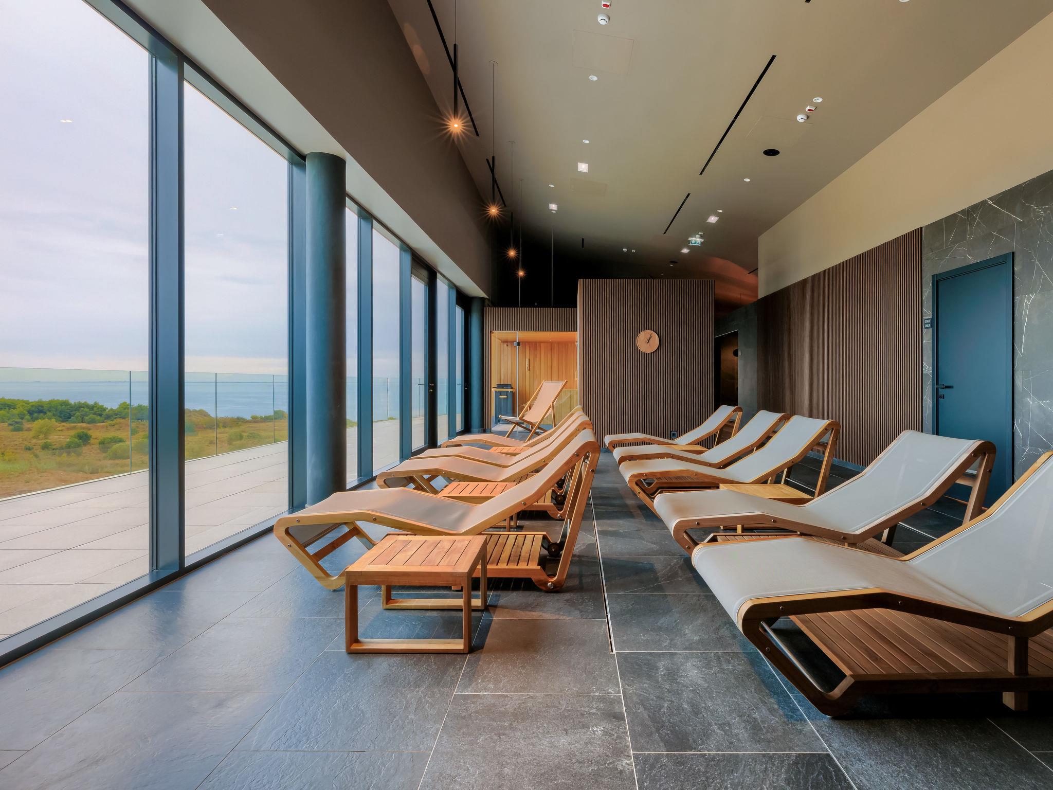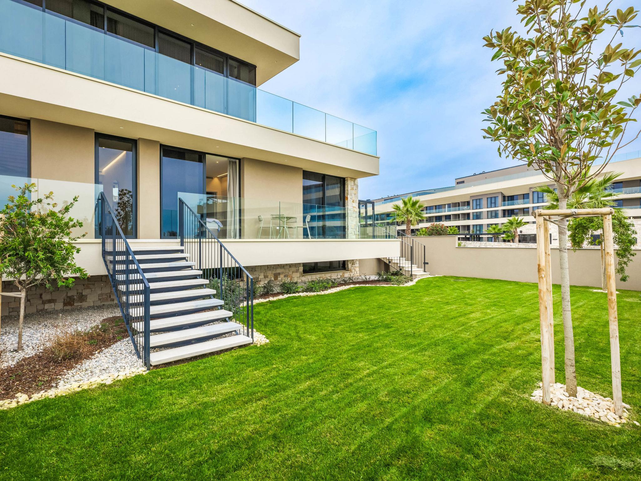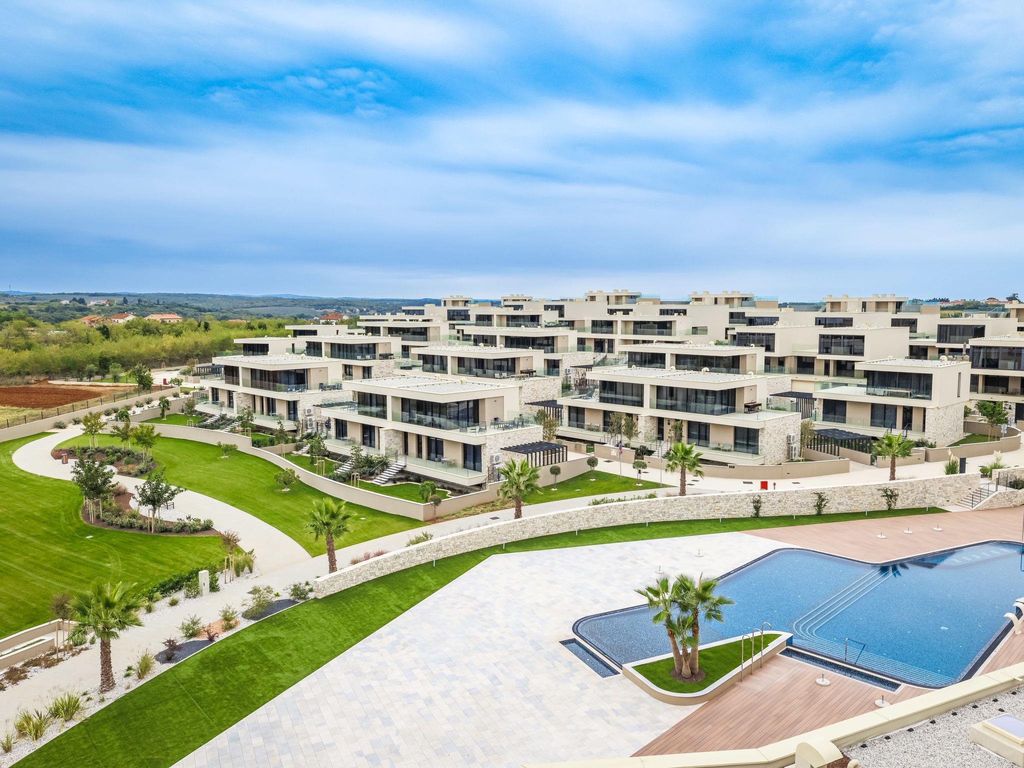Semi-detached house "Semi-detached Villas Crveni vrh", built in 2023. 1.5 km from the centre of Savudrija, 10 km from the centre of Umag, in a quiet position on a slope, residential area (villas), 500 m from the sea. For shared use: property with lawn, 2 swimming pools, indoor pool (105 m diameter, depth 50 - 140 cm, seasonal availability: 01.Jan. - 31.Dec.) with internal staircase. Unconventional pool shape. Shower/WC in the pool area, children's pool, tennis (extra), children's playground. Private: property (fenced). In the complex: reception, restaurant, bar, bistro, internet access, sauna, fitness room, massage (extra). Hot tub, relaxation room, spa area, playroom, shopping facilities, lift, sun terrace. Parking at the house on the premises. E-charging station. Shop 1 km, supermarket 10 km, bus stop 8 km, railway station 33 km, sandy beach 5 km pebble beach 2 km, rocky beach 500 m. Golf course (18 hole) 2 km, tennis 500 m, walking paths from the house 100 m. Please note: 24hr guard. The photograph shows a typical example. Neighbourhood highly sensitive to noise. Quietness and good behaviour expected.