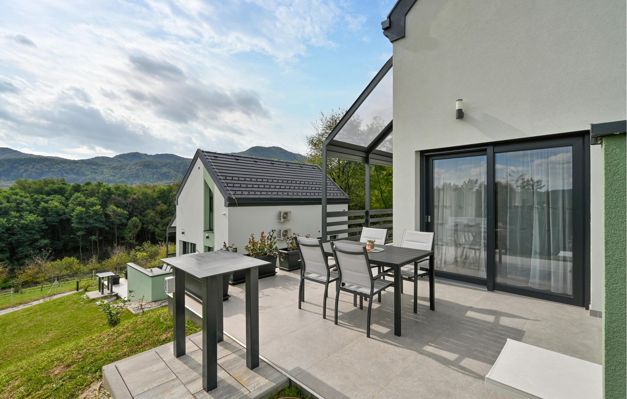 Udenfor er der både en overdækket og åben terrasse, hvor I kan nyde den vidunderlige udsigt over den omkringliggende grønne natur. Det er også et oplagt spot, når morgenkaffen skal nydes.