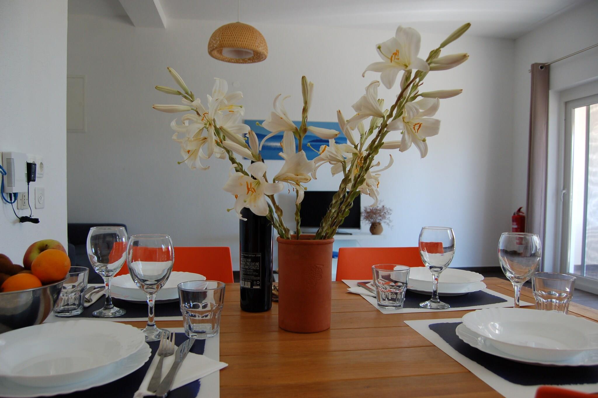 Stueetage: (Stue(dobbeltsovesofa, Fjernsyn(fladskærm)), Køkken(spisebord, elkedel, komfur, kaffemaskine, mikrobølgeovn, køle-fryseskab), soveværelse(dobbeltseng eller 2 enkeltsenge Senge), Soveværelse med badeværelse(dobbeltseng, bruser, håndvask, toilet), badeværelse(bruser, håndvask, toilet), tagterrasse) udekøkken(deles med ejer og andre gæster), grill, klimaanlæg, baggård, havemøbler, grill, parkering, liggestole, Parasol, aflåseligt skab