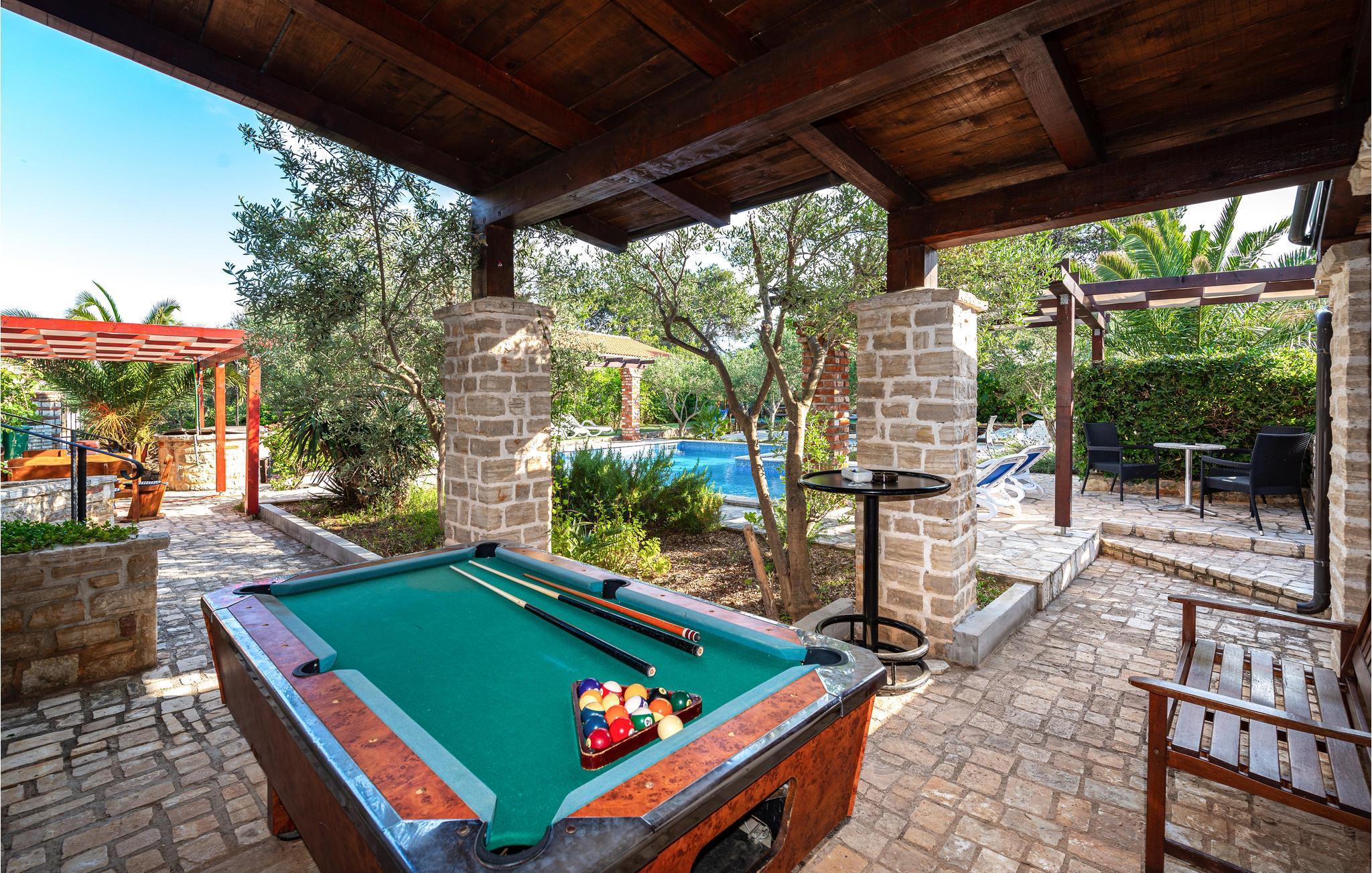 Dette rummelige og komfortabelt indrettede feriehus på øen Vir, ligger nær byen af samme navn. Bygningen består af en enhed i to etager med fem soveværelser og tre andre appartementer med separat indgang og egne terrasser. Se frem til at slappe af ved poolen der ligger i haven som har en mediterran charme. Vil I prøve at svømme i Adriaterhavet, så er der kun ca. 450 meter til den nærmeste kiesstrand. Øen Vir er forbundet med bro til fastlandet, her er dejligt uberørt natur og mange ensomme og fredelige badebugter. Besøg også den interessante by Zadar med både historiske og moderne seværdigheder, samt Nin med en skøn historisk bydel og Dronningestranden med sit helende mudder. Huset har 8 klimaanlæg, hvoraf 7 kan bruges mod et ekstra gebyr (de har en tæller, så strømforbruget kan beregnes).